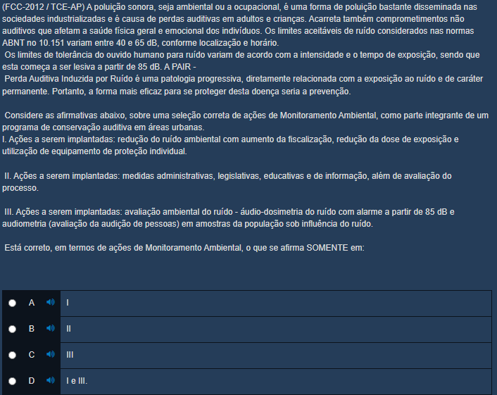 (FCC-2012 / TCE-AP) A poluição sonora, seja ambiental ou a ocupacional, é uma forma de poluição bastante disseminada nas sociedades industrializadas e é causa de perdas auditivas em adultos e crianças. Acarreta também comprometimentos não auditivos que afetam a saúde física geral e emocional dos indivíduos. Os limites aceitáveis de ruído considerados nas normas ABNT no 10.151 variam entre 40 e 65 dB, conforme localização e horário. Os limites de tolerância do ouvido humano para ruído variam de acordo com a intensidade e 0 tempo de exposição, sendo que esta começa a ser lesiva a partir de 85 dB. A PAIR Perda Auditiva Induzida por Ruído é uma patologia progressiva, diretamente relacionada com a exposição ao ruído e de caráter permanente. Portanto, a forma mais eficaz para se proteger desta doença seria a prevenção. Considere as afirmativas abaixo, sobre uma seleção correta de ações de Monitoramento Ambiental, como parte integrante de um programa de conservação auditiva em áreas urbanas. Ações a serem implantadas: redução do ambiental com aumento da fiscalização, redução da dose de exposição e utilização de equipamento de proteção individual. II. Ações a serem implantadas: medidas administrativas, legislativas, educativas e de informação, além de avaliação do processo. III. Ações a serem implantadas: avaliação ambiental do áudio-dosimetria do ruido com alarme a partir de 85 dB e audiometria (avaliação da audição de pessoas) em amostras da população sob influência do ruído. Esta correto, em termos de ações de Monitoramento Ambiental, 0 que se afirma SOMENTE em: A B II C III D