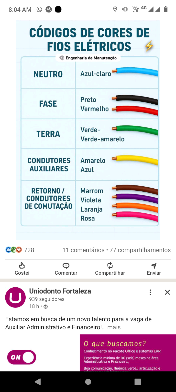 8:04 AM AA 4G LTE CÓDIGOS DE CORES DE FIOS ELÉTRICOS Engenharia de Manutenção NEUTRO Azul-claro Preto FASE Vermelho Verde- TERRA Verde-amarelo CONDUTORES Amarelo AUXILIARES Azul RETORNO / Marrom CONDUTORES Violeta DE COMUTAÇÃO Laranja Rosa 728 11 comentários 77 compartilhamentos Gostei Comentar Compartilhar Enviar Uniodonto Fortaleza X 939 seguidores Estamos em busca de um novo talento para a vaga de Auxiliar Administrativo e Financeiro!... mais que buscamos? Conhecimento no Pacote Office e sistemas ERP; ON Experiência mínima de 06 (seis) meses na área Administrativa e Boa comunicação, fluência verbal, articulação e