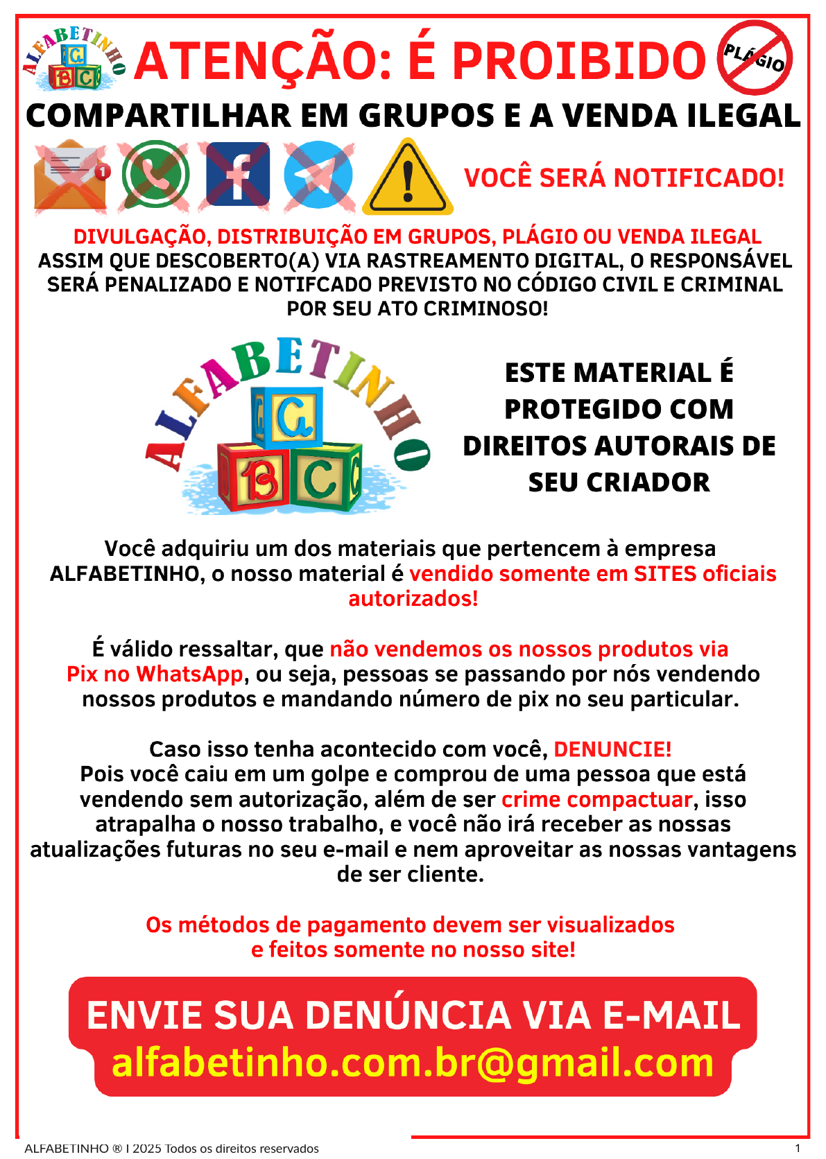 ALFABETINHO ® I 2025 Todos os direitos reservados 1 Conteúdo licenciado para Júnior Nunes Duarte - 060.705.862-55 ALFABETINHO ® I 2025 Todos os direitos reservados 2 Conteúdo licenciado para Júnior Nunes Duarte - 060.705.862-55 ALFABETINHO ® I 2025 Todos os direitos reservados 3 Conteúdo licenciado para Júnior Nunes Duarte - 060.705.862-55 ALFABETINHO ® I 2025 Todos os direitos reservados 4 Conteúdo licenciado para Júnior Nunes Duarte - 060.705.862-55 ALFABETINHO ® I 2025 Todos os direitos reservados 5 PROFESSOR(a): ESCOLA: PRÁTICAS DE LINGUAGEM Oralidade Principais conceitos: A prática de linguagem ‘Oralidade’ refere-se à habilidade de se comunicar verbalmente de forma clara e eficaz em diferentes contextos, como conversas, apresentações e narrativas. Essa prática é fundamental para o desenvolvimento da expressão oral e da interação social. Objetivos: Os objetivos incluem aprimorar a capacidade de expressar ideias de maneira organizada, promover a escuta ativa e a participação em interações orais, e desenvolver a confiança dos alunos ao falar em público. Eixo de integração: O eixo "Oralidade" (EF03LP15) enfatiza a importância da comunicação oral no processo de aprendizagem, permitindo que os alunos desenvolvam suas habilidades de argumentação e reflexão por meio da fala. OBJETOS DE CONHECIMENTO BASES DO PROCESSO EDUCATIVO Produção de texto oral O objeto de conhecimento "Produção de texto oral" refere-se à habilidade de organizar e apresentar informações de forma clara e estruturada. Isso inclui: • Produção: Compreender a importância de planejar a fala, definindo uma introdução, desenvolvimento e conclusão em uma apresentação oral. Recepção: Analisar como a estrutura e a clareza na produção oral facilitam a compreensão do público durante uma apresentação. • A relação entre professor e aluno: Fundamental para apoiar o desenvolvimento das habilidades de comunicação oral, criando um ambiente seguro para a expressão. • O contexto cultural: Relacionar as atividades de oralidade à realidade dos alunos promove identificação e relevância no aprendizado. • A metodologia ativa: Estimula a participação dos alunos através de atividades práticas, como debates, contação de histórias e dramatizações. • A avaliação formativa: Acompanha o progresso dos alunos nas habilidades de oralidade, permitindo ajustes nas práticas pedagógicas, em conformidade com o código EF03LP15. HABILIDADES BNCC 2025 (EF03LP15) Assistir, em vídeo digital, a programa de culinária infantil e, a partir dele, planejar e produzir receitas em áudio ou vídeo. LÍNGUA PORTUGUESA – 3º ANO Conteúdo licenciado para Júnior Nunes Duarte - 060.705.862-55 ALFABETINHO ® I 2025 Todos os direitos reservados 6 DESENVOLVIMENTOS • Contação de Histórias: Iniciar com a leitura de histórias e contos, promovendo discussões sobre os personagens e enredos. Os alunos devem ouvir e refletir sobre como as histórias são construídas. • Identificação de Elementos da Narrativa: Incentivar os alunos a identificarem os principais elementos da narrativa (início, meio e fim) nas histórias lidas. METODOLOGIAS ATIVA • Roda de Leitura: Realizar uma roda de leitura onde os alunos compartilham suas histórias favoritas. • Teatro de Fantoches: Usar fantoches para dramatizar partes das histórias, permitindo que os alunos explorem diferentes personagens. ATIVIDADES • Desenho e Contação: Após ouvir uma história, os alunos desenham uma cena e a contam para a turma. • Criação de Histórias: Incentivar os alunos a criarem suas próprias histórias e contá-las em sala. RECURSOS DIDÁTICOS • Livros de Histórias: Utilizar uma seleção de livros infantis variados para leitura. • Materiais para Fantoches: Fornecer materiais para a criação de fantoches, incentivando a dramatização. AVALIAÇÃO • Participação nas Atividades: Avaliar a participação dos alunos nas atividades de contação e discussão. • Qualidade das Contações: Observar a clareza e a expressividade dos alunos ao contar suas histórias. INTERDISCIPLINARIDADE • Artes: Integrar atividades de artes visuais com o desenho de cenas das histórias. DURAÇÃO DAS AULAS • As aulas terão 50 minutos DIVERSIDADE E INCLUSÃO • Apoio a Alunos com Dificuldades: Fornecer suporte a alunos que necessitam de mais tempo ou ajuda durante as atividades de contação. • Valorização de Diferentes Histórias: Escolher histórias que representem diversas culturas e tradições. • Ambiente Respeitoso: Fomentar um espaço onde todas as vozes sejam ouvidas e respeitadas. INTERAÇÃO COM AS FAMÍLIAS • Incentivar Contação em Casa: Sugerir que os pais leiam histórias para seus filhos em casa e os incentivem a contar também. • Comunicação Regular: Enviar boletins informativos sobre as histórias que estão sendo trabalhadas em sala. 1º BIMESTRE TEMA DO BIMESTRE: Contação de Histórias: Introdução à Produção Oral Conteúdo licenciado para Júnior Nunes Duarte - 060.705.862-55 ALFABETINHO ® I 2025 Todos os direitos reservados 7 DESENVOLVIMENTOS • Leitura de Entrevistas: Introduzir o formato de entrevistas, lendo exemplos com os alunos e discutindo sua estrutura. • Planejamento de Entrevistas: Os alunos planejam suas próprias entrevistas, decidindo sobre quem entrevistar e quais perguntas fazer. METODOLOGIAS ATIVA • Leitura de Entrevistas: Introduzir o formato de entrevistas, lendo exemplos com os alunos e discutindo sua estrutura. • Planejamento de Entrevistas: Os alunos planejam suas próprias entrevistas, decidindo sobre quem entrevistar e quais perguntas fazer. ATIVIDADES • Registro de Entrevistas: Criar um caderno de entrevistas onde os alunos registram suas conversas. • Apresentação das Entrevistas: Organizar uma apresentação onde os alunos compartilham suas entrevistas com a turma. RECURSOS DIDÁTICOS • Exemplos de Entrevistas: Utilizar livr