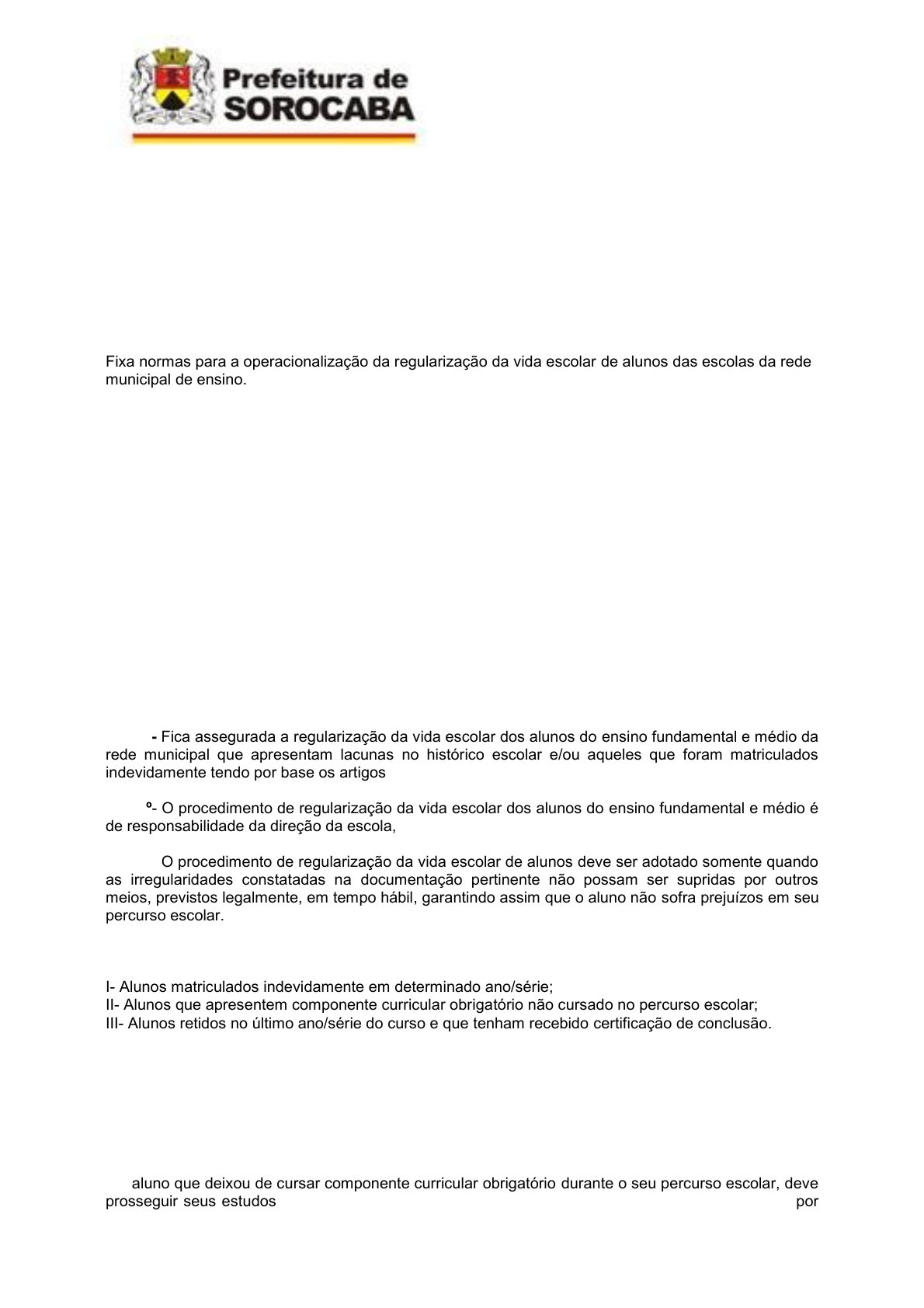 Conselho Municipal de Educação RESOLUÇÃO SEDU/GS Nº 21/2013, de 25 de setembro de 2013 Homologa, com fundamento no artigo 7º da lei no. 4.574, de 19/07/1994, e Lei Municipal nº 6.754, de 22/11/2002, a Indicação nº 01/2013 e a Deliberação 01/2013, de 03 de setembro de 2013, aprovadas em Sessão Plenária do Conselho Municipal de Educação, realizada em 03 de setembro de 2013. José Simões de Almeida Junior Secretário da Educação Deliberação CME 01 de 03 de setembro de 2013. Fixa normas para a operacionalização da regularização da vida escolar de alunos das escolas da rede municipal de ensino. O Conselho Municipal de Educação, no uso das atribuições legais que lhe são conferidas pela Lei Municipal nº 4574, de 19 de julho de 1994, alterada pela 6754/2002 e, considerando: • os princípios estabelecidos pela Lei Federal nº 9394/96, Lei de Diretrizes e Bases da Educação Nacional, em especial, o artigo 3º que valoriza a experiência extra-escolar e a vinculação entre educação escolar, o trabalho e as práticas sociais e os artigos 23 e 24 que tratam da organização da educação básica; • o Parecer CNE/CEB nº 7/2010 e Resolução CNE/CEB nº 4/2010, que define as Diretrizes Curriculares Nacionais Gerais para a Educação Básica condicionando a interpretação e a aplicação da legislação educacional ao processo pedagógico e ao direito à educação com qualidade social assegurada pelo ingresso, inclusão, permanência e sucesso na escola, com a consequente redução da evasão, da retenção e das distorções de idade/ano/série; • a Deliberação CME nº 2 de 26/10/99 e a Indicação CME nº 3 de 26/10/99, que fixam normas sobre a operacionalização da avaliação pela escola para classificação e reclassificação de alunos nas escolas da rede municipal de ensino; e • a necessidade de estabelecer procedimentos comuns para o correto registro da regularização da vida escolar de alunos da rede municipal. Delibera: Art. 1º- Fica assegurada a regularização da vida escolar dos alunos do ensino fundamental e médio da rede municipal que apresentam lacunas no histórico escolar e/ou aqueles que foram matriculados indevidamente tendo por base os artigos 3º, 22, 23 e 24 da Lei 9394/96. Art. 2º- O procedimento de regularização da vida escolar dos alunos do ensino fundamental e médio é de responsabilidade da direção da escola, sob orientação desta deliberação. Art. 3º- O procedimento de regularização da vida escolar de alunos deve ser adotado somente quando as irregularidades constatadas na documentação pertinente não possam ser supridas por outros meios, previstos legalmente, em tempo hábil, garantindo assim que o aluno não sofra prejuízos em seu percurso escolar. Art. 4º - A regularização da vida escolar, respeitado o disposto no artigo 3º, ocorrerá nas seguintes situações: I- Alunos matriculados indevidamente em determinado ano/série; II- Alunos que apresentem componente curricular obrigatório não cursado no percurso escolar; III- Alunos retidos no último ano/série do curso e que tenham recebido certificação de conclusão. Art. 5º- Para as situações previstas no artigo anterior deverão ser adotados os seguintes procedimentos: I – Aluno matriculado indevidamente em determinado ano/série: a) aluno matriculado em ano/série não correspondente ao que deveria cursar, deve ser mantido no mesmo ano/série, desde que não represente retrocesso no seu percurso escolar; b) aluno matriculado em ano/série anterior ao que deveria cursar, deve ser realizado o processo de reclassificação, sem prejuízo da avaliação da aprendizagem; II – aluno que deixou de cursar componente curricular obrigatório durante o seu percurso escolar, deve prosseguir seus estudos, cabendo à escola oferecer condições para suprir as suas necessidades por ccalmeida Realce ccalmeida Realce ccalmeida Realce ccalmeida Realce ccalmeida Realce ccalmeida Realce ccalmeida Realce Conselho Municipal de Educação meio de recuperação contínua, paralela ou de outros mecanismos que possa adotar de acordo com sua proposta pedagógica; III- aluno retido no último ano/série do curso e que tenha recebido certificação de conclusão: a) se decorridos mais de 03 (três) anos da conclusão do curso, o aluno terá direito à certificação, por prevalecer a prescrição aquisitiva; b) se transcorridos menos de 03 (três) anos da conclusão do curso, o aluno terá direito à certificação desde que atendidas as seguintes condições: 1- comprove-se, por meio de procedimento administrativo legal devidamente apurado, não ter havido ação de má-fé; 2- comprove-se ter havido a recuperação implícita pela aprendizagem adquirida com base nos conhecimentos elementares necessários à conclusão do ensino fundamental ou médio, por meio de parecer conclusivo do conselho de série/classe . Art. 6º- O processo de regularização da vida escolar do aluno deve ser registrado, contendo a seguinte documentação: I – ofício encaminhado à supervisão de ensino com relatório do diretor de escola, contendo um breve histórico da situação e dos procedimentos que foram tomados para a regularização de vida escolar; II – anexos dos documentos relativos à regularização da vida escolar, incluindo documentos escolares, se houver, e documentos pessoais; III- termo de anuência do supervisor de ensino ao processo da regularização de vida escolar do aluno; IV – portaria de regularização da vida escolar do aluno homologada pelas diretorias de áreas educacional e pedagógica, devidamente publicada no órgão oficial da Prefeitura de Sorocaba; Art. 7º- A direção da escola, procedida a regularização da vida escolar do aluno, deverá manter arquivado em seu prontuário, cópia da documentação prevista no artigo 6º. Art. 8º- No histórico escolar do aluno deverá constar o número desta deliberação. Art. 9º - A regularização de vida e