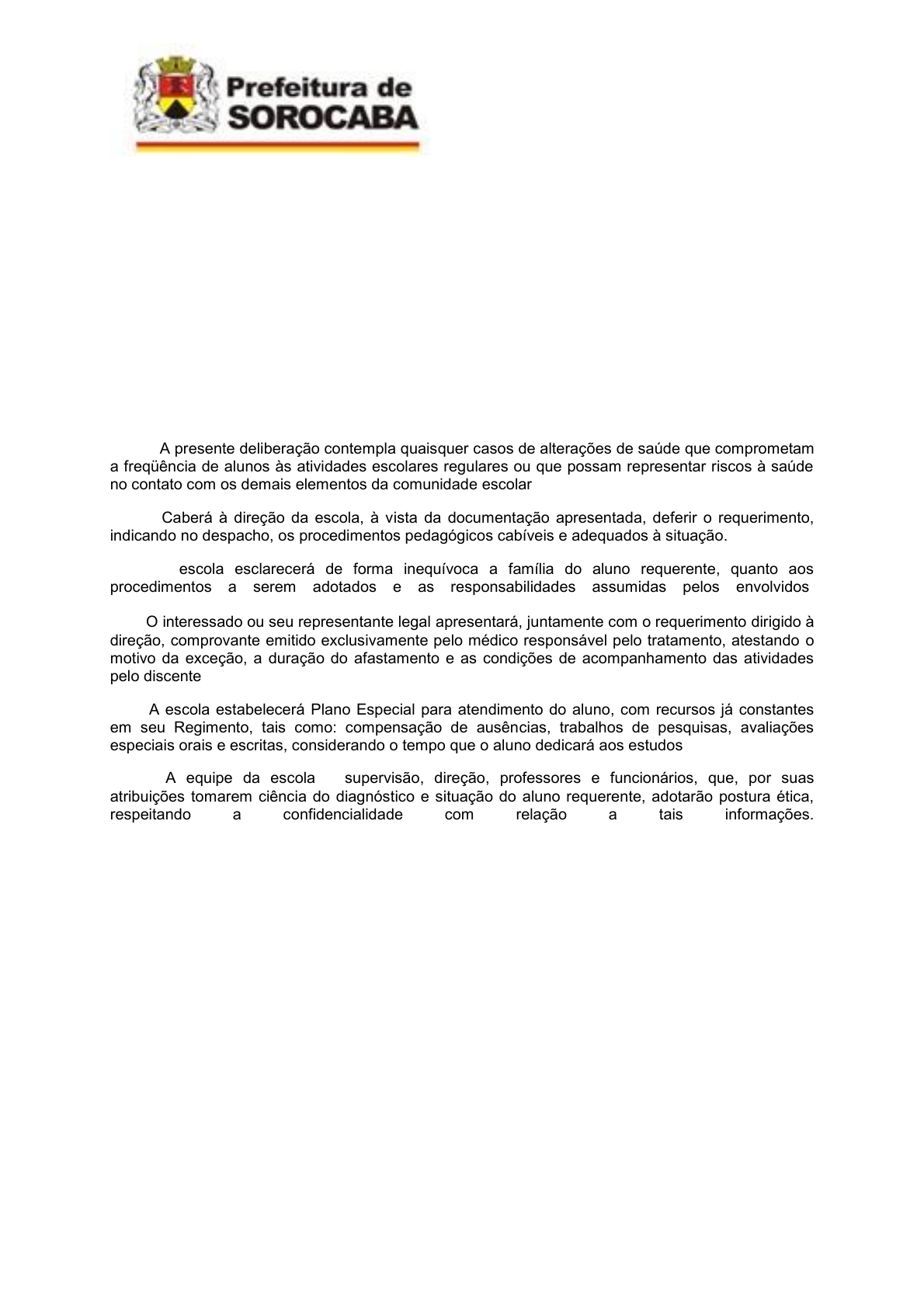 Conselho Municipal de Educação RESOLUÇÃO SEDU/GS Nº 23, de 25 de abril de 2007 Homologando com fundamento no artigo 7º da Lei 4574/94, de 19/07/94, e Lei Municipal nº 6754, de 22/11/2002, a Deliberação CME 01/2007, aprovada em Sessão Plenária do Conselho Municipal de Educação, realizada em 27/03/2007. DELIBERAÇÃO CME Nº 01/2007 * Dispõe sobre o atendimento a alunos cujo estado de saúde recomende atividades especiais de aprendizagem e avaliação escolar. O Conselho Municipal de Educação de Sorocaba, no uso de suas atribuições legais, conferidas pela Lei Municipal nº 4.574, de 19 de julho de 1.994, alterada pela Lei nº 6.754, de 22 de novembro de 2002, com fundamento na Lei Federal nº 9.394/96 e considerando a Indicação CME nº 01/2007, aprovada em 27/03/2007, Delibera: Art.1º. A presente deliberação contempla quaisquer casos de alterações de saúde que comprometam a freqüência de alunos às atividades escolares regulares ou que possam representar riscos à saúde no contato com os demais elementos da comunidade escolar. Art.2º. Caberá à direção da escola, à vista da documentação apresentada, deferir o requerimento, indicando no despacho, os procedimentos pedagógicos cabíveis e adequados à situação. § 1º. A escola esclarecerá de forma inequívoca a família do aluno requerente, quanto aos procedimentos a serem adotados e as responsabilidades assumidas pelos envolvidos. § 2º. O interessado ou seu representante legal apresentará, juntamente com o requerimento dirigido à direção, comprovante emitido exclusivamente pelo médico responsável pelo tratamento, atestando o motivo da exceção, a duração do afastamento e as condições de acompanhamento das atividades pelo discente. § 3º. A escola estabelecerá Plano Especial para atendimento do aluno, com recursos já constantes em seu Regimento, tais como: compensação de ausências, trabalhos de pesquisas, avaliações especiais orais e escritas, considerando o tempo que o aluno dedicará aos estudos. Art.3º. A equipe da escola – supervisão, direção, professores e funcionários, que, por suas atribuições tomarem ciência do diagnóstico e situação do aluno requerente, adotarão postura ética, respeitando a confidencialidade com relação a tais informações. Parágrafo Único. Casos de recursos administrativos ou procedimentos judiciais observarão o disposto no caput deste. Art. 4º. Compete à direção da escola as providências para manter atualizados os registros escolares de cada caso, bem como a documentação comprobatória do motivo de exceção, colocando-os à disposição das autoridades educacionais competentes. Art.5º. A presente deliberação entrará em vigor a partir de sua publicação. Deliberação Plenária O Conselho Municipal de Educação aprova, por unanimidade, a presente Deliberação. Presentes os Conselheiros: Evaldo Teixeira Calado; Cláudio Roberto Silva; Edson Luis Resende; Lauri Lane Maria Holtz Leme; Odinir Furlani; Olga Maria Salati Marcondes de Moraes; Patrícia Banietti Rosa Pereira; Regina Maria Aparecida Maiello Alcoléa; Roseli Marli Laprano Zuliani; Valdelice Borghi Ferreira; Vânia Regina Boschetti. Sala do Plenário, em 27/03/2007. Valdelice Borghi Ferreira Presidente do CME * Publicada no DOM de 04/05/2007 .* Ver Indicação CME nº 01/2007. ccalmeida Realce ccalmeida Realce ccalmeida Realce ccalmeida Realce ccalmeida Realce ccalmeida Realce
