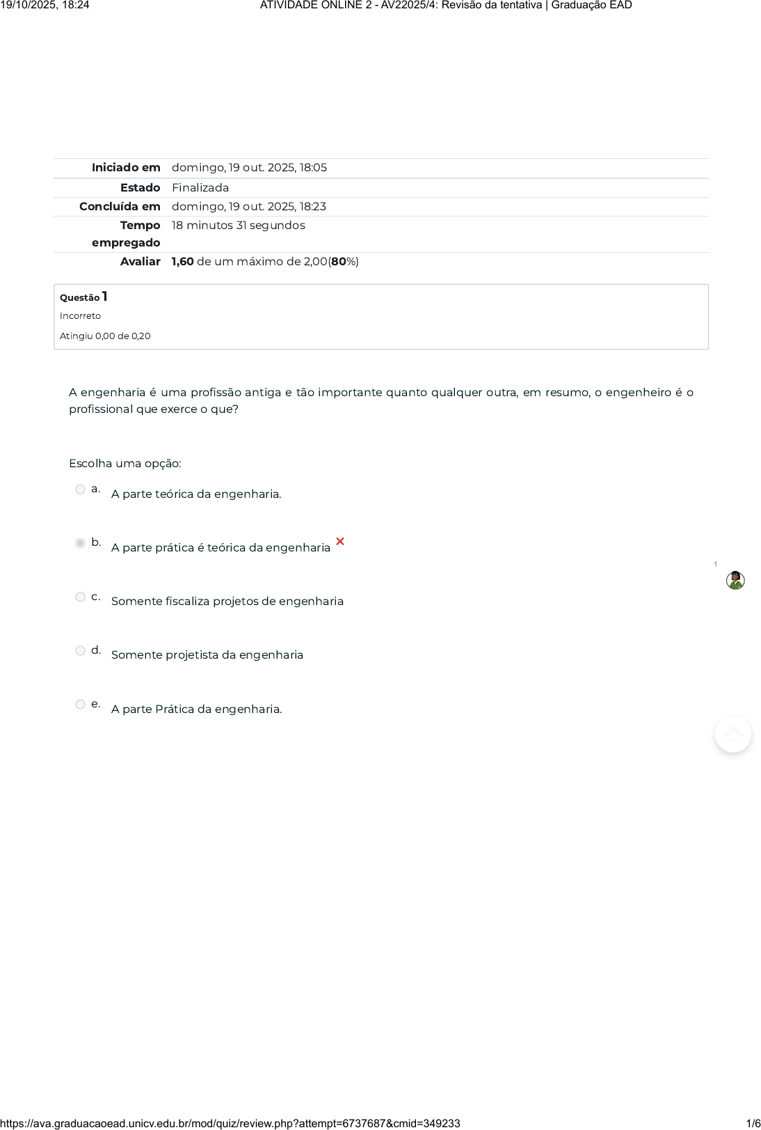 Iniciado em domingo, 19 out. 2025, 18:05 Estado Finalizada Concluída em domingo, 19 out. 2025, 18:23 Tempo empregado 18 minutos 31 segundos Avaliar 1,60 de um máximo de 2,00(80%) Questão 1 Incorreto Atingiu 0,00 de 0,20 A engenharia é uma profissão antiga e tão importante quanto qualquer outra, em resumo, o engenheiro é o profissional que exerce o que? Escolha uma opção: a. A parte teórica da engenharia. b. A parte prática é teórica da engenharia × c. Somente fiscaliza projetos de engenharia d. Somente projetista da engenharia e. A parte Prática da engenharia. 1 19/10/2025, 18:24 ATIVIDADE ONLINE 2 - AV22025/4: Revisão da tentativa | Graduação EAD https://ava.graduacaoead.unicv.edu.br/mod/quiz/review.php?attempt=6737687&cmid=349233 1/6 Questão 2 Correto Atingiu 0,20 de 0,20 Questão 3 Correto Atingiu 0,20 de 0,20 Uma das ações mais importante da engenharia é assinar um projeto somente quando for de tua autoria e quando você será o responsável pela obra. Por isso, e considerado antiético o ato de: Escolha uma opção: a. Cobrar pelo projeto b. Corrigir possíveis erros de projeto c. Assinar mais de um projeto d. Vender assinaturas ✓ e. Acompanhar toda a obra do projeto Precisamos criar e manter uma boa socialização entre os colegas da empresa para que assim tenhamos um local de trabalho agradável e harmonioso. Para conseguir isso, e necessário aplicar a: Escolha uma opção: a. Ética Profissional ✓ b. Ética Social c. Ética das virtudes d. Ética religiosa e. Ética de gênero 1 19/10/2025, 18:24 ATIVIDADE ONLINE 2 - AV22025/4: Revisão da tentativa | Graduação EAD https://ava.graduacaoead.unicv.edu.br/mod/quiz/review.php?attempt=6737687&cmid=349233 2/6 Questão 4 Correto Atingiu 0,20 de 0,20 Questão 5 Incorreto Atingiu 0,00 de 0,20 A engenharia ética leva em consideração todos os ambientes com destaque para a conservação do planeta De acordo com a frase a cima e possível afirmar que a engenharia ética deve respeitar o: Escolha uma opção: a. Desmatamento b. Seguir com os |impactos ambientais c. Aumento da Industrialização d. Desenvolvimento sustentável ✓ e. Continuidade da poluição ambiental A diversidade possui diversos benefícios, porém uma delas traz consigo um grau de importância muito cobiçado. Qual é ele?. Escolha uma opção: a. O aumento de produção b. Desenvolvimento c. A singularidade × d. O econômico e. A estabilidade 1 19/10/2025, 18:24 ATIVIDADE ONLINE 2 - AV22025/4: Revisão da tentativa | Graduação EAD https://ava.graduacaoead.unicv.edu.br/mod/quiz/review.php?attempt=6737687&cmid=349233 3/6 Questão 6 Correto Atingiu 0,20 de 0,20 Questão 7 Correto Atingiu 0,20 de 0,20 Para que uma indústria seja reconhecida como uma empresa socialmente responsável é necessário que ela tenha uma boa relação com um setor importante para a empresa. Qual é esse setor? Escolha uma opção: a. Os entregadores b. A gerencia c. A limpeza d. Os Fornecedores ✓ e. O Financeiro A troca entre as pessoas onde uma pode contribuir para o convívio da outra e chamado de: Escolha uma opção: a. Dependência b. Controle humano c. Subordinação d. Comprometimento e. Relação humana ✓ 1 19/10/2025, 18:24 ATIVIDADE ONLINE 2 - AV22025/4: Revisão da tentativa | Graduação EAD https://ava.graduacaoead.unicv.edu.br/mod/quiz/review.php?attempt=6737687&cmid=349233 4/6 Questão 8 Correto Atingiu 0,20 de 0,20 Questão 9 Correto Atingiu 0,20 de 0,20 Como podemos definir Diversidade em uma palavra? Escolha uma opção: a. Idêntico b. Comum c. Multiplicidade ✓ d. Igualdade e. Natural O juramento feito pelo profissional no momento da colação de grau, o qual promete exercer nada mais do que todas as atribuições a ele autorizadas com o devido dever, sem ultrapassar os limites exigidos, e considerado um: Escolha uma opção: a. Juramento Simbólico b. Juramento ético ✓ c. Juramento momentâneo d. Juramento apenas para determinados ramos da engenharia e. Juramento sem valor agregado 1 19/10/2025, 18:24 ATIVIDADE ONLINE 2 - AV22025/4: Revisão da tentativa | Graduação EAD https://ava.graduacaoead.unicv.edu.br/mod/quiz/review.php?attempt=6737687&cmid=349233 5/6 Questão 10 Correto Atingiu 0,20 de 0,20 O saber Ambiental problematiza o conhecimento fragmentado em disciplinas e a administração setorial do desenvolvimento, para constituir um campo de conhecimento teóricos e práticos orientado para a rearticulação das relações. Este intuito e entre a relação de quais áreas? Escolha uma opção: a. Sociedade e Natureza ✓ b. Natureza e Política c. Natureza e Economia d. Sociedade e Economia e. Sociedade e Política 1 19/10/2025, 18:24 ATIVIDADE ONLINE 2 - AV22025/4: Revisão da tentativa | Graduação EAD https://ava.graduacaoead.unicv.edu.br/mod/quiz/review.php?attempt=6737687&cmid=349233 6/6