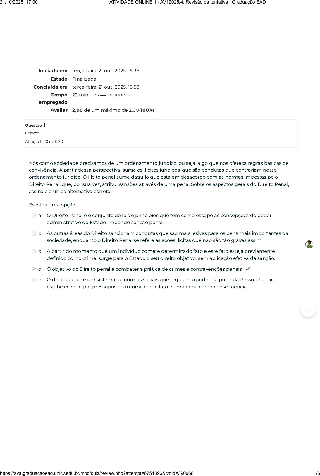 Iniciado em terça-feira, 21 out. 2025, 16:36 Estado Finalizada Concluída em terça-feira, 21 out. 2025, 16:58 Tempo empregado 22 minutos 44 segundos Avaliar 2,00 de um máximo de 2,00(100%) Questão 1 Correto Atingiu 0,20 de 0,20 Nós como sociedade precisamos de um ordenamento jurídico, ou seja, algo que nos ofereça regras básicas de convivência. A partir dessa perspectiva, surge os ilícitos jurídicos, que são condutas que contrariam nosso ordenamento jurídico. O ilícito penal surge daquilo que está em desacordo com as normas impostas pelo Direito Penal, que, por sua vez, atribui sansões através de uma pena. Sobre os aspectos gerais do Direito Penal, assinale a única alternativa correta: Escolha uma opção: a. O Direito Penal é o conjunto de leis e princípios que tem como escopo as concepções do poder administrativo do Estado, impondo sanção penal. b. As outras áreas do Direito sancionam condutas que são mais lesivas para os bens mais importantes da sociedade, enquanto o Direito Penal se refere às ações ilícitas que não são tão graves assim. c. A partir do momento que um indivíduo comete determinado fato e este fato esteja previamente definido como crime, surge para o Estado o seu direito objetivo, sem aplicação efetiva da sanção. d. O objetivo do Direito penal é combater a prática de crimes e contravenções penais. ✓ e. O direito penal é um sistema de normas sociais que regulam o poder de punir da Pessoa Jurídica, estabelecendo por pressupostos o crime como fato e uma pena como consequência. 1 21/10/2025, 17:00 ATIVIDADE ONLINE 1 - AV12025/4: Revisão da tentativa | Graduação EAD https://ava.graduacaoead.unicv.edu.br/mod/quiz/review.php?attempt=6751896&cmid=390968 1/6 Questão 2 Correto Atingiu 0,20 de 0,20 Questão 3 Correto Atingiu 0,20 de 0,20 O analista em políticas públicas, ao se debruçar nos processos de elaboração da política, bem como, na formulação da agenda, leva em consideração o estudo das decisões tomadas, a estrutura institucional e a distribuição de poder no Estado e na sociedade. Nas análises em políticas públicas é de extrema importância considerar questões sobre o papel do Estado na sociedade, bem como compreender a distribuição de poder entre grupos sociais. A este respeito, marque a única alternativa correta: Escolha uma opção: a. No processo de elaboração da agenda política não se torna necessário conhecer os interesses dos atores, pois isso é papel apenas dos governantes. Sendo assim, torna-se importante o processo de descrição do funcionamento das instituições privadas e das particularidades dessas instituições. b. No ciclo de políticas públicas, constituído pela necessidade de se trabalhar as “fases de políticas”, não é incluído o processo de elaboração da agenda, pois os temas que entrarão na agenda política sempre serão convertidos em políticas públicas. c. Não será incumbência do analista compreender a política e o sistema em que a mesma está inserida a partir do estudo sobre a construção da política pública, mas sim apenas elaborar a agenda política. d. A análise oportuniza a compreensão dos processos e as determinantes do desenvolvimento das políticas públicas, além de possibilitar a identificação dos fatores e dos processos reais envolvidos nos critérios de investigação dessas políticas. ✓ e. As análises de políticas públicas são fatores determinantes para a explicação do funcionamento do sistema político e somente o analista possui autorização para aprovar recursos e indicar os modos de interação dos atores e instituições nos processos políticos. O Estado possui funções que buscam o interesse coletivo e o bem comum, para que assim possa atender a população, ou seja, a sociedade em geral. As funções podem são exercidas pelo Governo e pela Administração Pública. Estes são componentes do Estado que desempenham funções específicas e fazem parte do que chamamos de Estado. A respeito dos componentes do Estado, marque a única alternativa correta: Escolha uma opção: a. O Governo tem um papel de dependência, uma característica que propicia o surgimento de uma outra característica denominada aleatoriedade. b. Em relação à Administração Pública, a sua função é estabelecer e criar diretrizes. c. O Governo é constituído por um conjunto de órgãos, serviços e agentes do Estado que procuram satisfazer as necessidades da sociedade, tais como educação, cultura, segurança, saúde etc. d. Os poderes Legislativo e Judiciário, por fazerem parte do Estado, desempenham a função de Governo. e. O Governo exerce a chamada “função política do Estado”, que cumpre cargo de inovação, criação e comando, estabelecendo diretrizes. ✓ 1 21/10/2025, 17:00 ATIVIDADE ONLINE 1 - AV12025/4: Revisão da tentativa | Graduação EAD https://ava.graduacaoead.unicv.edu.br/mod/quiz/review.php?attempt=6751896&cmid=390968 2/6 Questão 4 Correto Atingiu 0,20 de 0,20 Questão 5 Correto Atingiu 0,20 de 0,20 A dimensão processual das políticas públicas concerne na produção de política iniciada primeiramente com a identificação de um problema e a construção de uma agenda. Sob esse aspecto, a tomada de decisão não é considerada o ponto de partida das políticas públicas, mas é precedida de ações e processos que irão construir o campo e o tema dessa política. A respeito da dimensão processual das políticas públicas e da elaboração da agenda política, assinale a alternativa correta: Escolha uma opção: a. Todos os problemas podem ser facilmente inscritos na agenda política, sem necessariamente recorrer a um grau ou nível de preocupação. b. Para a inscrição de um problema na agenda é necessário que o problema esteja relacionado com o propósito de um único partido político. c. A elaboração do problema a ser incluído na agenda precisa partir de uma situação problemática de um grupo po