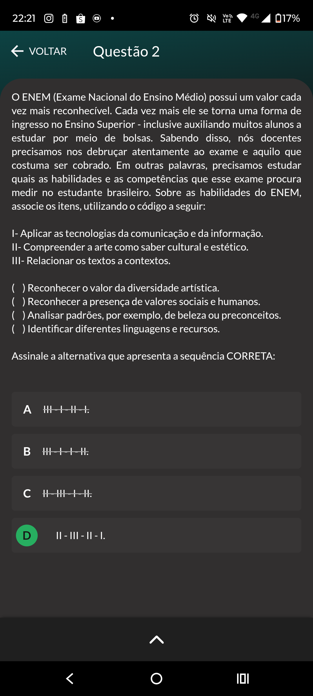 22:21 4G S LTE 17% VOLTAR Questão 2 ENEM (Exame Nacional do Ensino Médio) possui um valor cada vez mais reconhecível. Cada vez mais ele se torna uma forma de ingresso no Ensino Superior inclusive auxiliando muitos alunos a estudar por meio de bolsas. Sabendo disso, nós docentes precisamos nos debruçar atentamente ao exame e aquilo que costuma ser cobrado. Em outras palavras, precisamos estudar quais as habilidades e as competências que esse exame procura medir no estudante brasileiro. Sobre as habilidades do ENEM, associe os itens, utilizando o código a seguir: I- Aplicar as tecnologias da comunicação e da informação. II- Compreender a arte como saber cultural e estético. III- Relacionar os textos a contextos. Reconhecer o valor da diversidade artística. Reconhecer a presença de valores sociais e humanos. Analisar padrões, por exemplo, de beleza ou preconceitos. Identificar diferentes linguagens e recursos. Assinale a alternativa que apresenta a sequência CORRETA: A + c D