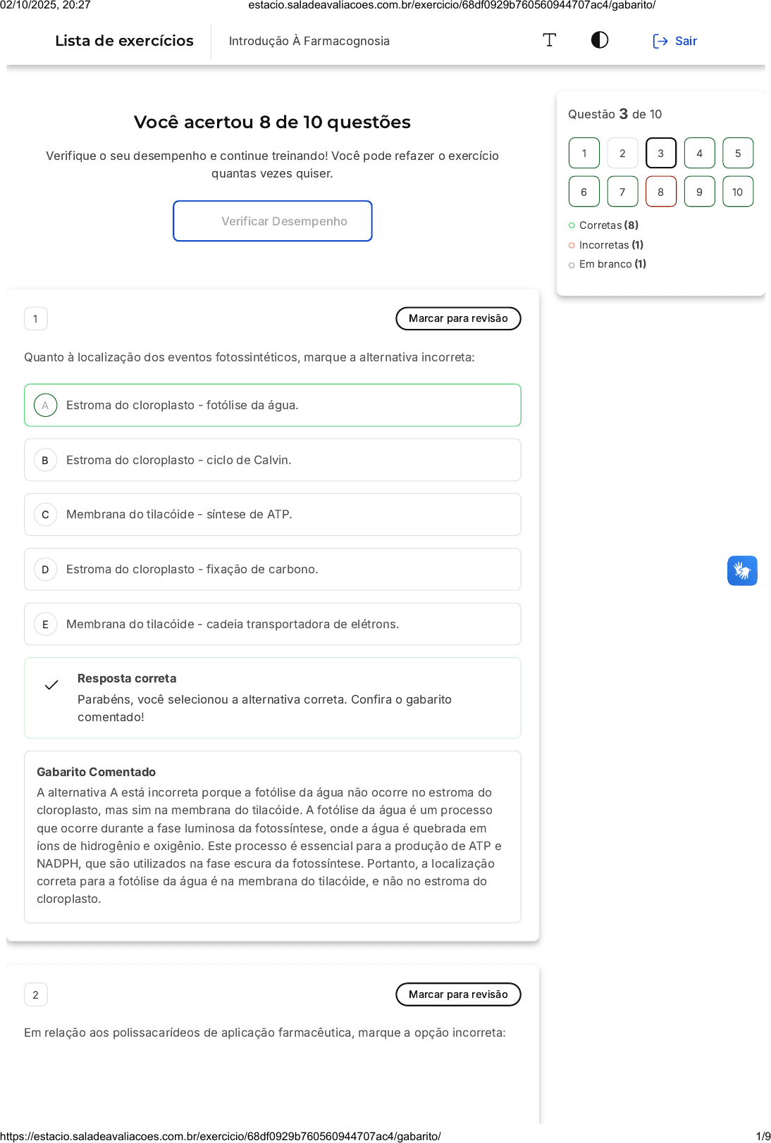 Você acertou 8 de 10 questões Verifique o seu desempenho e continue treinando! Você pode refazer o exercício quantas vezes quiser. Verificar Desempenho A B C D E 1 Marcar para revisão Quanto à localização dos eventos fotossintéticos, marque a alternativa incorreta: Estroma do cloroplasto - fotólise da água. Estroma do cloroplasto - ciclo de Calvin. Membrana do tilacóide - síntese de ATP. Estroma do cloroplasto - fixação de carbono. Membrana do tilacóide - cadeia transportadora de elétrons. Resposta correta Parabéns, você selecionou a alternativa correta. Confira o gabarito comentado! Gabarito Comentado A alternativa A está incorreta porque a fotólise da água não ocorre no estroma do cloroplasto, mas sim na membrana do tilacóide. A fotólise da água é um processo que ocorre durante a fase luminosa da fotossíntese, onde a água é quebrada em íons de hidrogênio e oxigênio. Este processo é essencial para a produção de ATP e NADPH, que são utilizados na fase escura da fotossíntese. Portanto, a localização correta para a fotólise da água é na membrana do tilacóide, e não no estroma do cloroplasto. 2 Marcar para revisão Em relação aos polissacarídeos de aplicação farmacêutica, marque a opção incorreta: Questão 3 de 10 Corretas (8) Incorretas (1) Em branco (1) 1 2 3 4 5 6 7 8 9 10 Lista de exercícios Introdução À Farmacognosia Sair 02/10/2025, 20:27 estacio.saladeavaliacoes.com.br/exercicio/68df0929b760560944707ac4/gabarito/ https://estacio.saladeavaliacoes.com.br/exercicio/68df0929b760560944707ac4/gabarito/ 1/9 A B C D E O amido é um polissacarídeo de glicose empregado como emoliente, desagregante nas formulações de comprimidos, e para a obtenção química das dextrinas e de polióis. As gomas são carboidratos complexos produzidos por algumas plantas, sendo consideradas produtos patológicos resultantes de uma ação física sofrida pelos tecidos. Os pró-bióticos, que são frutooligossacarídeos (FOS) contendo de 3 a 10 monossacarídeos de frutose, são usualmente encontrados ligados a uma molécula inicial de glicose e agem como as fibras não digeríveis. As mucilagens, amplamente distribuídas nos vegetais, apresentam natureza mista constituída por heteropolissacarídeos ácidos e/ou neutros, substâncias fenólicas e proteínas. Elas são rígidas quando estão secas, e tornam-se pegajosas quando úmidas. Os monômeros de glicose podem gerar dois tipos de polissacarídeos amido: a amilose e amilopectina. A amilose possui uma cadeia longa de resíduos de D- glicose, com ligações glicosídicas (α1 → 4) e a amilopectina possui cadeia com ligações glicosídicas (α1 → 4), porém nos pontos de ramificações, que ocorrem de 20 a 34 resíduos, tem ligações (α1 → 6). Questão não respondida Opa! A alternativa correta é a letra C. Confira o gabarito comentado! Gabarito Comentado A alternativa C está incorreta. Os pró-bióticos são microorganismos vivos que, quando administrados em quantidades adequadas, conferem benefícios à saúde do hospedeiro. Eles não são frutooligossacarídeos (FOS), mas sim bactérias benéficas. Os FOS, por outro lado, são um tipo de carboidrato não digerível que serve como alimento para os pró-bióticos. Portanto, a afirmação de que os pró-bióticos são FOS é incorreta. 3 Marcar para revisão Com base nos conceitos sobre "droga" em Farmacognosia, avalie o esquema a seguir e marque a alternativa que contenha as correlações numéricas correspondes: 02/10/2025, 20:27 estacio.saladeavaliacoes.com.br/exercicio/68df0929b760560944707ac4/gabarito/ https://estacio.saladeavaliacoes.com.br/exercicio/68df0929b760560944707ac4/gabarito/ 2/9 A B C D E A B 1- Planta medicinal "in natura", 2- Droga vegetal, 3 - Fármacos e 4 - Medicamento 1- Fármacos, 2-Medicamento, 3 -Droga vegetal e 4 - Planta medicinal "in natura" 1- Planta medicinal "in natura", 2 - Droga vegetal, 3 - Medicamento e 4 - Fármacos. 1- Fármacos, 2 - Droga vegetal, 3 - Planta medicinal "in natura" e 4 - Medicamento. 1 - Droga vegetal, 2 - Fármacos, 3 - Planta medicinal "in natura" e 4 - Medicamento. Resposta correta Parabéns, você selecionou a alternativa correta. Confira o gabarito comentado! Gabarito Comentado 1- Planta medicinal "in natura", 2- Droga vegetal, 3 - Fármacos e 4 - Medicamento 4 Marcar para revisão Com base nos conceitos sobre droga e produto natural, marque a opção que contenha uma distinção e uma semelhança entre eles, respectivamente: Pode ter uma origem completamente sintética / possui atividade farmacológica ou biológica. Originalmente obtido de um organismo vivo / pode ter uma origem completamente sintética. 02/10/2025, 20:27 estacio.saladeavaliacoes.com.br/exercicio/68df0929b760560944707ac4/gabarito/ https://estacio.saladeavaliacoes.com.br/exercicio/68df0929b760560944707ac4/gabarito/ 3/9 C D E A B C D E Sofre processos de coleta, preparo e conservação / pode ter uma origem completamente sintética. Possui atividade farmacológica ou biológica / originalmente obtido de um organismo vivo. Pode ter uma origem completamente sintética / sofre processos de coleta, preparo e conservação. Resposta correta Parabéns, você selecionou a alternativa correta. Confira o gabarito comentado! Gabarito Comentado A alternativa correta é a letra A: "Pode ter uma origem completamente sintética / possui atividade farmacológica ou biológica". Isso significa que uma droga pode ser completamente sintetizada em laboratório, o que a distingue de um produto natural, que é obtido diretamente da natureza. No entanto, tanto a droga quanto o produto natural compartilham uma semelhança: ambos possuem atividade farmacológica ou biológica, ou seja, ambos têm a capacidade de interagir com o organismo e produzir algum tipo de efeito, seja ele terapêutico ou não. 5 Marcar para revisão Marque a alternativa que corresponda a uma localização de todo o processo fotossintético e uma diferença entre o proce