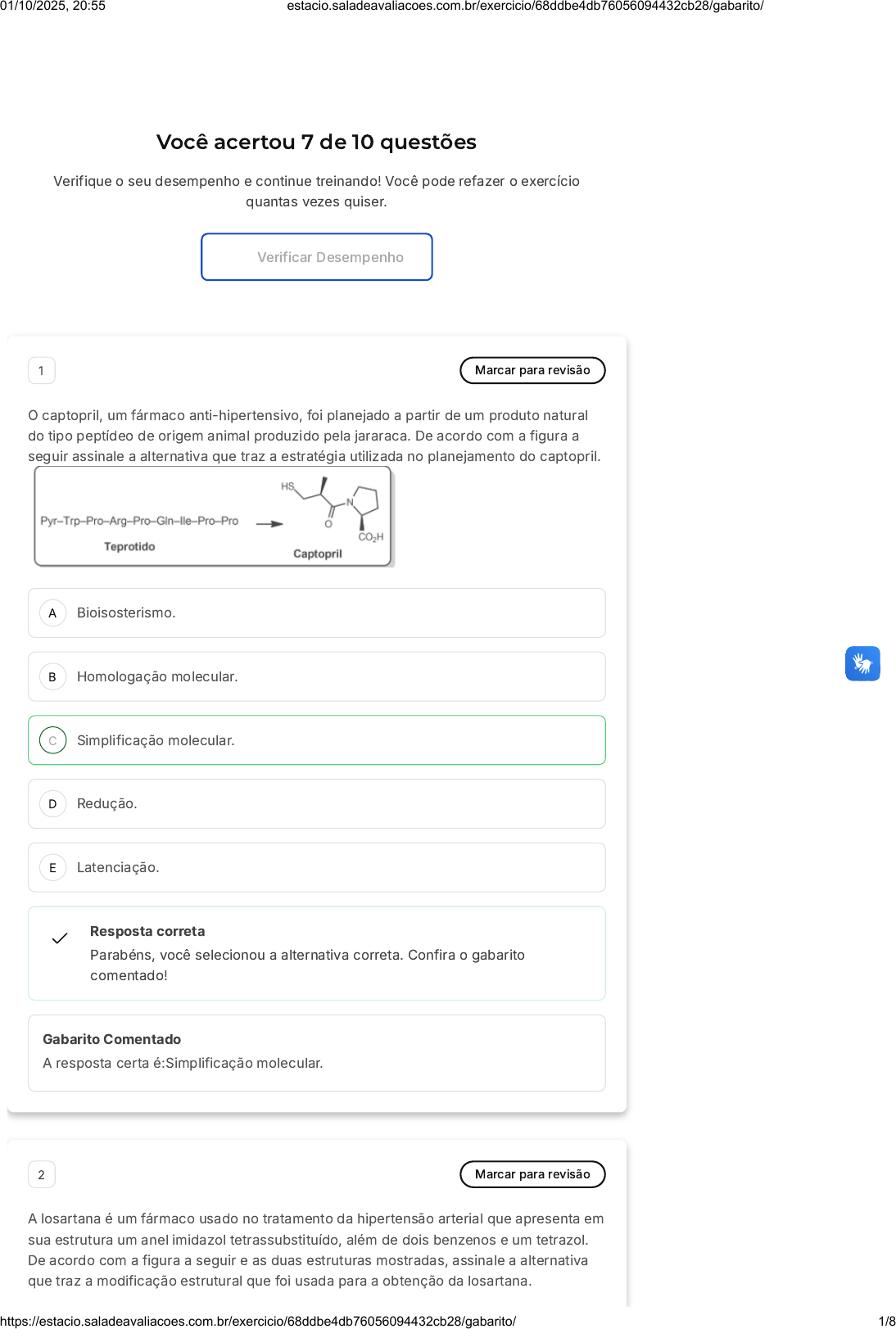 Você acertou 7 de 10 questões Verifique o seu desempenho e continue treinando! Você pode refazer o exercício quantas vezes quiser. Verificar Desempenho A B C D E 1 Marcar para revisão O captopril, um fármaco anti-hipertensivo, foi planejado a partir de um produto natural do tipo peptídeo de origem animal produzido pela jararaca. De acordo com a figura a seguir assinale a alternativa que traz a estratégia utilizada no planejamento do captopril. Bioisosterismo. Homologação molecular. Simplificação molecular. Redução. Latenciação. Resposta correta Parabéns, você selecionou a alternativa correta. Confira o gabarito comentado! Gabarito Comentado A resposta certa é:Simplificação molecular. 2 Marcar para revisão A losartana é um fármaco usado no tratamento da hipertensão arterial que apresenta em sua estrutura um anel imidazol tetrassubstituído, além de dois benzenos e um tetrazol. De acordo com a figura a seguir e as duas estruturas mostradas, assinale a alternativa que traz a modificação estrutural que foi usada para a obtenção da losartana. 01/10/2025, 20:55 estacio.saladeavaliacoes.com.br/exercicio/68ddbe4db76056094432cb28/gabarito/ https://estacio.saladeavaliacoes.com.br/exercicio/68ddbe4db76056094432cb28/gabarito/ 1/8 A B C D E A B C Bioisosterismo clássico de anéis equivalentes. Bioisosterismo não clássico de grupos funcionais. Retroisomerismo. Bioisosterismo clássico de grupos tetravalentes. Bioisosterismo clássico de átomos monovalentes. Resposta incorreta Opa! A alternativa correta é a letra B. Confira o gabarito comentado! Gabarito Comentado A resposta certa é: Bioisosterismo não clássico de grupos funcionais. 3 Marcar para revisão Em relação ao bioisosterismo não clássico chamado de retroisomerismo, podemos afirmar que: A aplicação do retroisomerismo visa somente melhorar as características farmacocinéticas. Consiste na inversão da posição de um grupo funcional tendo como exemplo a função amida -NH-C=O e o retroisóstero -C(O)-NH. Grupos chamados retroisósteros têm diferentes pontos de interação com o receptor. Questão 2 de 10 Corretas (7) Incorretas (3) Em branco (0) 1 2 3 4 5 6 7 8 9 10 Lista de exercícios Estratégias De Modificação Molecular Sair 01/10/2025, 20:55 estacio.saladeavaliacoes.com.br/exercicio/68ddbe4db76056094432cb28/gabarito/ https://estacio.saladeavaliacoes.com.br/exercicio/68ddbe4db76056094432cb28/gabarito/ 2/8 D E A B C D E A lidocaína e a procaína apresentam grupos chamados retroisósteros. Os grupos ácido carboxílico (-CO H) e sulfonamida (-SO NH-) são considerados retroisósteros. 2 2 Resposta correta Parabéns, você selecionou a alternativa correta. Confira o gabarito comentado! Gabarito Comentado O retroisomerismo é um tipo de bioisosterismo não clássico que consiste na inversão da posição de um grupo funcional. Um exemplo disso é a função amida - NH-C=O e o retroisóstero -C(O)-NH. Portanto, a alternativa correta é a B, que afirma exatamente isso. 4 Marcar para revisão A introdução de anéis em um composto protótipo leva a modificações estruturais relevantes no planejamento de novas moléculas. Assinale a alternativa que NÃO é resultado da introdução de anéis em um composto protótipo: Impedir estericamente o acesso a sítios de metabolização. Tornar a molécula mais flexível. Aumentar o tempo de meia-vida de uma molécula. Melhorar a interação com o sítio receptor. Introduzir rigidez na molécula. Resposta correta Parabéns, você selecionou a alternativa correta. Confira o gabarito comentado! Gabarito Comentado A introdução de anéis em um composto protótipo leva a modificações estruturais relevantes no planejamento de novas moléculas, como a introdução de rigidez na molécula. A alternativa B, portanto, está incorreta. 5 Marcar para revisão 01/10/2025, 20:55 estacio.saladeavaliacoes.com.br/exercicio/68ddbe4db76056094432cb28/gabarito/ https://estacio.saladeavaliacoes.com.br/exercicio/68ddbe4db76056094432cb28/gabarito/ 3/8 A B C D E A B C A figura a seguir mostra dois fármacos com atividade antiagregante plaquetária e vasodilatadora usados no tratamento da hipertensão arterial. O cicaprost foi desenhado a partir de modificações na estrutura do protótipo iloprost. Assinale a alternativa que contém as estratégias usadas nesse planejamento: Rigidificação e homologação molecular. Anelação e simplificação molecular. Bioisosterismo clássico de átomos divalentes e homologação molecular. Hibridação e retroisomerismo. Bioisosterismo clássico de átomos monovalentes e simplificação molecular. Resposta incorreta Opa! A alternativa correta é a letra C. Confira o gabarito comentado! Gabarito Comentado A resposta certa é:Bioisosterismo clássico de átomos divalentes e homologação molecular. 6 Marcar para revisão A homologação molecular pode ser realizada por diferentes tipos de modificação em uma molécula que podem levar a consequências variadas em relação à atividade biológica da molécula obtida. Em relação ao assunto, assinale a alternativa que traz a principal alteração molecular quando se introduz grupos metileno (-CH ) em uma estrutura protótipo: 2 Aumento no tamanho e lipofilicidade das moléculas. Redução dos efeitos adversos da molécula protótipo. Aumento da potência do composto obtido. 01/10/2025, 20:55 estacio.saladeavaliacoes.com.br/exercicio/68ddbe4db76056094432cb28/gabarito/ https://estacio.saladeavaliacoes.com.br/exercicio/68ddbe4db76056094432cb28/gabarito/ 4/8 D E A B C D E Obtenção de um composto com atividade biológica diferente. Redução do log P e pKa da molécula. Resposta correta Parabéns, você selecionou a alternativa correta. Confira o gabarito comentado! Gabarito Comentado A alternativa correta é "Aumento no tamanho e lipofilicidade das moléculas". Isso ocorre porque a introdução de grupos metileno (-CH ) em uma estrutura protótipo resulta em um aumento no tamanho da molécula. 