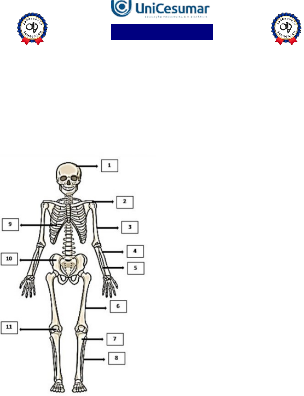 MAPA - 19 9 87734238 - MAPA PEÇA JÁ SUA ATIVIDADE MAPA 19 9 87734238 1ª QUESTÃO A prática de exercícios físicos envolve a complexa interação entre o sistema muscular e o esquelético. Neste sentido, faz-se necessário compreender a anatomia óssea e muscular, para então, entender a mecânica do movimento e prevenir lesões durante a prática de movimentos em geral. GUYTON, Arthur C.; HALL, John E. Tratado de fisiologia médica. 13. ed. Rio de Janeiro: Elsevier, 2017. A partir deste contexto, observe a imagem abaixo e identifique o que se pede: A) Identificação das estruturas: descreva o número que se encontra na imagem e o nome do osso em que é apontado (ex: 1 - osso …, 2 - osso ...). B) Características das estruturas identificadas: Descreva as características básicas das seguintes estruturas identificadas na imagem abaixo. Fonte: https://br.depositphotos.com/ QUESTÃO 2 Os estudos sobre a Miologia apontam importantes informações sobre a função dos músculos, os tipos de músculos existentes no corpo humano e também, as suas características anatômicas. É MAPA - 19 9 87734238 - MAPA PEÇA JÁ SUA ATIVIDADE MAPA 19 9 87734238 importante lembrar, que os músculos não são iguais, possuem diferentes características, quanto a sua estrutura, função e tipo de contração. Barbosa, C. P. Anatomia Humana Aplicada à Educação Física. Centro Universitário de Maringá. Núcleo de Educação à Distância. Maringá-PR. Unicesumar. 2024. Neste contexto, responda as questões abaixo: A) O que é o endomísio e qual a sua localização? B) O Músculo liso está presente em quais órgãos do corpo humano? Quais são suas características básicas? C) Qual é o tipo de músculo que move e estabiliza os ossos? D) O que é um fascículo muscular? E) Qual o tipo de músculo responsável por formar a maioria das paredes do coração? F) O que é a Fáscia muscular? Quais são suas funções? G) O que é epimísio? Descreva uma de suas funções. H) Descreva as características básicas do músculo diafragma. QUESTÃO 03 No treinamento esportivo de alta intensidade ou até mesmo durante as aulas de Educação Física Escolar, é muito comum lesões em articulações sinoviais, por estarem envolvidas a movimentos específicos do esporte, como um chute, um arremesso, um drible, dentre outros. As articulações sinoviais possuem características anatômicas específicas e também são divididas em vários tipos, de acordo com suas características estruturais, sendo estas: do tipo plana, do tipo gínglimo, trocoides, elipsoides, selares e esferoideas. Barbosa, C. P. Anatomia Humana Aplicada à Educação Física. Centro Universitário de Maringá. Núcleo de Educação à Distância. Maringá-PR. Unicesumar. 2024. Considerando as articulações sinoviais, seus diferentes tipos e suas características anatômicas, responda as seguintes questões: A) Articulação sinovial do tipo Plana: Quais são as características anatômicas desse tipo de articulação? Quais são as articulações do tipo planas? B) Articulação sinovial do tipo Gínglimo: Quais são as características anatômicas desse tipo de articulação? Quais são as articulações do tipo Gínglimo? C) Articulação sinovial do tipo Trocoides: Quais são as características anatômicas desse tipo de articulação? Quais são as articulações do tipo Trocoides? D) Articulação sinovial do tipo Elipsoides: Quais são as características anatômicas desse tipo de articulação? Quais são as articulações do tipo Elipsoides? E) Articulação sinovial do tipo Selares: Quais são as características anatômicas desse tipo de articulação? Quais são as articulações do tipo Selares? F) Articulação sinovial do tipo Esferoideas: Quais são as características anatômicas desse tipo de articulação? Quais são as articulações do tipo Esferoideas? G) Quais movimentos, as articulações sinoviais podem apresentar? MAPA - ANATOMIA HUMANA APLICADA À EDUCAÇÃO FÍSICA - 54_2025 019 Assessoria Acadêmica MAPA - 19 9 87734238 - MAPA PEÇA JÁ SUA ATIVIDADE MAPA 19 9 87734238 Assessoria especializada em atividades Unicesumar A 019 Assessoria é a parceira ideal para quem deseja transformar a vida universitária em uma jornada mais leve e produtiva. Com atendimento personalizado, oferecemos suporte completo: desde a organização dos estudos até a preparação para provas e trabalhos finais. Nosso objetivo vai além de superar desafios acadêmicos — ajudamos o estudante a se desenvolver pessoal e profissionalmente, garantindo resultados reais e preparando-o para se destacar no mercado de trabalho. Com a 019 Assessoria, você não estuda sozinho: tem ao seu lado uma equipe comprometida com o seu sucesso. SUA NOTA NOSSA RESPONSABILIDADE 019 Assessoria Acadêmica 019 (19) 9 87734238 (19) 9 87734238 (19) 9 87734238 (19) 9 87734238