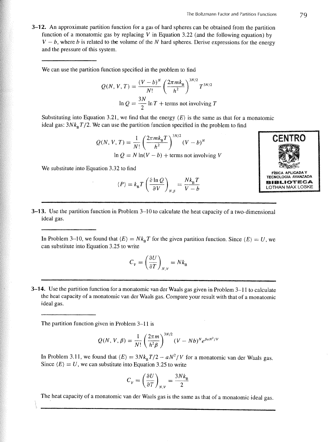 The Boltzmann Factor and Partition Functions 79 3-12. An approximate partition function for a gas of hard spheres can be obtained from the partition function of a monatomic gas by replacing V in Equation 3.22 (and the following equation) by where b is related to the volume of the N hard spheres. Derive expressions for the energy and the pressure of this system. We can use the partition function specified in the problem to find In Q = + terms not involving T Substituting into Equation 3.21, we find that the energy (E) is the same as that for a monatomic ideal gas: T/2. We can use the partition function specified in the problem to find CENTRO In Q = N + terms not involving V We substitute into Equation 3.32 to find FÍSICA TECNOLOGIA AVANZADA BIBLIOTECA LOTHAN MAX LOSKE 3-13. Use the partition function in Problem 3-10 to calculate the heat capacity of a two-dimensional ideal gas. In Problem 3-10, we found that (E) = for the given partition function. Since (E) = U, we can substitute into Equation 3.25 to write 3-14. Use the partition function for a monatomic van der Waals gas given in Problem 3-11 to calculate the heat capacity of a monatomic van der Waals gas. Compare your result with that of a monatomic ideal gas. The partition function given in Problem 3-11 is In Problem 3.11, we found that (E) = for a monatomic van der Waals gas. Since (E) = U, we can substitute into Equation 3.25 to write The heat capacity of a monatomic van der Waals gas is the same as that of a monatomic ideal gas.