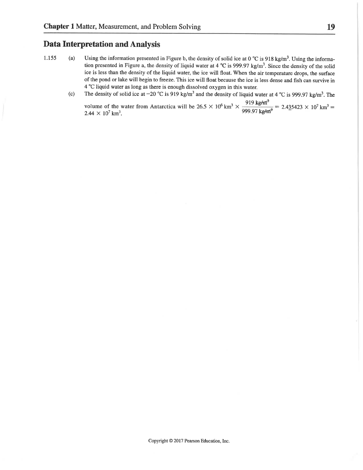 Chapter 1 Matter, Measurement, and Problem Solving 19 Data Interpretation and Analysis 1.155 (a) Using the information presented in Figure b, the density of solid ice at 0 °C is 918 kg/m³. Using the informa- tion presented in Figure a, the density of liquid water at 4 °C is 999.97 kg/m³. Since the density of the solid ice is less than the density of the liquid water, the ice will float. When the air temperature drops, the surface of the pond or lake will begin to freeze. This ice will float because the ice is less dense and fish can survive in 4 °C liquid water as long as there is enough dissolved oxygen in this water. (c) The density of solid ice at -20 °C is 919 kg/m³ and the density of liquid water at 4 °C is 999.97 The 919 kg/m3 volume of the water from Antarctica will be 26.5 X 10⁶ km³ X = 2.435423 X 10⁷ km³ = 2.44 X 10⁷ km³. 999.97 kg/m3 Copyright © 2017 Pearson Education, Inc.