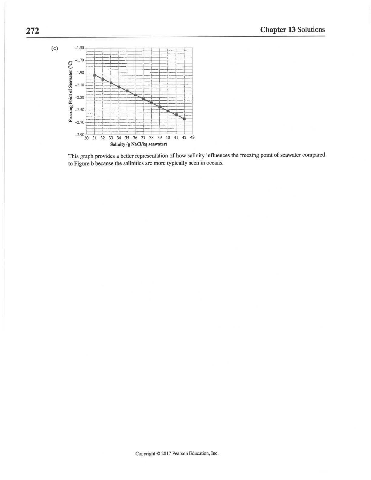 272 Chapter 13 Solutions (c) -1.50 -1.70 -1.90 Freezing Point of Seawater (°C) -2.10 -2.30 -2.50 -2.70 -2.90 30 31 32 33 34 35 36 37 38 39 40 41 42 43 Salinity (g NaCl/kg seawater) This graph provides a better representation of how salinity influences the freezing point of seawater compared to Figure b because the salinities are more typically seen in oceans. Copyright © 2017 Pearson Education, Inc.