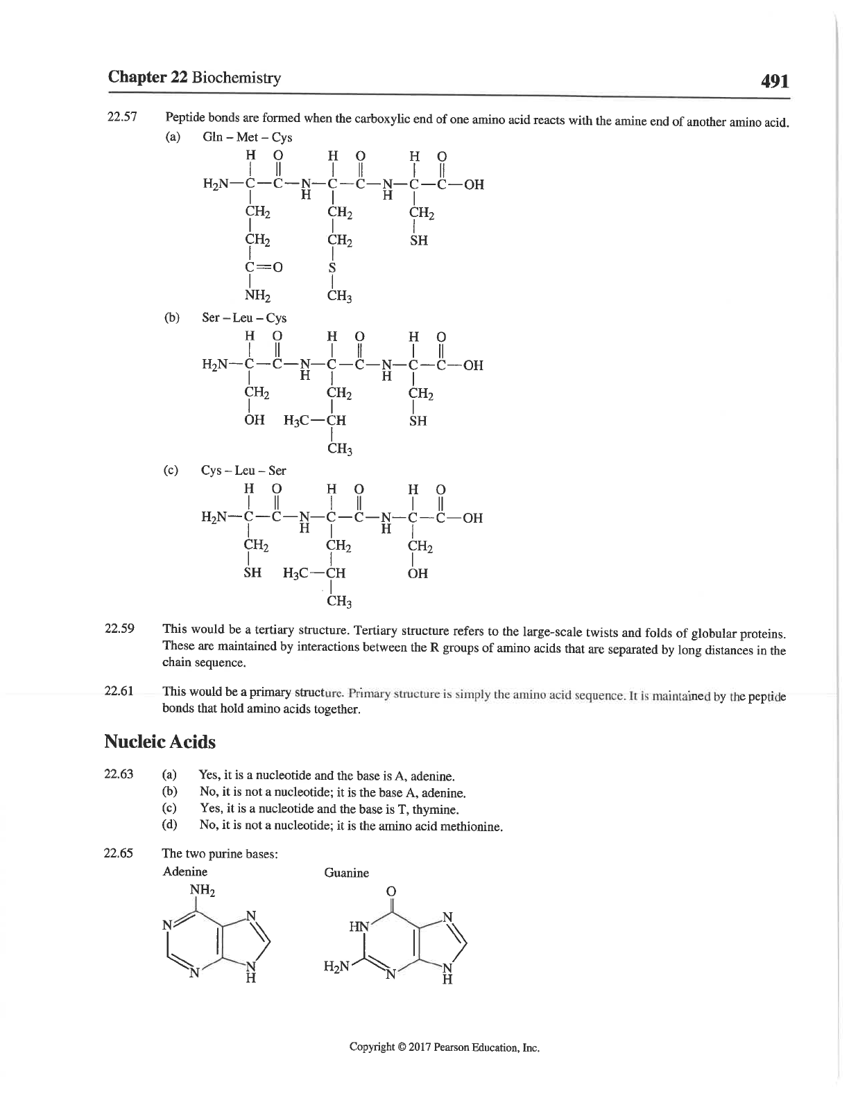 Chapter 22 Biochemistry 491 22.57 Peptide bonds are formed when the carboxylic end of one amino acid reacts with the amine end of another amino acid. (a) Gln - - Met - Cys H 0 H H 0 C C N C C N C C OH H H CH₂ CH₂ CH₂ CH₂ CH₂ SH S NH₂ CH₃ (b) Ser - Leu Cys H 0 H 0 H 0 H₂N C C N C C N C C OH H H CH₂ CH₂ CH₂ OH H₃C CH SH CH₃ (c) Cys Leu - Ser H H 0 H 0 C C N C C N C C OH H H CH₂ CH₂ CH₂ SH H₃ C CH OH CH₃ 22.59 This would be a tertiary structure. Tertiary structure refers to the large-scale twists and folds of globular proteins. These are maintained by interactions between the R groups of amino acids that are separated by long distances in the chain sequence. 22.61 This would be a primary structure. Primary structure is simply the amino acid sequence. It is maintained by the peptide bonds that hold amino acids together. Nucleic Acids 22.63 (a) Yes, it is a nucleotide and the base is A, adenine. (b) No, it is not a nucleotide; it is the base A, adenine. (c) Yes, it is a nucleotide and the base is T, thymine. (d) No, it is not a nucleotide; it is the amino acid methionine. 22.65 The two purine bases: Adenine Guanine NH₂ 0 N N N HN N N N H N H Copyright © 2017 Pearson Education, Inc.
