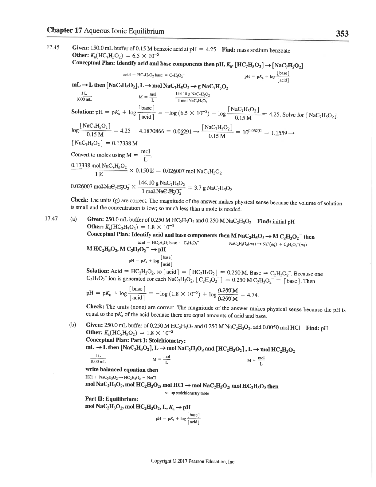 Chapter 17 Aqueous Ionic Equilibrium 353 17.45 Given: 150.0 mL buffer of 0.15 M benzoic acid at pH = 4.25 Find: mass sodium benzoate Other: = 6.5 X 10⁻⁵ Conceptual Plan: Identify acid and base components then pH, [HC₇H₅O₂] [NaC₇H₅O₂] acid = base = C₇H₅O₂⁻ mL L then [NaC₇H₅O₂], L mol NaC₇H₅O₂ g NaC₇H₅O₂ 1L 1000 mL 144.10 NaC₇H₅O₂ M 1 mol NaC₇H₅O₂ Solution: pH = + log [base] = -log (6.5 X 10⁻⁵) + log [NaC₇H₅O₂] 0.15 = 4.25. Solve for [NaC₇H₅O₂]. [NaC₇H₅O₂] log [NaC₇H₅O₂] = 4.25 - 0.15 4.1870866 = 0.06291 = = 0.15 M 1.1559 [NaC₇H₅O₂] = 0.17338 M Convert to moles using M 0.17338 mol NaC₇H₅O₂ 1 L X 0.150 = 0.026007 mol NaC₇H₅O₂ 0.026007 X 144.10 1 NaC₇H₅O₂ = 3.7 NaC₇H₅O₂ Check: The units (g) are correct. The magnitude of the answer makes physical sense because the volume of solution is small and the concentration is low; much less than a mole is needed. 17.47 (a) Given: 250.0 mL buffer of 0.250 M HC₂H₃O₂ and 0.250 M NaC₂H₃O₂ Find: initial pH Other: = 1.8 X 10⁻⁵ Conceptual Plan: Identify acid and base components then M NaC₂H₃O₂ M C₂H₃O₂⁻ then acid = base = NaC₂H₃O₂(aq) Na⁺(aq) + pH Solution: Acid = HC₂H₃O₂, so [acid] = [HC₂H₃O₂] = 0.250 M. Base = C₂H₃O₂⁻. Because one C₂H₃O₂⁻ ion is generated for each NaC₂H₃O₂, [C₂H₃O₂⁻] = 0.250 C₂H₃O₂⁻ = [base]. Then Check: The units (none) are correct. The magnitude of the answer makes physical sense because the pH is equal to the pKₐ of the acid because there are equal amounts of acid and base. (b) Given: 250.0 mL buffer of 0.250 M HC₂H₃O₂ and 0.250 M NaC₂H₃O₂, add 0.0050 mol HCI Find: pH Other: = 1.8 X 10⁻⁵ Conceptual Plan: Part I: Stoichiometry: mL L then [NaC₂H₃O₂], L mol NaC₂H₃O₂ and [HC₂H₃O₂], L mol 1L 1000 mL write balanced equation then + NaC₂H₃O₂ HC₂H₃O₂ + NaCl mol NaC₂H₃O₂, mol mol HCI mol NaC₂H₃O₂, mol then set up stoichiometry table Part II: Equilibrium: mol NaC₂H₃O₂, mol HC₂H₃O₂, L, pH Copyright © 2017 Pearson Education, Inc.