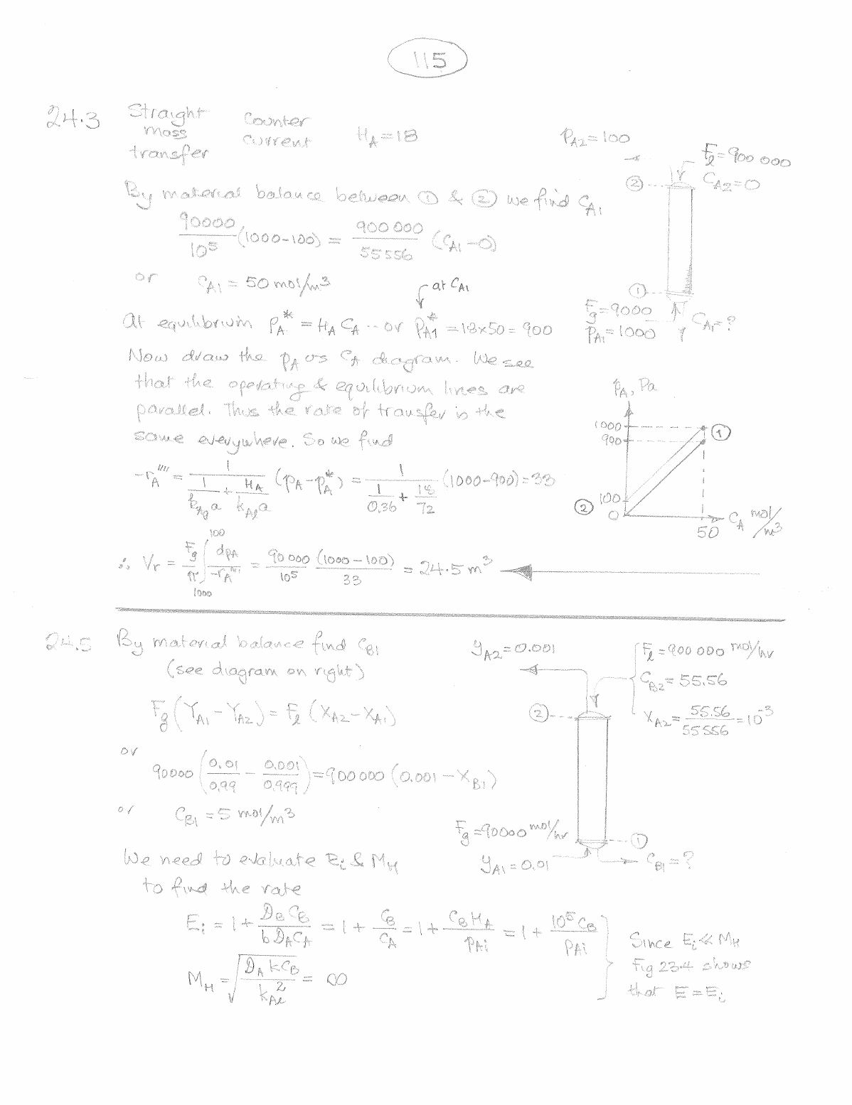 115 24.3 Straight Counter mass current HA=18 100 transfer By material balance between - & 2. we find CA, 90000 105 (1000-100) = 900 000 55556 or 50 mos/m3 at - at equilibrium PA CA PA1 CAF? Y Now draw the PA CA deagram. see that the operating & equilibrium lines are PA, Pa parallel. Thus the rate of transfer is the 1000 same everywhere. find 1 900 = + HA = + 18 (1000-900)=33 a 100 0.36 72 2 0 100 50 CA mal/ Vr = = 105 33 24.5 m3 1000 24.5 By material balance find CBI YA2=0.001 (see diagram on right) 55.56 ( YAZ) = Fe Y 2 = 55556 55.56 or 90000 0.01 =900000 (0.001 0.99 0.999 or CB₁ = 5 - need to evaluate Ei& MH ? to find the rate E: 1+ = 1+ CA CB CBHA PAi =1+ = PAi Since Ei
