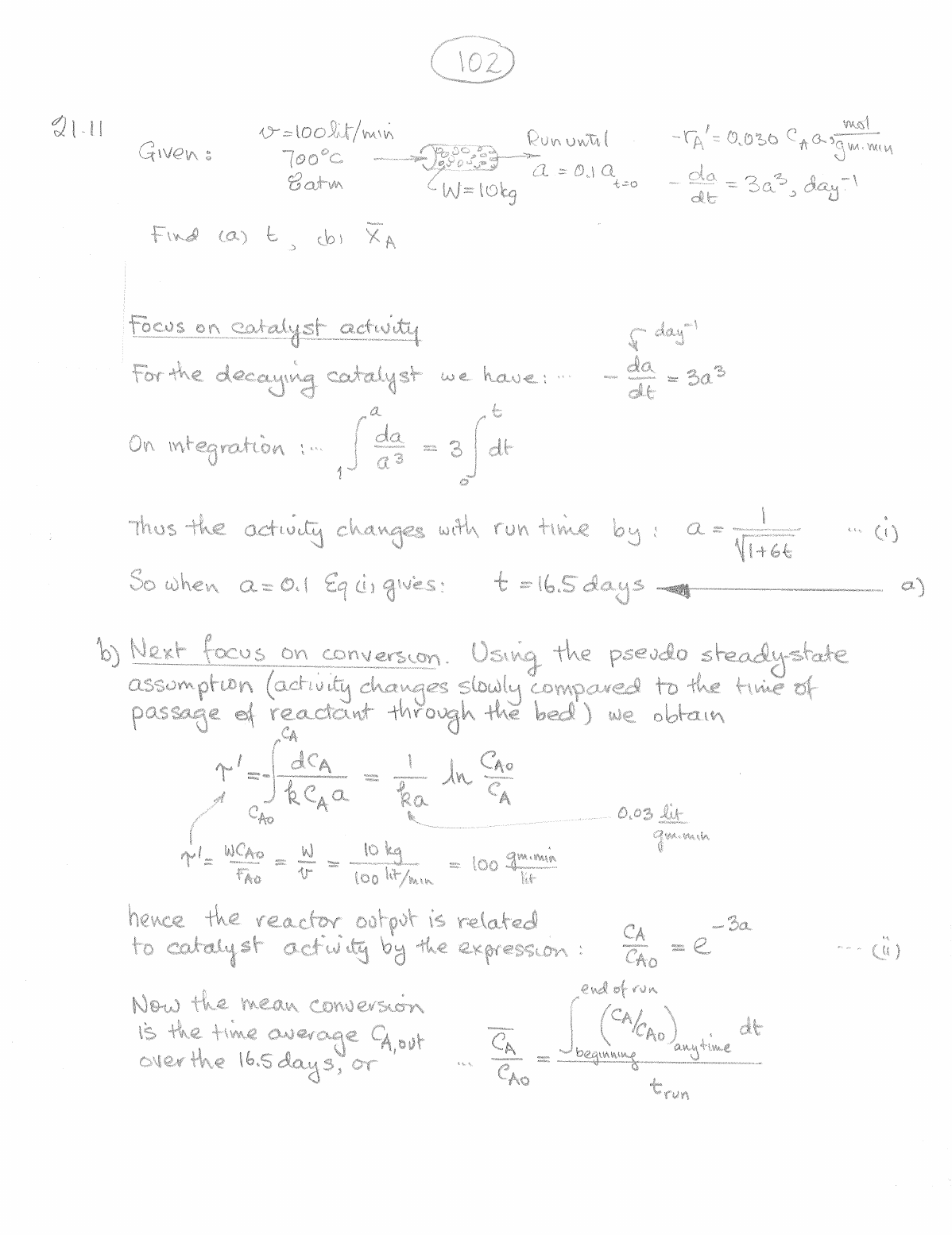 102 21.11 v=100lit/min = Rununtil Given: : = 0.030 CA a a = 0.1 a Eatm W=10kg = 10kg da dt = 3a3, Find (a) t, XA Focus on catalyst activity For the decaying catalyst we have: da = 3a3 dt a t da On integration :- 3 dt 1 Thus the activity changes with run time a (i) 1+6t So when a=0.1 = Eq (i) gives: t = 16.5 days a) b) Next focus on conversion. Using the pseudo steady-state assumption (activity changes slowly compared to the time of passage of reactant CA through the bed) we obtain / dCA k CA a Ra CA CAO 0.03 lit = WCAO FAO W = 10 kg lit = 100 lit 100 lit/min hence the reactor output is related CA -3a to catalyst activity by the expression: e CAO (ii) Now the mean conversion end of is the time average CA,out CA dt over the 16.5 days, or beginning anytime CAO trun