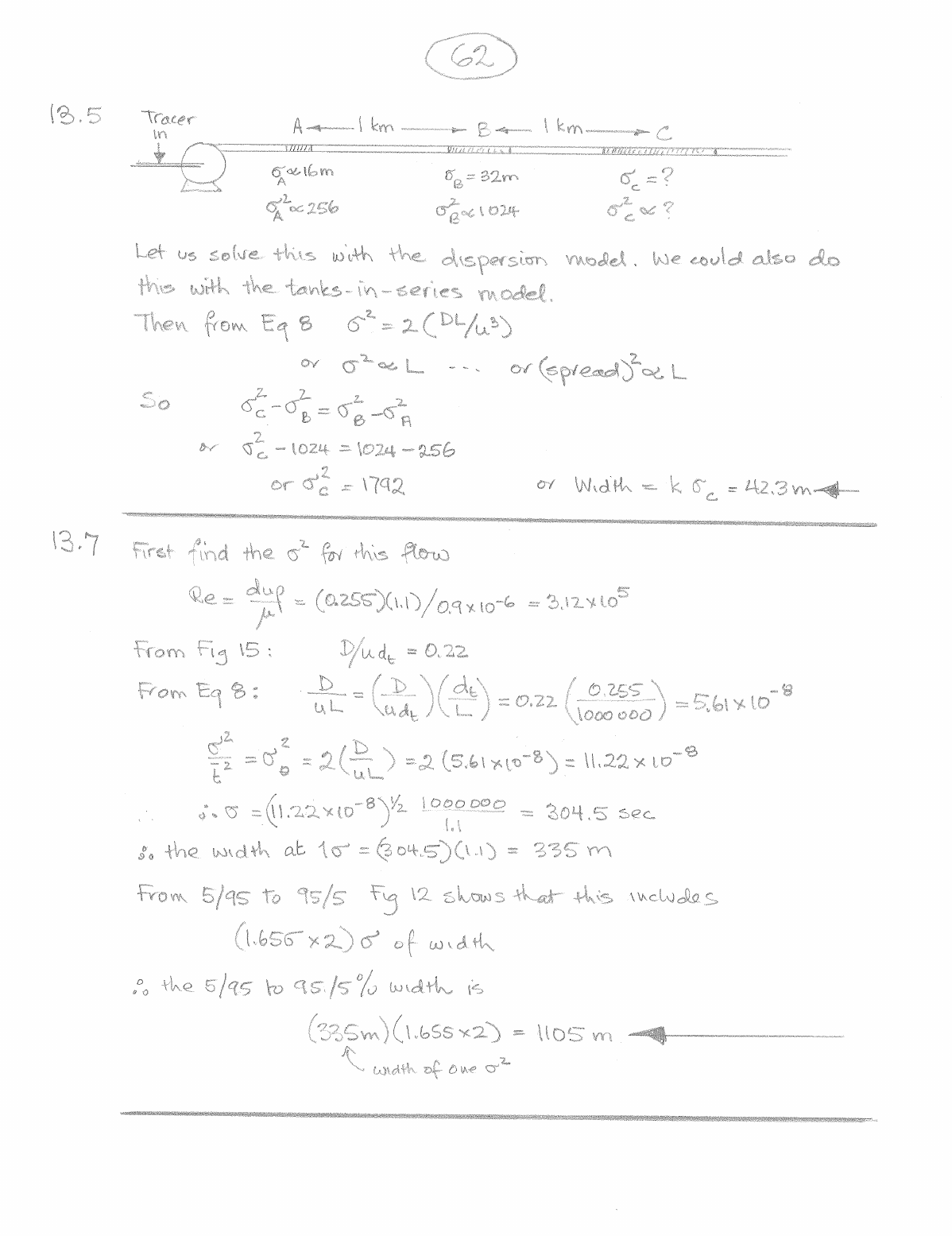 62 Tracer A km B in C = 32m ? Let us solve this with the dispersion model. could also do this with the tanks- in series model. Then from Eq 8 62 = or σ² or L So = or 1024 = 1024 256 or 1792 or Width k 6c = 42.3 m 13.7 First find the for this flow Re = dup = From Fig 15 : D/udt = 0.22 From Eq 4L D = L = 0.22 = = = 2 D ) = 2 = 11.22 = 1000000 1.1 = 304.5 sec the width at 10 = (304.5) (1.1) = 335 m From 5/95 to 95/5 Fig 12 shows that this includes of width :- the 5/95 to width is (335m) (1.655x2) = 1105 m width of one