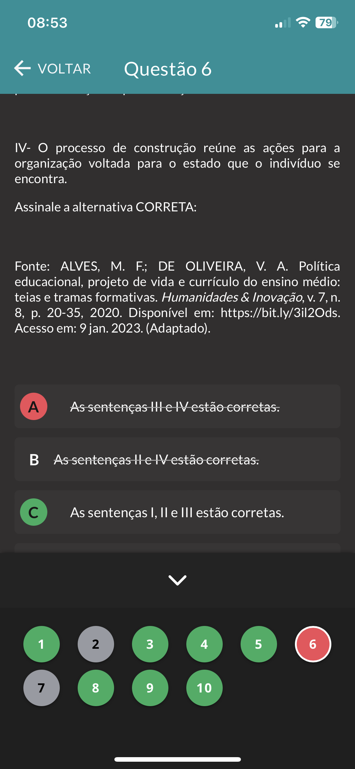 08:53 79 VOLTAR Questão 6 IV- processo de construção reúne as ações para a organização voltada para estado que indivíduo se encontra. Assinale a alternativa CORRETA: Fonte: ALVES, F.; DE OLIVEIRA, V. A. Política educacional, projeto de vida e currículo do ensino médio: teias e tramas formativas. Humanidades & Inovação, V. 7, n. 8, p. 20-35, 2020. Disponível em: Acesso em: 9 jan. 2023. (Adaptado). A As sentenças III e IV estão corretas. B As sentenças IV estão corretas. As sentenças I, II e III estão corretas. 1 2 3 4 5 6 7 8 9 10