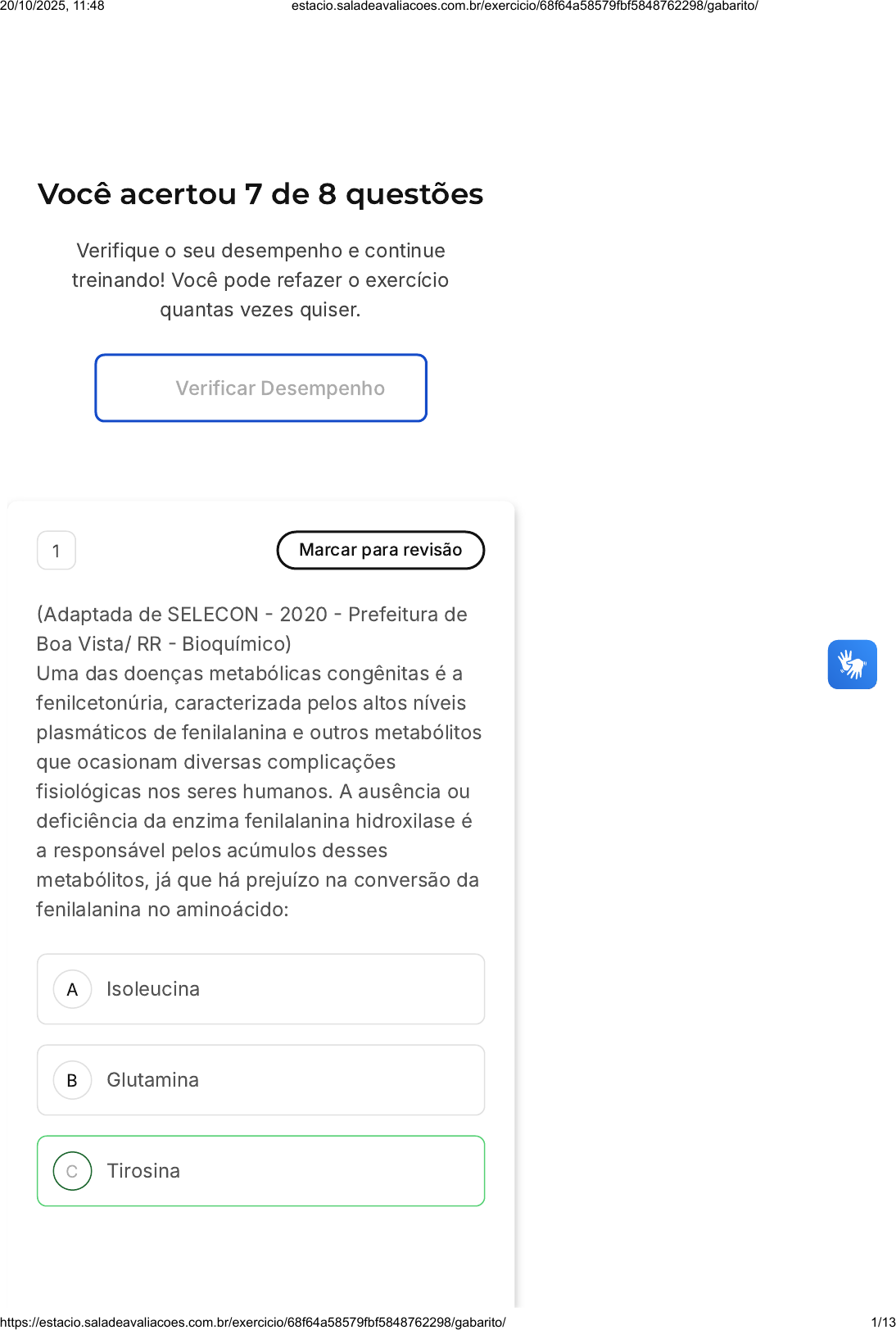 Você acertou 7 de 8 questões Verifique o seu desempenho e continue treinando! Você pode refazer o exercício quantas vezes quiser. Verificar Desempenho A B C 1 Marcar para revisão (Adaptada de SELECON - 2020 - Prefeitura de Boa Vista/ RR - Bioquímico) Uma das doenças metabólicas congênitas é a fenilcetonúria, caracterizada pelos altos níveis plasmáticos de fenilalanina e outros metabólitos que ocasionam diversas complicações fisiológicas nos seres humanos. A ausência ou deficiência da enzima fenilalanina hidroxilase é a responsável pelos acúmulos desses metabólitos, já que há prejuízo na conversão da fenilalanina no aminoácido: Isoleucina Glutamina Tirosina 20/10/2025, 11:48 estacio.saladeavaliacoes.com.br/exercicio/68f64a58579fbf5848762298/gabarito/ https://estacio.saladeavaliacoes.com.br/exercicio/68f64a58579fbf5848762298/gabarito/ 1/13 D E Arginina Glicina Resposta correta Parabéns, você selecionou a alternativa correta. Confira o gabarito comentado! Gabarito Comentado A fenilcetonúria é uma doença metabólica congênita que se caracteriza pela alta concentração de fenilalanina e outros metabólitos no plasma, devido à ausência ou deficiência da enzima fenilalanina hidroxilase. Esta enzima é responsável pela conversão da fenilalanina em outro aminoácido, a tirosina. Portanto, a alternativa correta é a "C", que indica a tirosina como o aminoácido resultante da conversão da fenilalanina. 2 Marcar para revisão (INSTITUTO AOCP - 2015 - EBSERH - Nutricionista) A fenilcetonúria é um erro inato no metabolismo de herança autossômica recessiva. Sobre esse assunto, assinale a alternativa correta: 20/10/2025, 11:48 estacio.saladeavaliacoes.com.br/exercicio/68f64a58579fbf5848762298/gabarito/ https://estacio.saladeavaliacoes.com.br/exercicio/68f64a58579fbf5848762298/gabarito/ 2/13 A B C D E Possui duas formas de apresentação: fenilcetonúria clássica e fenilcetonúria leve, a clássica é sempre verificada em bebês e as leves em adultos. A deficiência da enzima hepática fenilalanina hidroxilase causa redução de fenilalanina no sangue. A enzima fenilalanina hidroxilase catalisa a conversão da fenilalanina em alanina, cuja falta gera produção insuficiente dos neurotransmissores dopamina e noradrenalina. Caracteriza-se por atraso no desenvolvimento neuropsicomotor, hiperatividade e convulsões; no entanto, não afeta o crescimento da criança. O diagnóstico precoce da fenilcetonúria é realizado por triagem neonatal, que é obrigatório em todo território nacional e oferecido pelo Sistema Único de Saúde (SUS). Resposta correta Parabéns, você selecionou a alternativa correta. Confira o gabarito comentado! Gabarito Comentado A alternativa correta é a letra E. A fenilcetonúria é uma doença genética que pode ser diagnosticada precocemente por meio da triagem neonatal, um 20/10/2025, 11:48 estacio.saladeavaliacoes.com.br/exercicio/68f64a58579fbf5848762298/gabarito/ https://estacio.saladeavaliacoes.com.br/exercicio/68f64a58579fbf5848762298/gabarito/ 3/13 procedimento obrigatório em todo o território nacional e oferecido pelo Sistema Único de Saúde (SUS). Esse diagnóstico precoce é fundamental para o início do tratamento adequado e para evitar complicações futuras, como atraso no desenvolvimento neuropsicomotor e convulsões. Portanto, a afirmação de que "O diagnóstico precoce da fenilcetonúria é realizado por triagem neonatal, que é obrigatório em todo território nacional e oferecido pelo Sistema Único de Saúde (SUS)" está correta. 3 Marcar para revisão (Adaptada de INAZ do Pará - 2019 - FUNGOTA - Farmacêutico.) A anemia é uma doença causada pela carência de hemoglobina - uma proteína existente no interior das hemácias (células sanguíneas também conhecidas como glóbulos vermelhos), cuja principal função é o transporte de oxigênio. A anemia, ou carência de hemoglobina no sangue, pode ser devido à deficiência de vários nutrientes, como ferro, zinco, vitamina B12 e proteínas. Quando a anemia decorre da deficiência de ferro, a condição é chamada anemia ferropriva. Essa costuma ser a causa principal dos quadros de anemia - normalmente 90% dos casos. A deficiência de ferro é uma condição perigosa para a saúde do organismo. O ferro é um nutriente essencial para a manutenção da vida, uma vez que atua principalmente na fabricação de células vermelhas do sangue e no transporte do oxigênio para todas as células do corpo. O desenvolvimento de anemia ferropriva pode ser caracterizado pela: 20/10/2025, 11:48 estacio.saladeavaliacoes.com.br/exercicio/68f64a58579fbf5848762298/gabarito/ https://estacio.saladeavaliacoes.com.br/exercicio/68f64a58579fbf5848762298/gabarito/ 4/13 A B C D E Absorção de ferro excedendo a perda de sangue, ocorre, assim, balanço negativo do ferro. Aumento da ferritina, ampliando a absorção do ferro. Aumento da capacidade de ligação do ferro (transferrina). Aumento da saturação da transferrina. Diminuição da síntese de ferroportina. Resposta correta Parabéns, você selecionou a alternativa correta. Confira o gabarito comentado! Gabarito Comentado A alternativa correta é a C, que afirma que o desenvolvimento de anemia ferropriva pode ser caracterizado pelo aumento da capacidade de ligação do ferro (transferrina). A transferrina é uma proteína que se liga ao ferro para transportá-lo pelo corpo. Quando há deficiência de ferro, como no caso da anemia ferropriva, o corpo aumenta a produção de transferrina para maximizar a absorção do ferro disponível. Portanto, um aumento na capacidade de ligação do ferro é um indicativo de anemia ferropriva. 20/10/2025, 11:48 estacio.saladeavaliacoes.com.br/exercicio/68f64a58579fbf5848762298/gabarito/ https://estacio.saladeavaliacoes.com.br/exercicio/68f64a58579fbf5848762298/gabarito/ 5/13 A B C 4 Marcar para revisão (AOCP - 2015 - EBSERH/HE - Universidade Federal de Pelotas/RS - Biomédico) Teodoro, 9 anos, natu