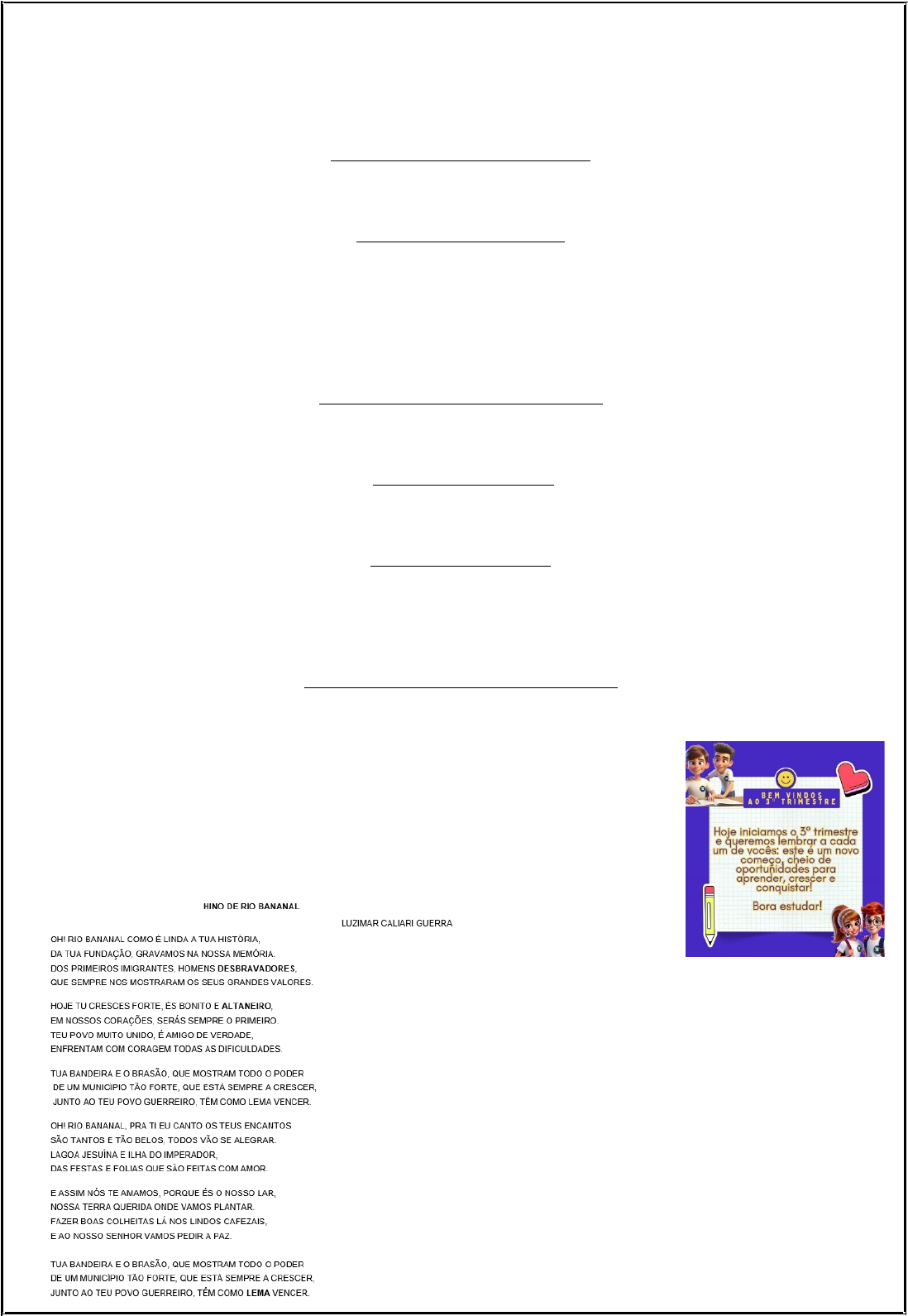 EMEF PROFESSORA MARIA ENDRINGE ANHOLETI PLANEJMENTO 3° ANO (Vespertino) – 04/09/2025 à 09/09/2025 Data: 04 de Setembro de 2025 Dia: Quinta-feira Matemática: ( 1ª, 2ª e 3ª aulas) - ENSAIO GERAL PARA O DESFILE CIVICO. Geografia: ( 4ª e 5ª aula) - ENSAIO GERAL PARA O DESFILE CIVICO. Data: 05 de Setembro de 2025 Dia: Sexta-feira Língua Portuguesa: (1ª, 2ª aulas) - CONSELHO DE CLASSE. Matemática: (3ª aula) - CONSELHO DE CLASSE. História (4ª e 5ª aula) - CONSELHO DE CLASSE. Data: 08 de setembro 2025 Dia: Segunda-feira Língua Portuguesa: (1ª, 2ª e 3 aulas) INICIO DO 3º TRIMESTRE - ESCUTA ATENTA DA HISTÓRIA DO MUNICIPIO DE RIO BANANAL. - EXPLORAÇÃO ORAAL DA HISTÓRIA. 1- Leia o texto abaixo: Xerox QUADRO 01- Faça o que se pede: · Enumere os versos. · Circule as estrofes. · Quantos versos possui? ___________ · Quantas estrofes possui? ________________ 02- QUAL O SIGNIFICADO DAS PALAVRAS GRIFADAS NO TEXTO? 03- NOSSA TERRA QUERIDA ONDE VAMOS PLANTAR. FAZER BOAS COLHEITAS. QUAIS PRODUTOS AGRÍCOLAS SÃO CULTIVADOS EM RIO BANANAL? 04- “LAGOA JESUÍNA E ILHA DO IMPERADOR, DAS FESTAS E FOLIAS QUE SÃO FEITAS COM AMOR”. ESCREVA DOIS EXEMPLOS DE FESTAS E FOLIAS QUE ACONTECEM EM RIO BANANAL. 05- COMPLETE O TRECHO DO HINO SUBSTITUINDO POR OUTRA PALAVRA QUE RIMA. TUA BANDEIRA E O BRASÃO, QUE MOSTRAM TODO O ________________________________ DE UM MUNICÍPIO TÃO FORTE, QUE ESTÁ SEMPRE A _________________________________, JUNTO AO TEU POVO GUERREIRO, TÊM COMO LEMA _________________________________, 06- RETIRE DO TRECHO DO HINO UMA PALAVRA QUE A LETRA M VEM ANTES DO P: _____________________________________________________________________________________ 07- COMPLETE O QUADRO ABAIXO SEGUINDO O MODELO: PALAVRAS PALAVRAS COM M ANTES DAS CONSOANTES PALAVRAS COM N ANTES DAS CONSOANTES PIMENTA PIMENTA SEMPRE SEMPRE ENCA_______TO LI_____DOS SOME______TE TA________BÉM PLA_______TAR SO________BRA O______DE Matemática: (4ª e 5ª aula) - CORREÇÃO A AVALIAÇÃO SAEV. -RETOMADA DE MEDIDAS DE TEMPO. 1. Maria estuda no período da tarde e está sempre atrasada para ir à escola, sua avó lhe deu um relógio de presente para que ela não perdesse mais a hora. Qual o horário que está marcando no relógio de Maria? a) 5 horas. b) 3 horas e 20 minutos. c) 2 horas e 55 minutos. d) 11 horas. 2. Marina chegou à praia às 4 horas e permaneceu lá por 2 horas e 30 minutos. A que horas Marina voltou para sua casa? a) 6 horas e 30 minutos. b) 4 horas e 25 minutos. c) 4 horas e 30 minutos. d) 8 horas e 30 minutos. 3. Marque qual das imagens abaixo, quais delas podemos utilizar para medir passagens do tempo? 4. Letícia foi ao circo e as apresentações iniciaram às 7 horas da noite e terminou 3 horas depois. Que horas terminou as apresentações do circo? a) 9 horas. b) 8 horas. c) 8 horas e 30 minutos. d) 10 horas. 5. Se em um dia temos 24 horas, quantas horas temos em 3 dias? a) 100 horas. b) 72 horas. c) 60 horas. d) 57 horas. Data: 09 de setembro 2025 Dia: Terça-feira Língua Portuguesa: (1ª, 2ª e 3 aulas) - RETOMADA DA HISTÓRIA DE RIO BANANAL. - Confecção do livro sobre a história contada. · OBSERVAÇÃO: se sobra tempo. - Retomada dos verbos. 1. LIGUE CLASSIFICANDO OS VERBOS ABAIXO COMO: PRESENTE, PASSADO E FUTURO. a) Soprou - presente . PRESENTE b) Estava - passado . PASSADO c) Parou - presente . FUTURO d) Encontrará - futuro e) Levou -passado f) Caíra – futuro Ciências: ( 4ª e 5ª aulas) - Retomada sobre som natural e som produzido pelo homem. 1- Responda. A- Quando os sons são produzidos pela natureza é dado qual nome a ele? B- Cite três exemplos de sons naturais? C- Qual é o nome do sim produzidos pelo ser humano? 2 - Marque (V) para as alternativas verdadeira e (F) para as falsas. ( F ) Todos os animais produzem músicas. ( F ) O som da chuva e da trovoada são sons artificiais. ( V ) Cada abelha canta uma canção diferente. ( F ) O som das baleias não viajam pela água. ( V ) Estalar os dedos e bater palmas são usados para fazer músicas. ( F ) Todos os sons produzidos pelo corpo humano é para criar uma dança. image6.png image7.png image1.jpeg image2.png image3.png image4.png image5.png