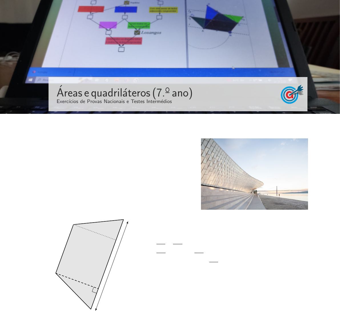 Áreas e quadriláteros (7.º ano) Exerćıcios de Provas Nacionais e Testes Intermédios 1. A figura ao lado é uma fotografia da fachada do Museu de Arte, Arquitetura e Tecnologia (MAAT), situado na frente ribeirinha da zona histórica de Belém, em Lisboa. Na figura abaixo, está representado um esquema, que não está desenhado à escala, de um dos azulejos da fachada do museu. B P C A D 32 cm E 28 cm 59 cm Relativamente ao esquema, sabe-se que: • [ABCD] é um trapézio; • AB = CD; • AD = 32 cm e BC = 59 cm • a altura do trapézio, AE, é igual a 28 cm. Qual é a área do trapézio [ABCD], representado n o esquema da figura acima? Mostra como chegaste à tua resposta e apresenta o resultado em cent́ımetros. Prova de Aferição 8.º ano - 2023 mat.absolutamente.net 2. Na figura seguinte, está representado o trapézio [ABCD], retângulo no vértice A e de bases [AB] e [DC]. Sabe-se que: • AB = 15 cm; • DC = 7 cm; • AD = 6 cm. A figura não está desenhada à escala. A B CD 15 cm 6 cm 7 cm Assinala a área do trapézio [ABCD], em cent́ımetros quadrados. (A) 36 (B) 52 (C) 66 (D) 90 Instrumento de Aferição Amostral, 8.º ano - 2021 3. Uma horta plana tem a forma de um trapézio retângulo. O trapézio [ABCD] da figura seguinte, de bases [AB] e [DC], retângulo em A, é um esquema da horta. Sabe-se que: • AB = 20 m; • DC = 12 m; • AD = 6 m. A D C B20 m 6 m 12 m Qual das seguintes expressões representa a área, em m 2 , da horta? (A) 20 + 12 2 → 6 (B) 20→ 12 2 + 6 (C) 20 + 6 2 → 12 (D) 20→ 6 2 + 12 Prova de Aferição 8.º ano - 2018 4. Na figura ao, está representado o trapézio retângulo [ABCD]. O ponto E pertence ao lado [AB] . Sabe-se que: • AE = 1 3 AB ; • EB = DC ; • a área do trapézio [ABCD] é 20 cm 2 . A E D B C Qual é a área da região representada a sombreado? (A) 10 cm 2 (B) 12 cm 2 (C) 14 cm 2 (D) 16 cm 2 Teste Intermédio 9.º ano – 07.02.2011 2/4 http://mat.absolutamente.net/joomla/index.php/recursos/fichas-de-trabalho/3-ciclo#8-ano mat.absolutamente.net 5. Na figura ao lado, está representado o quadrado [ABCD] Sabe-se que: • O lado do quadrado é 10 • E, F , G e H são os pontos médios dos lados [AB], [BC], [CD] e [DA], respetivamente. Qual é a área da região sombreada [AEFCGH]? H C A D E B F G (A) 100 (B) 75 (C) 50 (D) 45 Teste Intermédio 9.º ano – 03.02.2010 6. Na figura ao lado sabe-se que: • [ACDF ] é um quadrado de lado 4. • B é o ponto médio do segmento de reta [AC]. • EF = 1 Qual é a área da região sombreada? Mostra como chegaste à tua resposta. D B A C E F Teste Intermédio 8.º ano – 30.04.2009 7. Na figura ao lado está representada uma circunferência de centro O, em que está inscrito um pentágono regular [PQRST ]. Sabe-se que: • a circunferência tem raio 5; • o triângulo [SOR] tem área 12. Determina a área da zona sombreada a cinzento na figura. Apresenta todos os cálculos que efetuares e indica o resultado arre- dondado às décimas. Q S P R T O Teste Intermédio 9.º ano – 07.05.2008 8. Considera a figura ao lado, onde: • G é um ponto do segmento de reta [BF ]; • [ABGH] é um quadrado; • [BCEF ] é um quadrado; • AH = 6 e FG = 2. Como se designa o quadrilátero [ACDG] ? Não justifiques a tua resposta. C G E BA H D F Teste Intermédio 8.º ano – 30.04.2008 3/4 http://mat.absolutamente.net/joomla/index.php/recursos/fichas-de-trabalho/3-ciclo#8-ano mat.absolutamente.net 9. Considera a figura ao lado, onde: • [ABFG] é um quadrado de área 36; • [BCDE] é um quadrado de área 64; • F é um ponto do segmento de reta [BE]. Qual é a área total das zonas sombreadas da figura? (A) 64 (B) 66 (C) 68 (D) 70 E F DA C G B Teste Intermédio 9.º ano – 31.01.2008 4/4 http://mat.absolutamente.net/joomla/index.php/recursos/fichas-de-trabalho/3-ciclo#8-ano