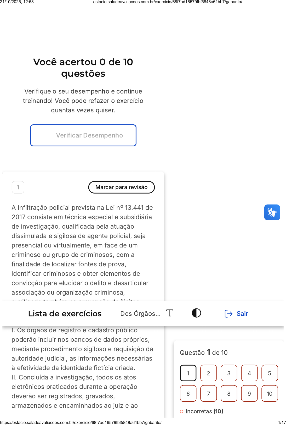 Você acertou 0 de 10 questões Verifique o seu desempenho e continue treinando! Você pode refazer o exercício quantas vezes quiser. Verificar Desempenho 1 Marcar para revisão A infiltração policial prevista na Lei nº 13.441 de 2017 consiste em técnica especial e subsidiária de investigação, qualificada pela atuação dissimulada e sigilosa de agente policial, seja presencial ou virtualmente, em face de um criminoso ou grupo de criminosos, com a finalidade de localizar fontes de prova, identificar criminosos e obter elementos de convicção para elucidar o delito e desarticular associação ou organização criminosa, auxiliando também na prevenção de ilícitos penais. Sobre o tema, analise os itens a seguir e, em seguida, assinale a alternativa correta. I. Os órgãos de registro e cadastro público poderão incluir nos bancos de dados próprios, mediante procedimento sigiloso e requisição da autoridade judicial, as informações necessárias à efetividade da identidade fictícia criada. II. Concluída a investigação, todos os atos eletrônicos praticados durante a operação deverão ser registrados, gravados, armazenados e encaminhados ao juiz e ao Questão 1 de 10 Incorretas (10) 1 2 3 4 5 6 7 8 9 10 Lista de exercícios Dos Órgãos… Sair 21/10/2025, 12:58 estacio.saladeavaliacoes.com.br/exercicio/68f7ad16579fbf5848a61bb7/gabarito/ https://estacio.saladeavaliacoes.com.br/exercicio/68f7ad16579fbf5848a61bb7/gabarito/ 1/17 A B C D E Ministério Público, juntamente com relatório circunstanciado. III. Não comete crime o policial que oculta a sua identidade para, por meio da internet, colher indícios de autoria e materialidade de crimes sexuais praticados contra menores. IV. A autoridade judicial e o Ministério Público poderão requisitar relatórios parciais da operação de infiltração antes de seu término. V. Consideram-se dados de conexão as informações referentes a nome e endereço de assinante ou de usuário registrado ou autenticado para a conexão a quem endereço de IP, identificação de usuário ou código de acesso tenha sido atribuído no momento da conexão. Apenas os itens III e IV estão corretos. Apenas os itens III, IV e V estão corretos. Apenas os itens II, IV e V estão corretos. Apenas os itens II, III e V estão corretos. Apenas os itens I, II, III e IV estão corretos. Resposta incorreta Opa! A alternativa correta é a letra E. Confira o gabarito comentado! Gabarito Comentado Em branco (0) 21/10/2025, 12:58 estacio.saladeavaliacoes.com.br/exercicio/68f7ad16579fbf5848a61bb7/gabarito/ https://estacio.saladeavaliacoes.com.br/exercicio/68f7ad16579fbf5848a61bb7/gabarito/ 2/17 Segundo o art. 190-A, § 2º, II do ECA, consideram-se dados cadastrais as informações referentes a nome e endereço de assinante ou de usuário registrado ou autenticado para a conexão a quem endereço de IP, identificação de usuário ou código de acesso tenha sido atribuído no momento da conexão. Os demais itens I, II, III e IV estão em conformidade com as disposições legais. 2 Marcar para revisão (Prefeitura de Arapiraca-AL - 2019 - Banca Própria - adaptada) Uma das formas utilizadas pelo Estatuto da Criança e do Adolescente (Lei nº 8.069/90) para ampliar sua proteção foi a tipificação de crimes e infrações administrativas. Analise os itens a seguir e, em seguida, assinale a alternativa que apresenta crimes tipificados pelo Estatuto. I. Deixar o encarregado do serviço ou o dirigente do estabelecimento de atenção à saúde de gestante responsável por manter registro das atividades desenvolvidas, na forma e prazo referidos no art. 10 do ECA, bem como deixar de fornecer à parturiente ou a seu responsável, por ocasião da alta médica, declaração de nascimento, em que constem as intercorrências do parto e do desenvolvimento do neonato. II. Privar a criança ou o adolescente de sua liberdade, procedendo à sua apreensão sem estar em flagrante de ato infracional ou inexistindo ordem escrita da autoridade judiciária competente. III. Divulgar, total ou parcialmente, sem autorização devida, por qualquer meio de comunicação, nome, ato ou documento de procedimento policial, administrativo ou judicial 21/10/2025, 12:58 estacio.saladeavaliacoes.com.br/exercicio/68f7ad16579fbf5848a61bb7/gabarito/ https://estacio.saladeavaliacoes.com.br/exercicio/68f7ad16579fbf5848a61bb7/gabarito/ 3/17 A B C D E relativo à criança ou ao adolescente a quem se atribua ato infracional. IV. Submeter criança ou adolescente sob sua autoridade, guarda ou vigilância a vexame ou a constrangimento. V. Subtrair criança ou adolescente ao poder de quem o tem sob sua guarda, em virtude de lei ou ordem judicial, com o fim de colocação em lar substituto. Apenas os itens III e IV estão corretos. Apenas os itens I, III, IV e V estão corretos. Apenas os itens I, II, IV e V estão corretos. Apenas os itens II, III e V estão corretos. Apenas os itens I, III e IV estão corretos. Resposta incorreta Opa! A alternativa correta é a letra C. Confira o gabarito comentado! Gabarito Comentado Segundo o art. 247 do ECA, constitui infração administrativa - e não crime - divulgar, total ou parcialmente, sem autorização devida, por qualquer meio de comunicação, nome, ato ou documento de procedimento policial, administrativo ou judicial relativo à criança ou adolescente a 21/10/2025, 12:58 estacio.saladeavaliacoes.com.br/exercicio/68f7ad16579fbf5848a61bb7/gabarito/ https://estacio.saladeavaliacoes.com.br/exercicio/68f7ad16579fbf5848a61bb7/gabarito/ 4/17 A B C D E que se atribua ato infracional. Os demais itens estão corretos. 3 Marcar para revisão Segundo o STJ, deve-se sempre levar em consideração o princípio do melhor interesse da criança, sendo até mesmo possível afastar alguns princípios processuais em homenagem ao primeiro. Diante disso, marque a opção que apresenta corretamente um princípio processual em que a jurisprudência do STJ admite seu afastamento.