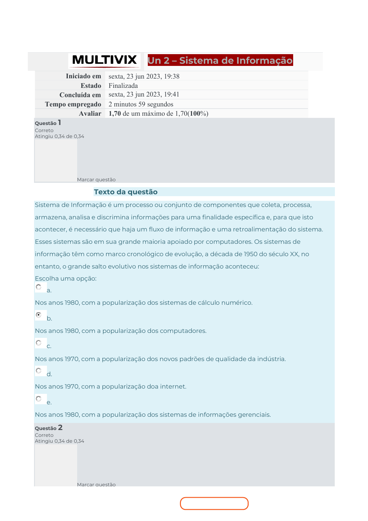 Impresso por lucas_a.teixeira, E-mail lucas_a.teixeira@hotmail.com para uso pessoal e privado. Este material pode ser protegido por direitos autorais e não pode ser reproduzido ou repassado para terceiros. 22/10/2025, 15:52:57 Un 2 – Sistema de Informação Iniciado em sexta, 23 jun 2023, 19:38 Estado Finalizada Concluída em sexta, 23 jun 2023, 19:41 Tempo empregado 2 minutos 59 segundos Avaliar 1,70 de um máximo de 1,70( 100%) Questão 1 Correto Atingiu 0,34 de 0,34 Marcar questão Texto da questão Sistema de Informação é um processo ou conjunto de componentes que coleta, processa, armazena, analisa e discrimina informações para uma finalidade específica e, para que isto acontecer, é necessário que haja um fluxo de informação e uma retroalimentação do sistema. Esses sistemas são em sua grande maioria apoiado por computadores. Os sistemas de informação têm como marco cronológico de evolução, a década de 1950 do século XX, no entanto, o grande salto evolutivo nos sistemas de informação aconteceu: Escolha uma opção: a. Nos anos 1980, com a popularização dos sistemas de cálculo numérico. b. Nos anos 1980, com a popularização dos computadores. c. Nos anos 1970, com a popularização dos novos padrões de qualidade da indústria. d. Nos anos 1970, com a popularização doa internet. e. Nos anos 1980, com a popularização dos sistemas de informações gerenciais. Questão 2 Correto Atingiu 0,34 de 0,34 Marcar questão Acesso vitalício + 1 ano de benefícios! Aproveitar oferta Impresso por lucas_a.teixeira, E-mail lucas_a.teixeira@hotmail.com para uso pessoal e privado. Este material pode ser protegido por direitos autorais e não pode ser reproduzido ou repassado para terceiros. 22/10/2025, 15:52:57 Texto da questão A partir do conhecimento construído sobre Dados, Informação e Conhecimento, avalie as assertivas a seguir e a relação proposta entre elas. (1) A medida que novas tecnologias para registro e processamento de informação iam surgindo no século XX, a necessidade sobre o entendimento e manipulação dos sistemas foram sendo incorporadas aos equipamentos. PORQUE (2) Levou a uma profunda revolução na capacidade de registrar, processar, disseminar e buscar informações, o que ocasionou, por sua vez, mudanças ainda mais profundas na vida das pessoas e das organizações empresariais e governanças coorporativas. A respeito dessas duas assertivas, assinale a opção correta. Escolha uma opção: a. As duas assertivas são verdadeiras e a segunda justifica a primeira. b. A primeira assertiva é verdadeira e a segunda é falsa. c. As duas assertivas são verdadeiras e a segunda não justifica a primeira. d. A primeira assertiva é falsa e a segunda é verdadeira. e. As duas assertivas são falsas. Questão 3 Correto Atingiu 0,34 de 0,34 Marcar questão Texto da questão A evolução dos sistemas da informação foi um grande passo para o mundo tecnológico, analise as assertivas a seguir e a relação proposta entre elas. (1) Com a evolução tecnológica, a abordagem sistêmica da informação começou a ser uma tendência e uma necessidade nas organizações. Acesso vitalício + 1 ano de benefícios! Aproveitar oferta Impresso por lucas_a.teixeira, E-mail lucas_a.teixeira@hotmail.com para uso pessoal e privado. Este material pode ser protegido por direitos autorais e não pode ser reproduzido ou repassado para terceiros. 22/10/2025, 15:52:57 PORQUE (2) Os Sistemas de Informação vieram a dar ao computador uma nova dimensão, transformando-o de mero processador de dados em elemento preponderante na racionalização e na dinamização do trabalho na empresa. A respeito dessas duas assertivas, assinale a opção correta. Escolha uma opção: a. As duas assertivas são verdadeiras e a segunda não justifica a primeira. b. As duas assertivas são falsas. c. A primeira assertiva é falsa e a segunda é verdadeira. d. As duas assertivas são verdadeiras e a segunda justifica a primeira. e. A primeira assertiva é verdadeira e a segunda é falsa. Questão 4 Correto Atingiu 0,34 de 0,34 Marcar questão Texto da questão A partir dos conhecimentos adquiridos sobre Sistemas de Informação, analise as afirmativas: I - Os sistemas de informação baseados em computador visam melhorar os processos de conhecimento, avaliação e gestão. II - Os Sistemas de informação computadorizados bem-sucedidos agregam informações da empresa e as organizam de maneira a permitir o acesso e a geração de relatórios tais como padrão de comportamento e perfil de clientes e tendências de mercado. III - Os sistemas de informação são projetados para trabalhar a integração das informações, se limitando a executar funções específicas como processamento de pedidos e de dados. Acesso vitalício + 1 ano de benefícios! Aproveitar oferta Impresso por lucas_a.teixeira, E-mail lucas_a.teixeira@hotmail.com para uso pessoal e privado. Este material pode ser protegido por direitos autorais e não pode ser reproduzido ou repassado para terceiros. 22/10/2025, 15:52:57 Após a avaliação, assinale a resposta correta. Escolha uma opção: a. As afirmativas II e III estão certas. b. Apenas a afirmativa I está certa. c. As afirmativas I e II estão certas. d. Apenas a afirmativa III está certa. e. As afirmativas I e III estão certas. Questão 5 Correto Atingiu 0,34 de 0,34 Marcar questão Texto da questão Os sistemas de informação apresentam aspectos internos e externos. Neste sentido, analise as afirmativas a seguir que dizem respeito exclusivamente aos aspectos internos dos Sistemas de Informação implantados em uma organização: I - Os aspectos internos referem-se especificamente às questões de tecnologia e materiais. II – Software e hardware são exemplos de aspectos internos. III – O processo de tomada de decisão e de definição de preço, como referem-se aos aspectos internos, dependem da estrutura montada pela empresa para suportar um sistema de i