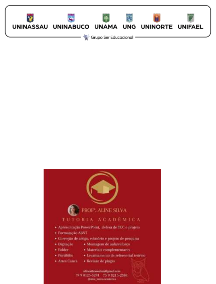 Provas – correções - mapas – atividades contextualizadas – relatórios – apresentações etc 75 9 8215-2384 @aline_tutoria.academica TCC 1 e 2 – Direito Tema Educação inclusiva: práticas pedagógicas para alunos com TEA no ensino regular. UNOPAR – ANHANGUERA – PITÁGORAS- UNINTER – UNICESUMAR – UNIASSELVI- UNAMA – UNIRB – UNIFAEL – UNG – UNICESUMAR