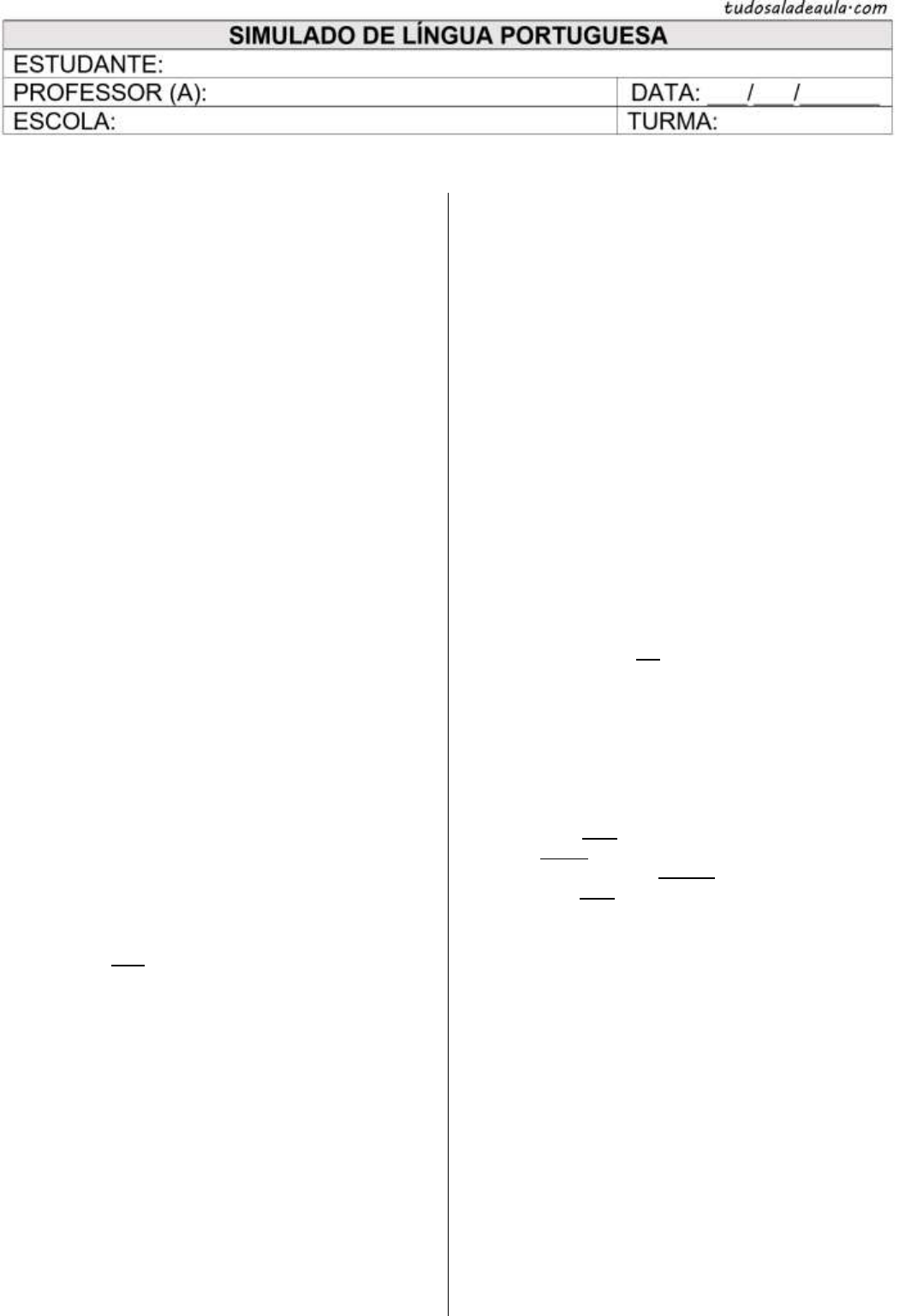 D2: Estabelecer relações entre partes de um texto, identificando repetições ou substituições que contribuem para a continuidade de um texto. Leia o texto. Por que todo mundo usava peruca na Europa dos séculos XVII e XVIII? Não era todo mundo, apenas os aristocratas. A moda começou com Luís XIV (1638-1715), rei da França. Durante seu governo, o monarca adotou a peruca pelo mesmo motivo que muita gente usa o acessório ainda hoje: esconder a calvície. O resto da nobreza gostou da ideia e o costume pegou. A peruca passou a indicar, então, as diferenças sociais entre as classes, tornando-se sinal de status e prestígio. Também era comum espalhar talco ou farinha de trigo sobre as cabeleiras falsas para imitar o cabelo branco dos idosos. Mas, por mais elegante que parecesse ao pessoal da época, a moda das perucas também era nojenta. “Proliferava todo tipo de bicho, de baratas a camundongos, nesses cabelos postiços”, afirma o estilista João Braga, professor de História da Moda das Faculdades SENAC, em São Paulo. Em 1789, com a Revolução Francesa, veio a guilhotina, que extirpou a maioria das cabeças com perucas. Símbolo de uma nobreza que se desejava exterminar, elas logo caíram em desuso. Sua origem, porém, era muito mais velha do que a monarquia francesa. No Egito antigo, homens e mulheres de todas as classes sociais já exibiam adornos de fibra de papiro – na verdade, disfarce para as cabeças raspadas por causa de uma epidemia de piolhos. Hoje, as perucas de cachos brancos, típicas da nobreza europeia, sobrevivem apenas nos tribunais ingleses, onde compõem a indumentária oficial dos juízes. Fonte: http://valdinere123.blogspot.com/2015/07/d2-estabelecer- relacoes-entre-partes-de.html. Acesso em 07 abr 2020. 1. No trecho: “elas logo caíram em desuso”, a palavra destacada se refere a a) adornos. b) aristocratas. c) cabeleiras. d) perucas. Leia o texto. O PORCO, A CABRA E O CARNEIRO Uma cabra, um carneiro e um porco gordo, Juntos num carro, iam à feira. Creio Que todo meu leitor será de acordo Que não davam por gosto esse passeio. O porco ia em grandíssimo berreiro Ensurdecendo a gente que passava; E tanto um como outro companheiro Daquela berraria se espantava. Diz o carneiro ao porco: - Por que gritas, Animal, inimigo da limpeza? Por que, trombudo bruto, não imitas Dos companheiros teus a sisudeza? - Sisudos, dizes?!... Quer-me parecer Que não têm a cabeça muito sã Porque pensam que apenas vão perder, A cabra o leite, o companheiro a lã. Mas eu, que sirvo só para a lambança, Envio um terno adeus ao meu chiqueiro... Pois cuido que à goela já me avança O agudo facalhão do salsicheiro! Pensava sabiamente este cochino, Mas pra que, pergunto eu? Se o mal é certo, É surdo as nossas queixas o destino; E o que menos prevê é o mais esperto. Jean de La Fontaine 2. No trecho: “Quer-me parecer”, a palavra grifada se refere a) ao carneiro. b) ao porco. c) à cabra. d) à cabeça. 3. O trecho cuja palavra destacada se refere ao porco é: a) “Juntos num carro, iam à feira. Creio” b) “É surdo as nossas queixas o destino.” c) “- Por que gritas, Animal, inimigo da limpeza? d) “Que todo meu leitor será de acordo.” Leia o texto. CABELO NO PENTE Canção de Alceu Valença Refrão Ah, iaiá, ô ioioiô Ah, iaiá, eu também quero, quero pisar na fulô Andei pisando pelas ruas do passado Criando calo no meu pé caminhador Dançando xote, tropecei com harmonia Na melodia de Pisa na Fulô. Andei passando como as águas, como o vento Como todo sofrimento que enfim me calejou Terei futuro deslizando no presente Como cabelo no pente que penteia meu amor Feito cabelo no pente que penteia meu amor Como cabelo no pente que penteia meu amor Fonte: https://www.letras.mus.br/alceu-valenca/188410/ 4. No verso: “Feito cabelo no pente que penteia meu amor”, a expressão grifada se refere a) ao pente. b) ao cabelo. c) ao amor. d) ao presente. Observe a tirinha a seguir. Fonte: https://vacilandia.com/ra-zinza-quanto-uma-tirinha-tem-que- ser-boa/. Acesso em 7 abr 2020. 5. No trecho: “Ela teria que ser perfeita”. A palavra destacada se refere à a) tela. b) timeline. c) tirinha. d) trabalheira. Leia o texto. MURMÚRIOS INAUDÍVEIS Marina Vasconcelos Sento-me no chão do quarto E me permito finalmente sentir. Libero meu lado mais vulnerável Depois de há tanto o reprimir. O que sinto já não reconheço, Então na escrita o tento definir. Mergulho em meu próprio caos Na tentativa de o entender, Mas lentamente sou sufocada, Meu corpo não pode se mover. O silêncio quebra meus ossos, O frio vazio congela meu ser, De minha boca saem murmúrios De tudo o que nunca pude dizer. Todas as palavras não ditas Adormecidas em meu peito, Acumularam-se até transbordar, Tornando meu coração estreito, De onde saem gritos de desilusão E um choro iminente insatisfeito. Marina Vasconcelos (Estudante do Ensino Médio, Acaraú-CE, 2023) 6. Em: “Depois de há tanto o reprimir”, o termo grifado se refere, no poema, a um a) sentimento. b) desejo utópico. c) elemento físico. d) hábito contínuo. 7. No verso: “Acumularam-se até transbordar”. O termo destacado refere-se a) aos gritos de desilusão. b) as palavras não ditas. c) ao frio vazio. d) ao silêncio. Leia o texto abaixo. A decadência do Ocidente O doutor ganhou uma galinha viva e chegou em casa com ela, para alegria de toda a família. O filho mais moço, inclusive, nunca tinha visto uma galinha viva de perto. Já tinha até um nome para ela – Margarete – e planos para adotá-la, quando ouviu do pai que a galinha seria, obviamente, comida. – Comida?! – Sim, senhor. – Mas se come ela? – Ué. Você está cansado de comer galinha. – Mas a galinha que a gente come é igual a esta aqui? – Claro. Na verdade, o guri gostava muito de peito, de coxa e de asas, mas nunca tinha ligado as partes do animal. Ainda mais aquele animal vivo ali no meio do apartamento. O doutor disse que que