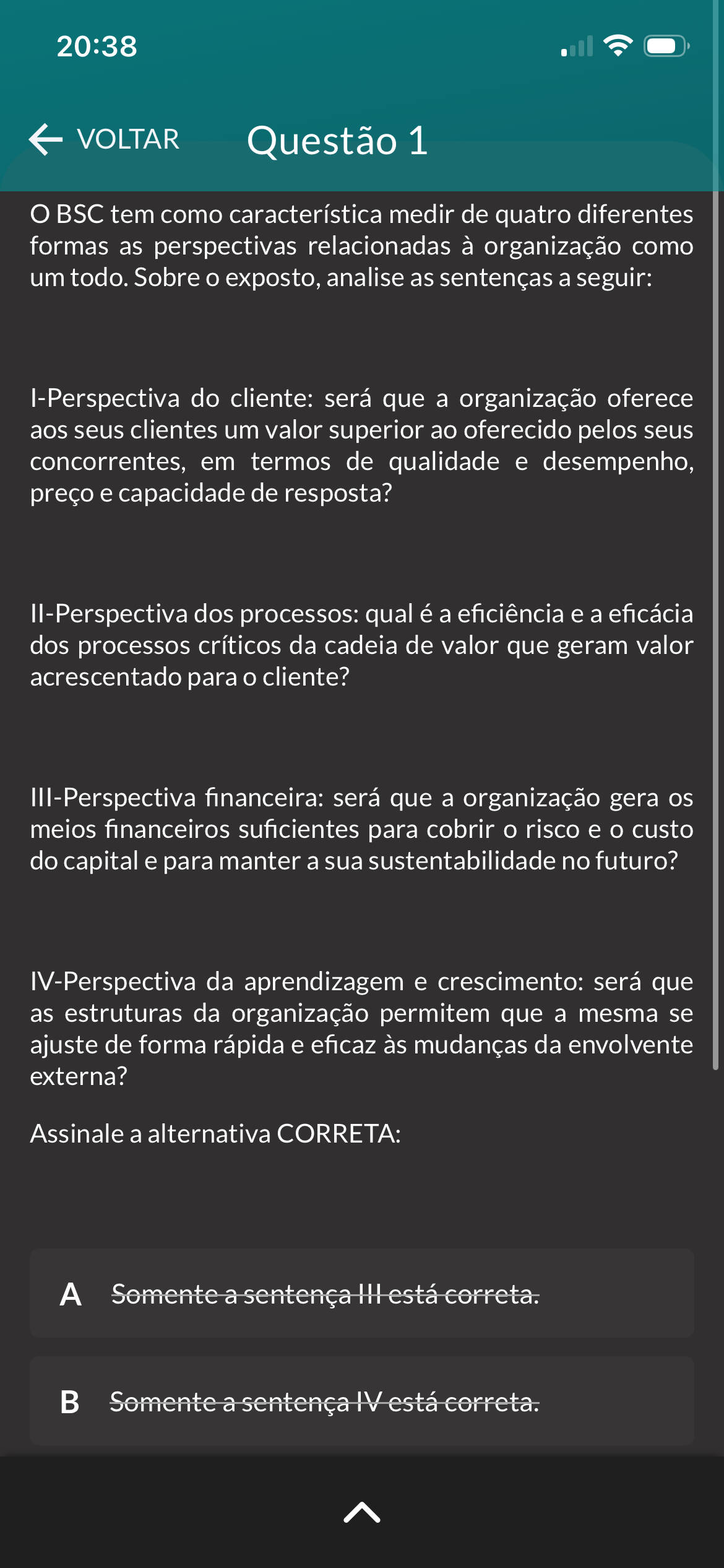 20:38 VOLTAR Questão 1 BSC tem como característica medir de quatro diferentes formas as perspectivas relacionadas à organização como um todo. Sobre exposto, analise as sentenças a seguir: I-Perspectiva do cliente: será que a organização oferece aos seus clientes um valor superior ao oferecido pelos seus concorrentes, em termos de qualidade e desempenho, preço e capacidade de resposta? II-Perspectiva dos processos: qual é a eficiência e a eficácia dos processos críticos da cadeia de valor que geram valor acrescentado para cliente? III-Perspectiva financeira: será que a organização gera os meios financeiros suficientes para cobrir risco e custo do capital e para manter a sua sustentabilidade no futuro? IV-Perspectiva da aprendizagem e crescimento: será que as estruturas da organização permitem que a mesma se ajuste de forma rápida e eficaz às mudanças da envolvente externa? Assinale a alternativa CORRETA: A Somente a sentença III está correta. Somente a sentença IV está correta.