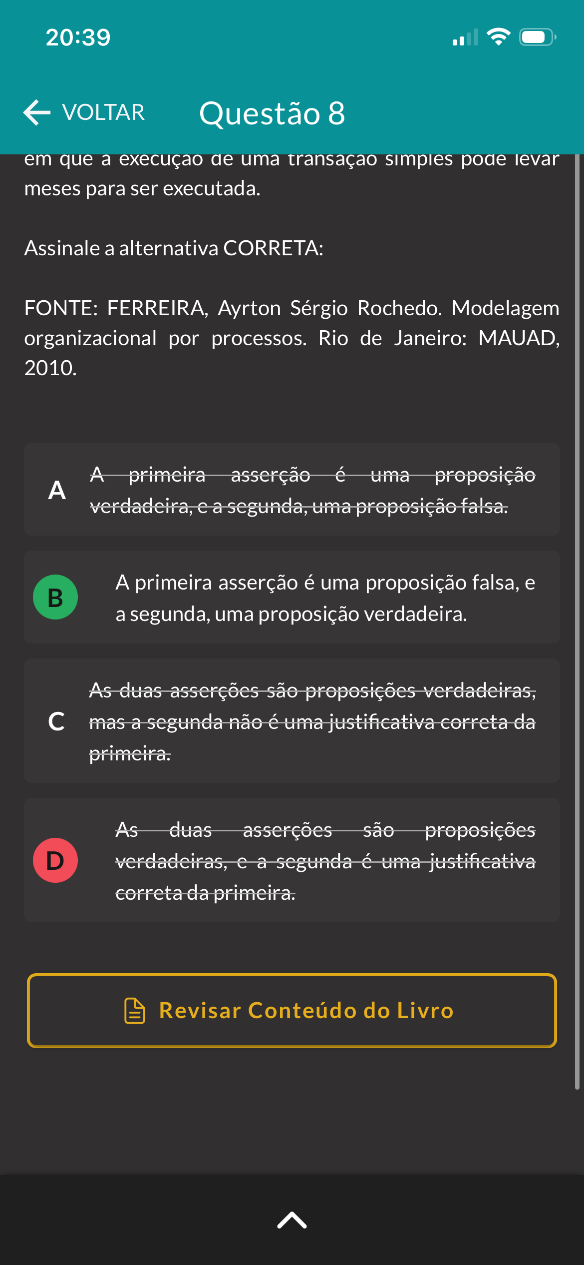 20:39 VOLTAR Questão 8 em que a de uma transaçao simples pode levar meses para ser executada. Assinale a alternativa CORRETA: FONTE: FERREIRA, Ayrton Sérgio Rochedo. Modelagem organizacional por processos. Rio de Janeiro: MAUAD, 2010. A primeira asserção é uma proposição A verdadeira, segunda, uma proposição falsa. A primeira asserção é uma proposição falsa, e B a segunda, uma proposição verdadeira. As duas asserções são proposições verdadeiras, c mas a segunda não é uma justificativa correta da primeira. As duas asserções são proposições D verdadeiras, e a segunda é uma justificativa correta da primeira. Revisar Conteúdo do Livro