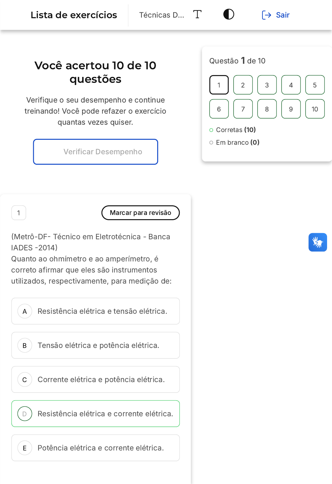 Você acertou 10 de 10 questões Verifique o seu desempenho e continue treinando! Você pode refazer o exercício quantas vezes quiser. Verificar Desempenho A B C D E 1 Marcar para revisão (Metrô-DF- Técnico em Eletrotécnica - Banca IADES -2014) Quanto ao ohmímetro e ao amperímetro, é correto afirmar que eles são instrumentos utilizados, respectivamente, para medição de: Resistência elétrica e tensão elétrica. Tensão elétrica e potência elétrica. Corrente elétrica e potência elétrica. Resistência elétrica e corrente elétrica. Potência elétrica e corrente elétrica. Questão 1 de 10 Corretas (10) Em branco (0) 1 2 3 4 5 6 7 8 9 10 Lista de exercícios Técnicas D… Sair A B C Resposta correta Parabéns, você selecionou a alternativa correta. Confira o gabarito comentado! Gabarito Comentado O ohmímetro é um instrumento utilizado para medir a resistência elétrica, enquanto o amperímetro é usado para medir a corrente elétrica. Portanto, a alternativa correta é a "D", que afirma que o ohmímetro e o amperímetro são usados, respectivamente, para medir a resistência elétrica e a corrente elétrica. 2 Marcar para revisão (Companhia de Águas e Esgoto do Estado de Rondônia - Engenharia Elétrica - FUNCAB, 2012) O equipamento destinado a interromper, de modo visível, a continuidade metálica de um determinado circuito é: O relé de ação direta. A chave seccionadora primária. O disjuntor de potência. D E O fusível limitador de corrente. A bucha de passagem para uso externo-interno. Resposta correta Parabéns, você selecionou a alternativa correta. Confira o gabarito comentado! Gabarito Comentado A chave seccionadora primária é o equipamento que interrompe, de maneira visível, a continuidade metálica de um circuito. Ela é utilizada para isolar seções de um sistema elétrico, permitindo que os trabalhos de manutenção sejam realizados com segurança. Diferentemente de outros dispositivos, como o disjuntor de potência ou o fusível limitador de corrente, a chave seccionadora não é projetada para interromper uma corrente de curto-circuito ou de carga, mas sim para garantir uma separação visível entre as partes isoladas e energizadas do sistema. Portanto, a alternativa correta é a B. 3 Marcar para revisão (FGV/2013) A chave estrela-delta para a partida de motores trifásicos alterna a configuração dos enrolamentos desses motores a fim de diminuir a corrente de partida. Para um dado motor, a corrente de partida é oito vezes a corrente nominal. Sabendo-se que essa corrente de partida é igual a I, pode-se dizer A B C D E que, na configuração delta, a corrente nominal será igual a: ( ×I)/8√3 ×I√3 I/8 I 1/√3 Resposta correta Parabéns, você selecionou a alternativa correta. Confira o gabarito comentado! Gabarito Comentado Para entender a resposta correta, é importante compreender o funcionamento da chave estrela-delta em motores trifásicos. A chave alterna a configuração dos enrolamentos do motor para reduzir a corrente de partida. No enunciado, é dito que a corrente de partida é oito vezes a corrente nominal e que essa corrente de partida é igual a I. Na configuração delta, a corrente de partida é igual a raiz de 3 vezes I. Portanto, para encontrar a corrente nominal (In), dividimos a corrente de partida em delta por 8. Isso nos dá a seguinte equação: In = (raiz(3)*I)/8. A B C D E Portanto, na configuração delta, a corrente nominal será igual a ( ×I)/8, que é a alternativa A. √3 4 Marcar para revisão Dispositivo de proteção caracterizado por uma curva tempo x corrente, em que o disparo instantâneo ocorre somente quando a corrente do circuito atinge entre 10 a 20 vezes. Seu valor nominal é: Disjuntor termomagnético tipo B. Disjuntor termomagnético tipo D. Disjuntor diferencial residual tipo C. Fusível NEOZED tipo A. Fusível DIAZED tipo B. Resposta correta Parabéns, você selecionou a alternativa correta. Confira o gabarito comentado! Gabarito Comentado O dispositivo de proteção descrito no enunciado é o Disjuntor termomagnético tipo D. Este tipo de disjuntor é caracterizado por uma curva tempo x A B C D E corrente, onde o disparo instantâneo ocorre somente quando a corrente do circuito atinge entre 10 a 20 vezes o valor nominal. Portanto, a alternativa correta é a letra B. 5 Marcar para revisão (Universidade Federal do Piauí - Técnico em Eletromecânica - COPESE-UFPI - 2017) Sobre as conexões de condutores elétricos entre si e com outros componentes da instalação, é CORRETO afirmar que: A conexão entre cobre e alumínio deve ser realizada exclusivamente por meio de conectores adequados a este fim. Emendas de cabos enterrados devem ser acessíveis para verificação, ensaio e manutenção. A solda a estanho pode ser utilizada na terminação dos condutores, para conectá-los a bornes ou terminais de dispositivos ou equipamentos elétricos. Em condutores de alumínio, não são permitidas as emendas por meio de conectores por compressão. A pressão de contato de uma conexão depende do material isolante. Resposta correta Parabéns, você selecionou a alternativa correta. Confira o gabarito comentado! Gabarito Comentado A alternativa correta é a A, que afirma que a conexão entre cobre e alumínio deve ser realizada exclusivamente por meio de conectores adequados a este fim. Isso ocorre porque o cobre e o alumínio são metais diferentes e, quando entram em contato direto, podem ocorrer reações químicas que levam à corrosão. Portanto, para evitar isso, é necessário usar conectores adequados que evitem o contato direto entre esses dois metais. 6 Marcar para revisão (Defensoria Pública do Estado de São Paulo - Engenheiro Eletricista - FCC - 2013) Sobre dispositivos de proteção em instalações elétricas prediais, analise as proposições a seguir: I. Quando a corrente de projeto é superior à maior corrente nominal de disjuntores termomagnéticos comerciais, deve-se subst