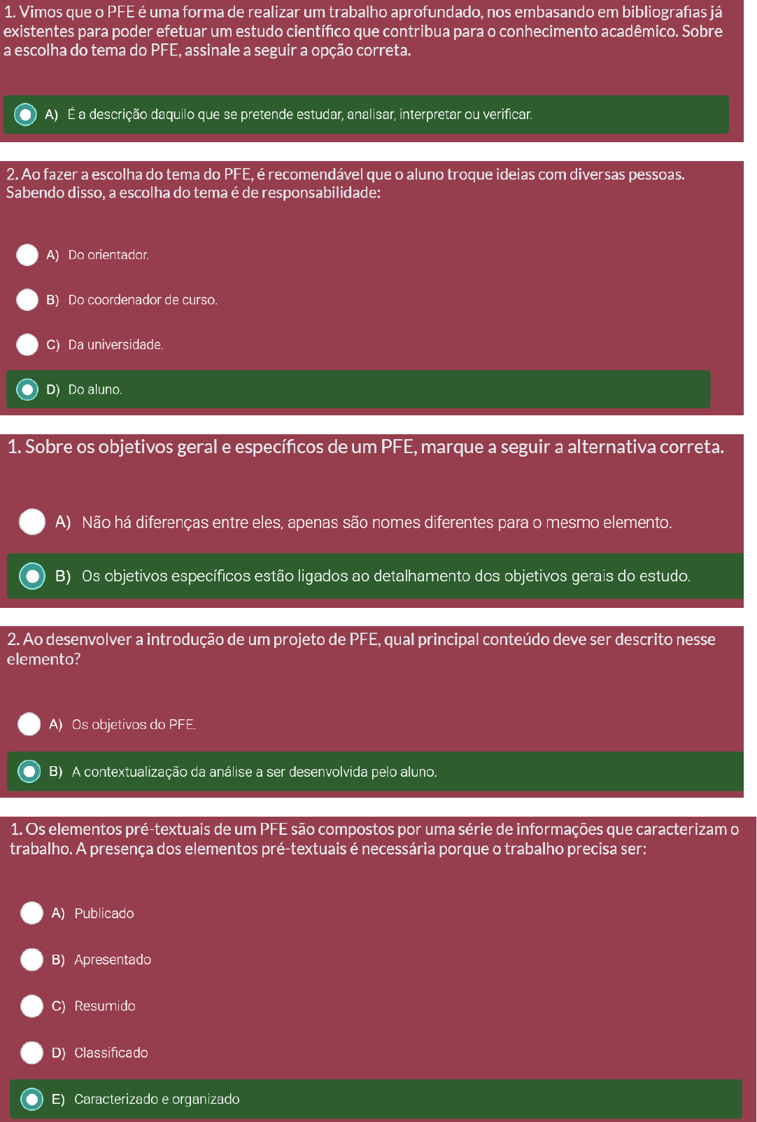 Questão 1 Sobre o conceito de pesquisa estudado neste material, considere as seguintes afirmações: I. A pesquisa não é uma ação isolada, mas uma oportunidade de fazer exercícios que servirão por toda a vida. II. O autêntico pesquisador compreende a pesquisa como um jogo que lhe proporciona a criatividade e o desenvolvimento do olhar científico. III. Ainda que o objeto não seja ou não pareça interessante, é preciso que o trabalho do pesquisador seja instigante. IV. Não é qualquer tema ou assunto da atualidade que pode ser objeto de uma pesquisa científica. V. Mesmo temas do cotidiano e banais, dependendo da experiência do pesquisador, podem se tornar grandes e profundas pesquisas. Está correto o que se afirma em Para este pensador, os fatos sociais somente podem ser explicados por outros fatos sociais e não por explicações psicológicas ou biológicas, diferenciando-se de muitos outros pensadores de sua época. A adoção do método científico nas ciências sociais tem, com certeza, a sua influência direta e determinante. Esse pensador é Este pensador não aceitava a generalização na compreensão dos fenômenos. Por isso, afirmava que o método quantitativo defendido pelo positivismo somente poderia ser proveitoso se não obscurecesse a compreensão. Afirma ele em seu livro Metodologia das ciências sociais (2001): “Não há um ‘agir racional’ sem a experimentação de regras referentes ao decurso histórico que apenas podem ser percebidas e elaboradas mediante uma percepção e observação objetivantes”. Este pensador é: Os instrumentos de pesquisa funcionam como recursos que ajudam o pesquisador a se organizar ao longo de todas as etapas de seu estudo. Entre os exemplos de instrumentos citados, existe um que, de forma mais particular, irá colaborar para o acesso a informações sobre uma obra que foi lida durante a revisão de literatura, bem como citações com suas páginas e obras. Isso ajuda inclusive a organizar as referências de seu trabalho de acordo com as normas da ABNT, pois é um instrumento que propõe o registro das informações para este fim. A qual instrumento de pesquisa o enunciado está se referindo? O uso das tecnologias da informação e da comunicação tende a favorecer significativamente o acesso a alguns instrumentos de pesquisa que, cada vez mais, são ofertados de forma virtual por meio de programas, redes de buscas, softwares. O uso da internet potencializa muito o acesso a obras disponíveis virtualmente, inclusive a produção bibliográfica mais recente sobre determinado tema de pesquisa. Entretanto, é preciso ter atenção a alguns pontos para que se faça um uso consciente dessa tecnologia. Assinale a alternativa que contempla alguns pontos de atenção em relação ao uso das tecnologias, sobretudo a internet, como ferramenta de busca. Considerando o engenheiro como agente de transformação da sociedade, observe as afirmativas a seguir: I) O exercício mental da abstração não colabora para a necessária apresentação de soluções concretas para a sociedade. II) A abstração é um mecanismo que ajuda na busca por soluções de problemas relacionados à engenharia. III) Modelos representam de maneira abstrata e simplificada o mundo tangível. Está correto o que se afirma em: Considerando os desafios energéticos para a transformação da sociedade, observe as afirmativas a seguir: I) A energia limpa desejada está associada aos impactos causados no meio ambiente quando se considera a obtenção dessa energia. II) As chamadas fontes sujas são inevitáveis. O papel da engenharia está no tratamento de consequências. III) Carros elétricos necessariamente utilizam energia limpa. Está correto o que se afirma em: Considerando inovação tecnológica e empreendedorismo, observe as afirmativas a seguir: I) As inovações não estão restritas a produtos. Podem ocorrer em processos e em negócios. II) Inovações podem ocorrer simultaneamente em processos e com uso de tecnologias. III) Inovações tecnológicas estão necessariamente associadas a novos empreendimentos. Está correto o que se afirma em: Considerando inovações tecnológicas e empreendedorismo, observe as afirmativas a seguir: I) Inovações tecnológicas, muitas vezes, necessitam de investimentos em infraestrutura. Os governos federal e estadual costumam incentivar o empreendedorismo tecnológico. II) Polos de tecnologia estão localizados estritamente na região sudeste brasileira e costumam abrigar pesquisadores e empreendedores. III) Por ser um país de dimensões continentais, o Brasil dispõe de investimentos em Pesquisa e Desenvolvimento de maneira dispersa em todas as regiões. Está correto o que se afirma em: Considerando a importância das pesquisas para o desenvolvimento tecnológico, observe as afirmativas a seguir: I) As pesquisas podem ser classificadas como básica, avançada e aplicada. II) As pesquisas básicas têm necessariamente um vínculo com algum tipo de solução prática para problemas da sociedade. III) Pesquisas aplicadas e básicas podem coexistir na academia. Está correto o que se afirma em: Considerando a Pesquisa e o Desenvolvimento Tecnológico no contexto da inovação, observe as afirmativas a seguir I) As tecnologias podem ser desenvolvidas como resultado de pesquisa científica ou simplesmente como resultado de experimentações. II) Visando ao desenvolvimento tecnológico, a academia trabalha com pesquisas básicas, e as empresas com as pesquisas aplicadas. III) Considerando a efetividade da Pesquisa e Desenvolvimento Tecnológico, a capacidade de “saber fazer” é mais importante do que a de “saber o porquê”. Está correto o que se afirma em: Considerando a gestão do conhecimento e a inovação, observe as afirmativas a seguir: I) A ciência que estuda o conhecimento é a epistemologia. II) As pesquisas científicas são estruturadas na metodologia científica de acordo com os conceitos da epistem