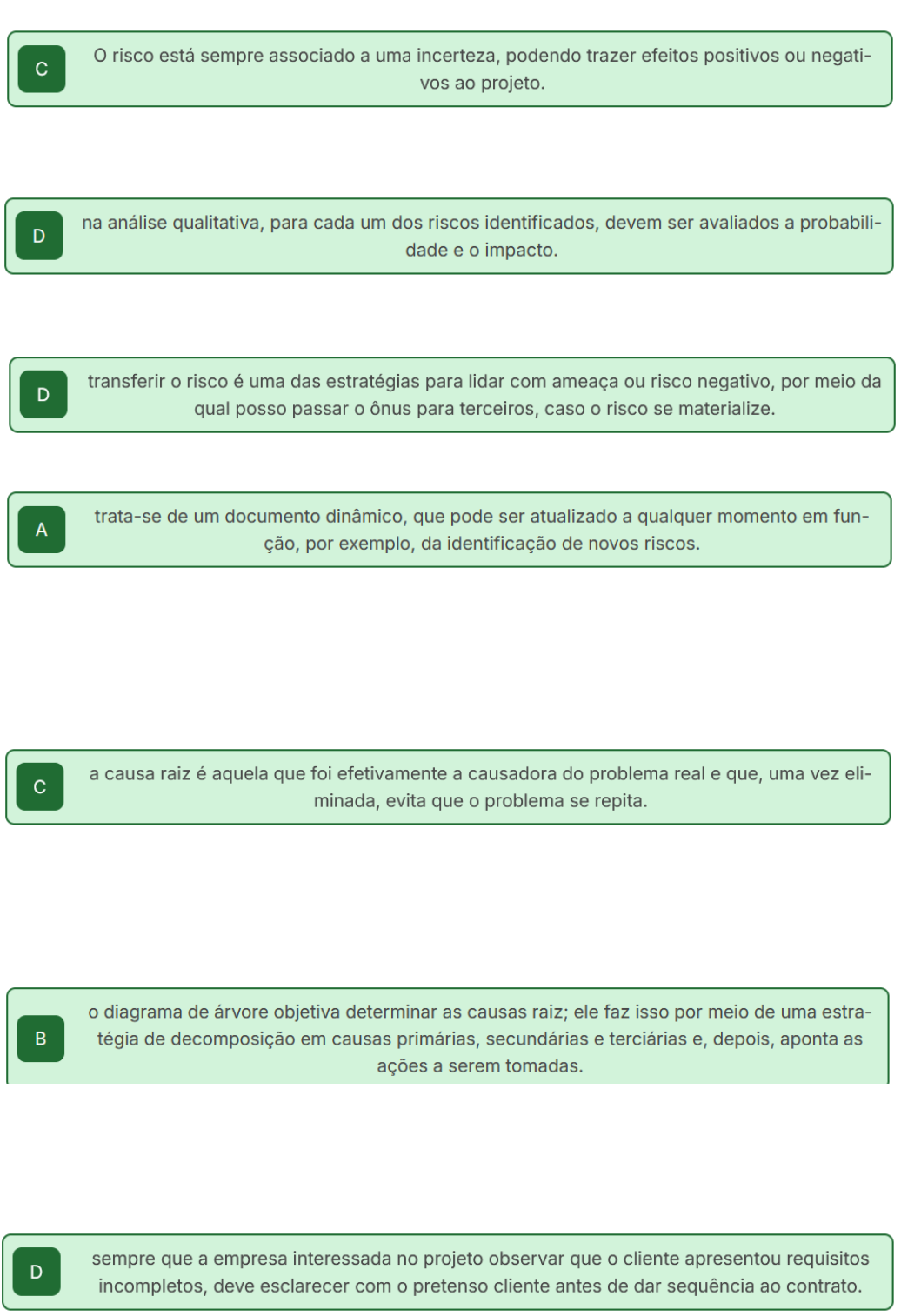 Com base na compreensão dos conceitos de risco e questão, podemos afirmar que: De acordo com o que você compreendeu neste módulo, quando falamos da análise qualitativa de riscos, podemos afirmar que: Com base na compreensão das estratégias para lidar com os riscos, podemos afirmar que: No seu entendimento, quando falamos de plano de resposta aos riscos, podemos afirmar que: Entender o que é uma não conformidade, assim como o processo de determinar a causa raiz e os mecanismos de ação preventiva e corretiva, é fundamental no processo da qualidade. Dito isto, com base na compreensão dos fundamentos e principais conceitos da qualidade, podemos afirmar que: As ferramentas da qualidade têm como propósito serem facilitadoras, entre outros, nos processos de análise, controle e melhorias. Com base no que foi apresentado, podemos afirmar que: Lidar com a qualidade no projeto significa aplicar este conceito em todas as fases.Assim, com base no que você entendeu da aplicação ao longo do projeto, podemos afirmar que: Observando que os entregáveis constituem o objeto do contrato, as ações ao longo do projeto são tomadas para que estes entregáveis sejam efetivamente aprovados pelo cliente. Podemos afirmar que a formação da equipe de um projeto é, em primeiro lugar, responsabilidade do(a) Qual técnica pode ser utilizada pelo gerente de projetos para solucionar problemas, cujo resultado é mais duradouro? Sabemos que a comunicação não verbal, aquela realizada por sinais, pode ser uma barreira na comunicação entre as pessoas. Qual percentual da mensagem é enviado por meio de sinais não verbais? Na comunicação de um projeto, quando existe algum tipo de barreira, o resultado mais provável é Considerando os seguintes parâmetros no relatório de desempenho VP (valor presente) = 4.000, VA (valor agregado) = 4.800 e CR (custo real) = 3.000, podemos afirmar que o projeto está Sobre a técnica de estimativa análoga, é correto afirmar que Assinale a opção que indica o documento que, no início do projeto de um novo serviço, é descrito na área de conhecimento integração no PMBOK e, apesar de não ser considerado um contrato, informa o objetivo do projeto, as premissas e as entregas de alto nível do cliente. Considerando que todo projeto tem início, meio e fim, e que devido a essa característica o projeto passa por diversas fases, podemos afirmar que tal característica temporal é também conhecida como: Analise as opções abaixo e escolha aquela que descreve a área de conhecimento da gestão do escopo. A EAP é uma decomposição hierárquica do escopo total do trabalho a ser executado pela equipe do projeto a fim de alcançar os objetivos do projeto e criar as entregas requeridas. Na sua opinião, qual das ações abaixo está correta no que tange à estrutura analítica do projeto (EAP)? I. Utilizaremos a EAP como ferramenta de controle dos prazos, custos e recursos do projeto. II. A reunião de decomposição da EAP será liderada pelo gerente de projetos com a participação dos responsáveis pelas entregas. III. Decompor o 1º nível com o nome do projeto, o 2º nível com as entregas e o 3º nível com os pacotes de pacotes de trabalho. IV. É o último passo para o planejamento do escopo do projeto. V. Servirá como um guia para a validação do escopo. Correlacione a segunda coluna de acordo com a primeira, considerando a principal atividade (coluna 2) de cada processo (coluna 1): Coluna 1 Coluna 2 1. Estimar os recursos das atividades. ( ) Elabora o diagrama de redes 2. Definir as atividades. ( ) Elabora a lista de atividades. 3. Sequenciar as atividades. ( ) Identifica e aloca recursos nas atividades do cronograma. 4. Desenvolver o cronograma. ( ) Otimiza o cronograma do projeto. 5. Estimar as durações das atividades. ( ) Cria os calendários dos recursos nos projetos. Enumere, em ordem cronológica de 1 a 5, os processos de gestão do tempo abaixo listados: ( ) Estimar as durações das atividades ( ) Sequenciar as atividades ( ) Controlar o cronograma ( ) Estimar os recursos das atividades ( ) Definir as atividades ( ) Desenvolver o cronograma ( ) Planejar o gerenciamento do cronograma] De acordo com o que você estudou neste módulo, selecione a sentença que não representa um valor do Manifesto Ágil: Assinale o princípio do Manifesto Ágil que não está de acordo com a realização de excessivas horas extras. Carlos é um desenvolvedor em um time que utiliza o método Extreme Programming. Ele desenvolveu um código e está muito orgulhoso do que fez, a ponto de não querer mostrar para ninguém seu código com receio que copiem suas ideias. Qual das práticas listadas abaixo foi desrespeitada no cenário apresentado? Os times de desenvolvimento de empresa que utilizam o método ágil Extreme Programming referem-se ao sistema que mais gera receita para a empresa como “mina de ouro” para que todos saibam sobre qual sistema estão falando. Dado o contexto acima, qual prática do Extreme Programming está sendo utilizada? Em uma reunião de revisão do produto, o dono do produto informa que a entrega não está totalmente diferente do que foi pedido e ainda diz que não sabe do que se trata a entrega. Dado o contexto acima, qual pilar do Scrum foi desconsiderado? Qual item abaixo não é um papel do Scrum? Qual é o conceito de projetos, segundo o Guia PMBOK? Segundo as boas práticas do Gerenciamento de Projetos, delineadas pelo Guia PMBOK, o grupo de processo de execução possui processos para: As estruturas organizacionais têm forte influência no gerenciamento do projeto. Por quê? Em qual das estruturas organizacionais o GP tem autoridade alta? Qual a atuação do EGP de Suporte? Como o Guia PMBOK classifica o EGP? Por que há benefícios de gerenciar projetos utilizando o Guia PMBOK? Qual dos itens abaixo é um princípio-chave do Gerenciamento de Projetos? 1 Marcar questão para revisar antes de finalizarMarcar para revisão Quand