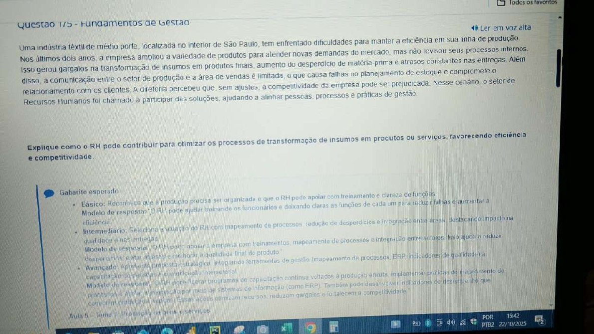 Todos os favoritos 1/5 Gestao Ler em voz alta Uma indústria de médio porte, localizada no interior de São Paulo, tem enfrentado dificuldades para manter a eficiência em sua linha de produção. Nos últimos dois anos, a empresa ampliou a variedade de produtos para atender novas demandas do mercado, mas não revisou seus processos internos. Isso gerou gargalos na transformação de insumos em produtos finais, aumento do de matéria-prima e atrasos constantes nas Além a comunicação entre setor de produção e a de vendas é limitada, 0 que causa falhas no planejamento de estoque e compromete 0 relacionamento com os clientes. A diretoria percebeu que, sem ajustes, a competitividade da empresa pode ser prejudicada. Nesse cenário, setor de Recursos Humanos foi chamado a participar das soluções, ajudando a alinhar processos e práticas de gestão. Explique como RH pode contribuir para otimizar os processos de transformação de insumos em produtos ou serviços, favorecendo eficiência e competitividade. Gabarito esperado Básico: Reconhece que a produção precise ser organizada e que 0 RH pode com treinamento e clareza de funções Modelo de resposta: RH pode ajudar treinando 05 funcionários e deixando claras as funções de cada um para reduzir falhas e aumentar a Intermediário: Relaciona a atuação do RH com mapeamento de redução de desperdicios e integração entre áreas destacando impacto na qualidade e entregas Modelo de resposta: RH pode empresa com mapeamento de processos integração entre Isso ajuda a reduzir atrasos a qualidade final do produto Avançado: proposta integrando ferramentas de gestão (mapeamento de processos, indicadores de qualidade) a capacitação de pessoas comunicação Intersetorial Modelo de resposta: pode programas de capacitação continua voltados à produção enxuta, implementar práticas de mapeamento de procession de sistemas de (como Também pode desenvolver de desempenho que ações opmizam recursos reduzem gargalos e fortalecem competitividade 5 Produção de serviços POR 15:42 PTB2 22/10/2025Questão 3/5 Fundamentos de Gestão Ler em voz alta Uma empresa de tecnologia de médio porte, especializada em soluções digitais para setor de saúde, passou por um crescimento acelerado nos últimos três anos. aumento da carteira de clientes exigiu contratações rápidas, mas a expansão não foi acompanhada por uma revisão da estrutura organizacional. Hoje, a companhia possui cerca de 250 colaboradores, mas não há clareza sobre as linhas de reporte, tampouco definição formal de responsabilidades. Muitos funcionários afirmam não saber quem é responsável final por determinadas decisões, enquanto gestores reclamam de sobrecarga por acumularem funções de liderança e execução. Esse cenário tem gerado retrabalho, conflitos de prioridade e atrasos em entregas. A área de Recursos Humanos, ao perceber que os problemas estavam ligados à ausência de uma estrutura clara, foi acionada pela diretoria para propor soluções que favoreçam a eficiência e 0 alinhamento das equipes. Explique como RH pode atuar para estruturar melhor a organização, favorecendo a e alinhamento das equipes. Gabarito esperado Básico: Identifica a necessidade de organizar cargos e funções para melhorar a clareza e reduzir Modelo de resposta: RH pode ajudar a definir a estrutura da empresa, deixando claro quem se reporta quem quais são as funções de cada colaborador, evitando confusões e Intermediário: Relaciona a importância de um organograma e da definição de para alinhar setores e reduzir falhas de comunicação Modelo de resposta: RH pode propor a criação de um organograma definir cargos e responsabilidades. além de estabelecer canais de comunicação claros entre Isso a hierarquia ajuda cada colaborador a entender seu papel na empresa." Avançado: Apresenta proposta estratégica de estruturação, considerando tipos de estrutura organizacional (funcional, matricial ou em e destaca como a escolha adequada alinha processos metas Modelo de resposta: RH pode mapear a atual estrutura propor ajustes como a implantação de um organograma definição clara de funções e adoção de práticas de comunicação entre da pode recomendar uma estrutura funcional para especialização ou uma matricial para integrar projetos. Essas ações tornam a empresa mais reduzem sobrecarga nos gestores e fortalecem 0 alinhamento estratégico POR 15:43 PTB2 22/10/2025Questão 4/5 Fundamentos de Gestão Ler em voz alta Uma empresa de médio porte do setor varejista está enfrentando queda nas vendas e dificuldades de comunicação entre departamentos A área de Recursos Humanos percebe que as ações de marketing não estão alinhadas com setor de operações e que as decisões financeiras não consideram os impactos no atendimento ao cliente. A diretoria solicitou ao RH uma análise sobre como melhorar a integração entre as áreas para recuperar a competitividade. Analise como a visão de integração entre áreas pode apoiar setor de RH na resolução desse problema. Gabarito esperado Básico: Identifica que a organização é formada por interdependentes e que 0 RH pode contribuir melhorando a comunicação entre setores Modelo de resposta: "A organização um sistema em que todas as áreas estão interligadas 0 RH pode ajudar melhorando a comunicação entre departamentos para que trabalhem juntos 0 cliente seja bem atendido." Reconhece a dos departamentos, explicando que a visão sistêmica ajuda a compreender impactos das decisões em toda a Sugere ações de integração promovidas pelo RH Modelo de resposta: "A visão sistêmica mostra que departamentos não funcionam RH deve criar mecanismos de como reuniões conjuntas entre operações e finanças, para alinhar decisões cada setor entende como suas ações afetam demais è possível recuperar a competitividade Avançado: Apresenta proposta estratégica do RH para integrar áreas, com de comunicação es