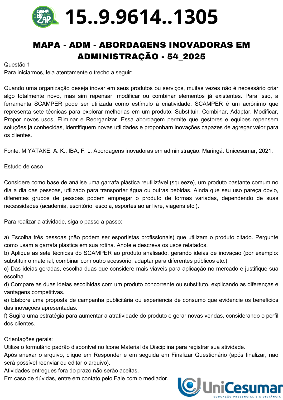 Questão 1 Para iniciarmos, leia atentamente o trecho a seguir: Quando uma organização deseja inovar em seus produtos ou serviços, muitas vezes não é necessário criar algo totalmente novo, mas sim repensar, modificar ou combinar elementos já existentes. Para isso, a ferramenta SCAMPER pode ser utilizada como estímulo à criatividade. SCAMPER é um acrônimo que representa sete técnicas para explorar melhorias em um produto: Substituir, Combinar, Adaptar, Modificar, Propor novos usos, Eliminar e Reorganizar. Essa abordagem permite que gestores e equipes repensem soluções já conhecidas, identifiquem novas utilidades e proponham inovações capazes de agregar valor para os clientes. Fonte: MIYATAKE, A. K.; IBA, F. L. Abordagens inovadoras em administração. Maringá: Unicesumar, 2021. Estudo de caso Considere como base de análise uma garrafa plástica reutilizável (squeeze), um produto bastante comum no dia a dia das pessoas, utilizado para transportar água ou outras bebidas. Ainda que seu uso pareça óbvio, diferentes grupos de pessoas podem empregar o produto de formas variadas, dependendo de suas necessidades (academia, escritório, escola, esportes ao ar livre, viagens etc.). Para realizar a atividade, siga o passo a passo: a) Escolha três pessoas (não podem ser esportistas profissionais) que utilizam o produto citado. Pergunte como usam a garrafa plástica em sua rotina. Anote e descreva os usos relatados. b) Aplique as sete técnicas do SCAMPER ao produto analisado, gerando ideias de inovação (por exemplo: substituir o material, combinar com outro acessório, adaptar para diferentes públicos etc.). c) Das ideias geradas, escolha duas que considere mais viáveis para aplicação no mercado e justifique sua escolha. d) Compare as duas ideias escolhidas com um produto concorrente ou substituto, explicando as diferenças e vantagens competitivas. e) Elabore uma proposta de campanha publicitária ou experiência de consumo que evidencie os benefícios das inovações apresentadas. f) Sugira uma estratégia para aumentar a atratividade do produto e gerar novas vendas, considerando o perfil dos clientes. Orientações gerais: Utilize o formulário padrão disponível no ícone Material da Disciplina para registrar sua atividade. Após anexar o arquivo, clique em Responder e em seguida em Finalizar Questionário (após finalizar, não será possível reenviar ou editar o arquivo). Atividades entregues fora do prazo não serão aceitas. Em caso de dúvidas, entre em contato pelo Fale com o mediador. MAPA - ADM - ABORDAGENS INOVADORAS EM ADMINISTRAÇÃO - 54_2025 15..9.9614..1305 https://www.instagram.com/excellenceeducacional/p/DG1XaOaREOS/ https://www.instagram.com/excellenceeducacional/p/DG1XaOaREOS/