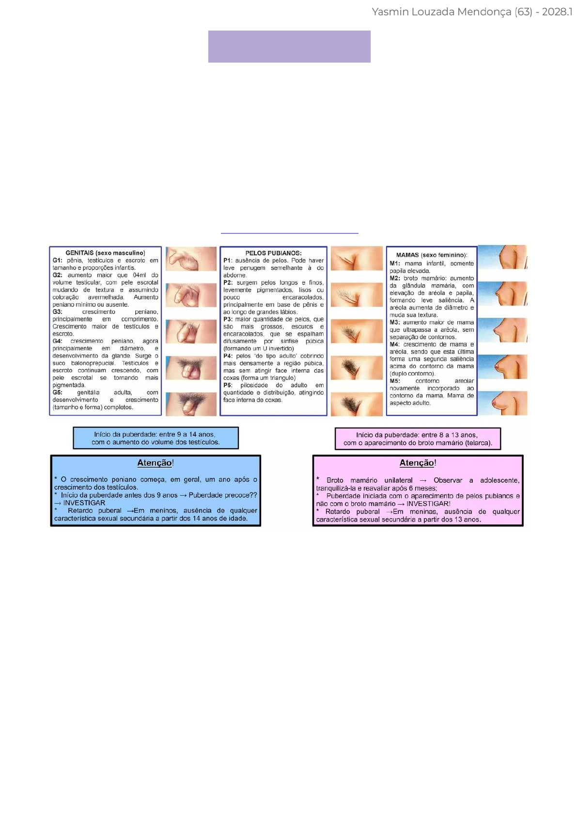 Puberdade precoce. ➔ A puberdade é o período de transição entre a infância e a adolescência, no qual ocorre o desenvolvimento dos caracteres sexuais secundários e a aceleração do crescimento, levando ao início das funções reprodutivas; pubescência. Além disso, há mudanças emocionais, psicológicas e comportamentais. ➔ É resultado do aumento da secreção do GnRH, o qual estimula a secreção dos hormônios luteinizantes (LH) e folículo estimulante (FSH), que, por sua vez, estimularão a secreção dos esteroides sexuais e promoverão a gametogênese. ➔ Telarca > pubarca > menarca CRITÉRIOS DE TANNER: ➔ O processo da puberdade é regulado por uma interação entre genes, hormônios e sinais do sistema nervoso central. Algumas substâncias químicas no cérebro, como melatonina, GABA, e glutamato, desempenham papéis importantes no início da puberdade. ● Melatonina: é um hormônio produzido pela pineal, principalmente à noite, e está envolvido na regulação do ritmo circadiano. Antes da puberdade os níveis de melatonina são geralmente mais altos. Com a aproximação da puberdade há uma redução gradual na produção de melatonina e esse declínio parece ser um dos fatores que "tira o freio" do eixo hipotálamo-hipófise-gônadas, permitindo que ele seja ativado. A melatonina parece inibir a secreção do GnRH, que é o principal hormônio que inicia a cascata da puberdade. ● GABA: é o principal neurotransmissor inibitório do cérebro. Durante a infância, o GABA inibe os neurônios que produzem GnRH, ajudando a manter o eixo reprodutivo "desligado". Com o início da puberdade, há uma redução da ação inibitória do GABA sobre os neurônios GnR, iniciando a liberação de LH e FSH, que atuam nas gônadas. ● Glutamato: é o principal neurotransmissor excitatório do cérebro. O glutamato estimula os neurônios que liberam GnRH, o que ajuda a ativar o eixo hormonal da puberdade. A atividade glutamatérgica aumenta conforme a puberdade se aproxima. ➔ Puberdade precoce é a condição em que os sinais de maturação sexual aparecem mais cedo do que o habitual. Acomete mais a população negra. ● Antes dos 8 anos em meninas ● Antes dos 9 anos em meninos ➔ A puberdade precoce pode ser de dois tipos: puberdade precoce dependente de gonadotrofinas (PPDG) ou central (mais comum) e puberdade precoce independente de gonadotrofinas (PPIG) ou periférica. ● Central (PPC): também chamada de puberdade precoce verdadeira, é dependente do eixo hipotálamo-hipófise-gonadal (HHG), ou seja, ocorre uma ativação precoce do sistema normal de regulação hormonal que controla a puberdade, com padrão semelhante ao da puberdade fisiológica. As principais causas incluem: ○ Idiopática (80%) ○ Tumores do SNC: hamartomas de hipotálamo, craniofaringiomas, astrocitomas, gliomas, neurofibromas e teratomas ○ Malformações do SNC ○ Infecções do SNC ○ Condições genéticas raras ⇒ Isossexual: o desenvolvimento ocorre de acordo com o sexo biológico. Neurofibromatose tipo 1 (Doença de Von Recklinghausen) A NF1 é uma doença genética autossômica dominante que favorece o aparecimento de tumores no SNC, sendo um dos mais comuns o glioma de vias ópticas (um subtipo de astrocitoma pilocítico). Esses tumores podem se localizar próximo ao hipotálamo, levando a uma ativação precoce do eixo hipotálamo-hipófise-gônadas e, consequentemente, o aparecimento de puberdade precoce central. Clínica: manchas café com leite, neurofibromas, nódulos pequenos escuros na íris dos olhos, alterações ósseas (tamanho aumentado e DMO diminuída), tumores no SNC. ● Periférica (PPP): também chamada de puberdade precoce pseudo puberal ou independente do eixo HHG, ocorre quando há produção de hormônios sexuais sem ativação do eixo hipotálamo-hipófise-gonadal. Ocorre por fontes exógenas (hormônios aplicados ou ingeridos) ou endógenas (tumores ou doenças das glândulas) que produzem estrógenos ou androgênios diretamente. As principais causas incluem: ○ Tumores ovarianos/testiculares: cistos foliculares funcionantes de ovário ○ Tumores adrenais produtores de hormônios (adenomas e adenocarcinomas), hiperplasia adrenal congênita. ○ Hipotireoidismo primário ○ Iatrogenia: uso de cremes, pomadas ou suplementos com hormônios ○ Síndrome de McCune-Albright: doença genética esporádica, causada por uma mutação pós-zigótica no gene GNAS1 → responsável pela proteína Gsα, que participa da transdução de sinal. A mutação leva a uma ativação constitutiva da proteína G → resultando em produção aumentada de AMPc → ativação exagerada de receptores hormonais. Tríade clássica: displasia fibrosa poliostótica, manchas café com leite e disfunção endócrina. ⇒ Heterossexual: características do sexo oposto ao biológico Quadro clínico geral. ➔ Telarca precoce, ACCP (aceleração constitucional do crescimento e CSS), secreção vaginal branca, inodora e assintomática, perda sanguínea discreta e menstruação, alteração no comportamento e labilidade emocional. ➔ Anamnese: sintomas atuais e pregressos, antecedentes de doenças do SNC, exposição a esteroides sexuais exógenos, cefaleia recorrente ou dor abdominal sem causa específica. Cronologia do aparecimento dos eventos puberais e história familiar. ➔ Exame físico: avaliação do CSS, das mamas e pelos, Tanner e Marshall, avaliar o peso e a estatura, envergadura, as curvas de crescimento e a idade estatural. Identificar a presença de manchas café-com-leite na pele e alterações ósseas características da síndrome de McCune Albright. Altura alvo meninas: altura da mãe em cm + (altura do pai em cm -13) / 2 Altura alvo meninos: altura da mãe em cm + (altura do pai em cm +13) / 2 ➔ Confirmação diagnóstica: comprovação da maturação esquelética precoce (IO maior que idade cronológica, com aceleração progressiva) e padrão puberal de secre