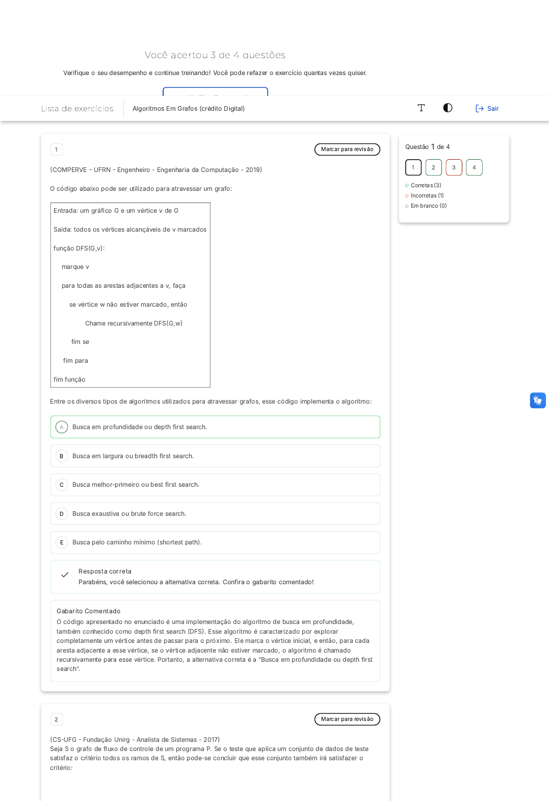 Você acertou 3 de 4 questões Verifique o seu desempenho e continue treinando! Você pode refazer o exercício quantas vezes quiser. Verificar Desempenho A B C D E 1 Marcar para revisão �COMPERVE � UFRN � Engenheiro - Engenharia da Computação - 2019� O código abaixo pode ser utilizado para atravessar um grafo: Entrada: um gráfico G e um vértice v de G Saída: todos os vértices alcançáveis de v marcados função DFS�G,v�� marque v para todas as arestas adjacentes a v, faça se vértice w não estiver marcado, então Chame recursivamente DFS�G,w� fim se fim para fim função Entre os diversos tipos de algoritmos utilizados para atravessar grafos, esse código implementa o algoritmo: Busca em profundidade ou depth first search. Busca em largura ou breadth first search. Busca melhor-primeiro ou best first search. Busca exaustiva ou brute force search. Busca pelo caminho mínimo (shortest path). Resposta correta Parabéns, você selecionou a alternativa correta. Confira o gabarito comentado! Gabarito Comentado O código apresentado no enunciado é uma implementação do algoritmo de busca em profundidade, também conhecido como depth first search �DFS�. Esse algoritmo é caracterizado por explorar completamente um vértice antes de passar para o próximo. Ele marca o vértice inicial, e então, para cada aresta adjacente a esse vértice, se o vértice adjacente não estiver marcado, o algoritmo é chamado recursivamente para esse vértice. Portanto, a alternativa correta é a "Busca em profundidade ou depth first search". 2 Marcar para revisão �CS�UFG � Fundação Unirg - Analista de Sistemas - 2017� Seja S o grafo de fluxo de controle de um programa P. Se o teste que aplica um conjunto de dados de teste satisfaz o critério todos os ramos de S, então pode-se concluir que esse conjunto também irá satisfazer o critério: Questão 1 de 4 Corretas �3� Incorretas �1� Em branco �0� 1 2 3 4 Lista de exercícios Algoritmos Em Grafos (crédito Digital) Sair A B C D E A B C D E A B Todos os caminhos de P. Todas as respostas de P. Todos os comandos de P. Todas as classes de P. Todos os predicados de P. Resposta correta Parabéns, você selecionou a alternativa correta. Confira o gabarito comentado! Gabarito Comentado O critério "todos os ramos" é um critério de cobertura de teste que exige que cada ramo (ou caminho de decisão) em um programa seja executado pelo menos uma vez. Se um conjunto de dados de teste satisfaz este critério, significa que todos os possíveis caminhos de decisão foram testados. Portanto, pode-se concluir que todos os comandos do programa também foram executados, pois cada comando está associado a um ou mais ramos no grafo de fluxo de controle. Assim, a alternativa correta é "Todos os comandos de P". 3 Marcar para revisão �CESPE/CEBRASPE � IFF � Professor - Engenharia da Computação - 2018� Considerando o grafo precedente, assinale a opção correta: Os nós 1 e 4 são adjacentes. O nó 5 é adjacente a si mesmo. Os arcos a1 e a2 são arcos irmãos. Os nós 2 e 3 têm grau 3. O grafo não pode ser classificado como conexo. Resposta incorreta Opa! A alternativa correta é a letra E. Confira o gabarito comentado! Gabarito Comentado Resposta correta: O grafo não pode ser classificado como conexo. 4 Marcar para revisão Na otimização de rotas de entrega, é vital determinar o caminho mais eficiente entre múltiplos pontos. Utilizando grafos, pode-se modelar esta questão para minimizar custos e tempo. Qual algoritmo é preferencialmente utilizado para determinar o caminho mais curto em um grafo representando rotas de entrega? Algoritmo de Floyd-Warshall. Algoritmo de Prim. C D E Busca em Largura. Coloração de grafos. Algoritmo de Dijkstra. Resposta correta Parabéns, você selecionou a alternativa correta. Confira o gabarito comentado! Gabarito Comentado O Algoritmo de Dijkstra é preferencialmente utilizado para determinar o caminho mais curto em um grafo que representa rotas de entrega, pois calcula o caminho de menor custo entre um vértice de origem e todos os outros vértices no grafo, sendo ideal para a otimização de rotas.