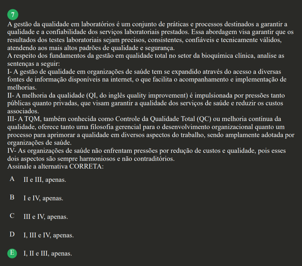 7 A gestão da qualidade em laboratórios é um conjunto de práticas e processos destinados a garantir a qualidade e a confiabilidade dos serviços laboratoriais prestados. Essa abordagem visa garantir que os resultados dos testes laboratoriais sejam precisos, consistentes, confiáveis e tecnicamente válidos, atendendo aos mais altos padrões de qualidade e segurança. A respeito dos fundamentos da gestão em qualidade total no setor da bioquímica clínica, analise as sentenças a seguir: I- A gestão de qualidade em organizações de saúde tem se expandido através do acesso a diversas fontes de informação disponíveis na internet, que facilita acompanhamento e implementação de melhorias. II- A melhoria da qualidade (QI, do inglês quality improvement) é impulsionada por pressões tanto públicas quanto privadas, que visam garantir a qualidade dos serviços de saúde e reduzir os custos associados. III- A TQM, também conhecida como Controle da Qualidade Total (QC) ou melhoria contínua da qualidade, oferece tanto uma filosofia gerencial para desenvolvimento organizacional quanto um processo para aprimorar a qualidade em diversos aspectos do trabalho, sendo amplamente adotada por organizações de saúde. IV- As organizações de saúde não enfrentam pressões por redução de custos e qualidade, pois esses dois aspectos são sempre harmoniosos e não contraditórios. Assinale a alternativa CORRETA: A II e III, apenas. I e IV, apenas. C III e IV, apenas. D I, III e IV, apenas. E I, II e III, apenas.