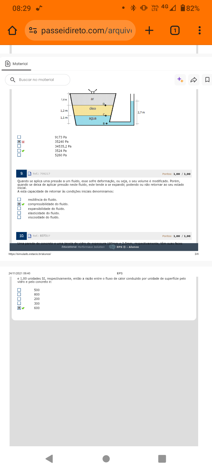 08:29 4G LTE 82% passeidireto.com/arquiv + 1 Material Buscar no material ar Do 2,7 agua 9173 Pa X 35240 Pa 34535,2 Pa 3524 Pa 5260 Pa 9. Ref.: 709217 Pontos: 1,00 / 1,00 Quando se aplica uma pressão a um fluido, esse sofre deformação, ou seja, 0 seu volume modificado. Porem, quando se deixa de aplicar pressão neste fluido, este tende a se expandir, podendo ou não retornar ao seu estado inicial. A esta capacidade de retornar condições iniciais denominamos: resiliência do fluido. compressibilidade do fluido. expansibilidade do fluido. elasticidade do fluido. viscosidade do fluido. 10. Ref.: 837337 Pontos: 1,00 / 1,00 Educational Performace Solution EPS ® Alunos https://simulado estacio br/alunos/ 3/4 24/11/2021 09:40 EPS e 1,00 unidades SI, respectivamente, então a razão entre 0 fluxo de calor conduzido por unidade de superficie pelo vidro e pelo concreto e: 500 800 200 300 600
