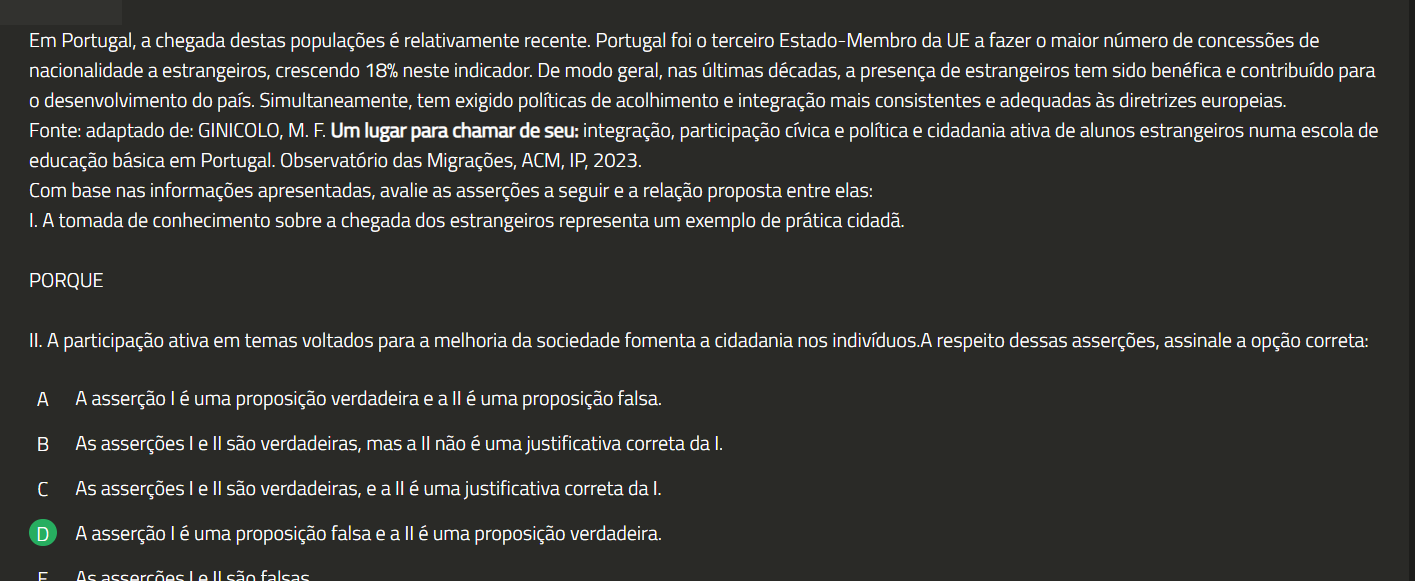 Em Portugal, a chegada destas populações é relativamente recente. Portugal foi 0 terceiro Estado-Membro da UE a fazer 0 maior número de concessões de nacionalidade a estrangeiros, crescendo 18% neste indicador. De modo geral, nas últimas décadas, a presença de estrangeiros tem sido benéfica e contribuído para 0 desenvolvimento do país. Simultaneamente, tem exigido políticas de acolhimento e integração mais consistentes e adequadas às diretrizes europeias. Fonte: adaptado de: GINICOLO, M. F. Um lugar para chamar de seu: integração, participação cívica e política e cidadania ativa de alunos estrangeiros numa escola de educação básica em Portugal. Observatório das Migrações, ACM, IP, 2023. Com base nas informações apresentadas, avalie as asserções a seguir e a relação proposta entre elas: A tomada de conhecimento sobre a chegada dos estrangeiros representa um exemplo de prática cidadã. PORQUE II. A participação ativa em temas voltados para a melhoria da sociedade fomenta a cidadania nos indivíduos.A respeito dessas asserções, assinale a opção correta: A A asserção I é uma proposição verdadeira e a II é uma proposição falsa. B As asserções I e são verdadeiras, mas a II não é uma justificativa correta da I. As asserções e são verdadeiras, e a II é uma justificativa correta da I. D A asserção é uma proposição falsa e a é uma proposição verdadeira. As Le são falsas