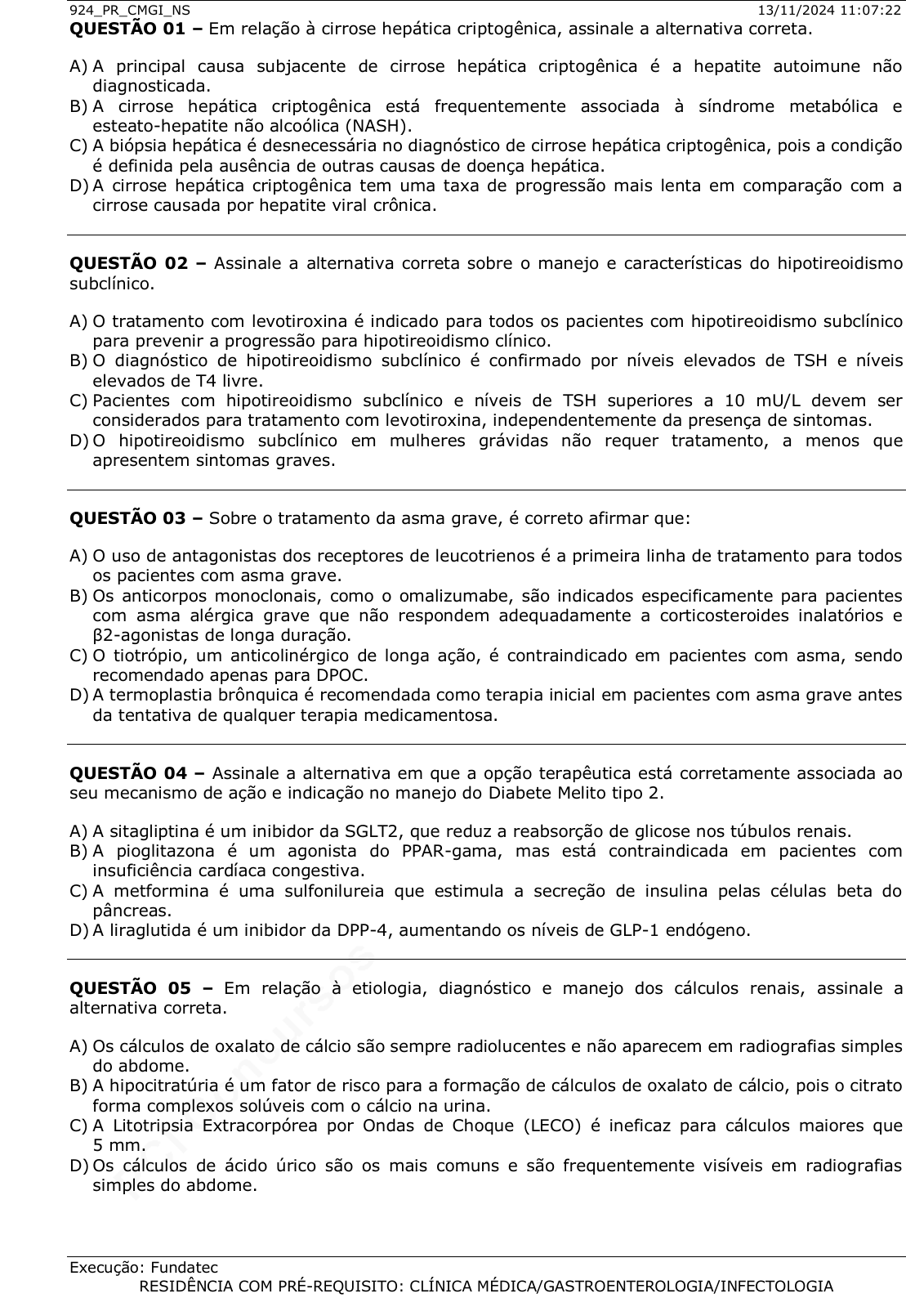 pcimarkpci MjgwNDowMTRjOjAxMDk6OGI0YTo1OWRhOjYyYTQ6NGRkODpjNzgz:U2F0LCAxOCBPY3QgMjAyNSAyMjowMjo1MyAtMDMwMA== www.pciconcursos.com.br 924_PR_CMGI_NS 13/11/2024 11:07:22 Execução: Fundatec RESIDÊNCIA COM PRÉ-REQUISITO: CLÍNICA MÉDICA/GASTROENTEROLOGIA/INFECTOLOGIA QUESTÃO 01 – Em relação à cirrose hepática criptogênica, assinale a alternativa correta. A) A principal causa subjacente de cirrose hepática criptogênica é a hepatite autoimune não diagnosticada. B) A cirrose hepática criptogênica está frequentemente associada à síndrome metabólica e esteato-hepatite não alcoólica (NASH). C) A biópsia hepática é desnecessária no diagnóstico de cirrose hepática criptogênica, pois a condição é definida pela ausência de outras causas de doença hepática. D) A cirrose hepática criptogênica tem uma taxa de progressão mais lenta em comparação com a cirrose causada por hepatite viral crônica. QUESTÃO 02 – Assinale a alternativa correta sobre o manejo e características do hipotireoidismo subclínico. A) O tratamento com levotiroxina é indicado para todos os pacientes com hipotireoidismo subclínico para prevenir a progressão para hipotireoidismo clínico. B) O diagnóstico de hipotireoidismo subclínico é confirmado por níveis elevados de TSH e níveis elevados de T4 livre. C) Pacientes com hipotireoidismo subclínico e níveis de TSH superiores a 10 mU/L devem ser considerados para tratamento com levotiroxina, independentemente da presença de sintomas. D) O hipotireoidismo subclínico em mulheres grávidas não requer tratamento, a menos que apresentem sintomas graves. QUESTÃO 03 – Sobre o tratamento da asma grave, é correto afirmar que: A) O uso de antagonistas dos receptores de leucotrienos é a primeira linha de tratamento para todos os pacientes com asma grave. B) Os anticorpos monoclonais, como o omalizumabe, são indicados especificamente para pacientes com asma alérgica grave que não respondem adequadamente a corticosteroides inalatórios e β2-agonistas de longa duração. C) O tiotrópio, um anticolinérgico de longa ação, é contraindicado em pacientes com asma, sendo recomendado apenas para DPOC. D) A termoplastia brônquica é recomendada como terapia inicial em pacientes com asma grave antes da tentativa de qualquer terapia medicamentosa. QUESTÃO 04 – Assinale a alternativa em que a opção terapêutica está corretamente associada ao seu mecanismo de ação e indicação no manejo do Diabete Melito tipo 2. A) A sitagliptina é um inibidor da SGLT2, que reduz a reabsorção de glicose nos túbulos renais. B) A pioglitazona é um agonista do PPAR-gama, mas está contraindicada em pacientes com insuficiência cardíaca congestiva. C) A metformina é uma sulfonilureia que estimula a secreção de insulina pelas células beta do pâncreas. D) A liraglutida é um inibidor da DPP-4, aumentando os níveis de GLP-1 endógeno. QUESTÃO 05 – Em relação à etiologia, diagnóstico e manejo dos cálculos renais, assinale a alternativa correta. A) Os cálculos de oxalato de cálcio são sempre radiolucentes e não aparecem em radiografias simples do abdome. B) A hipocitratúria é um fator de risco para a formação de cálculos de oxalato de cálcio, pois o citrato forma complexos solúveis com o cálcio na urina. C) A Litotripsia Extracorpórea por Ondas de Choque (LECO) é ineficaz para cálculos maiores que 5 mm. D) Os cálculos de ácido úrico são os mais comuns e são frequentemente visíveis em radiografias simples do abdome. pcimarkpci MjgwNDowMTRjOjAxMDk6OGI0YTo1OWRhOjYyYTQ6NGRkODpjNzgz:U2F0LCAxOCBPY3QgMjAyNSAyMjowMjo1MyAtMDMwMA== www.pciconcursos.com.br 924_PR_CMGI_NS 13/11/2024 11:07:22 Execução: Fundatec RESIDÊNCIA COM PRÉ-REQUISITO: CLÍNICA MÉDICA/GASTROENTEROLOGIA/INFECTOLOGIA QUESTÃO 06 – As Doenças Inflamatórias Intestinais (DII), incluindo a doença de Crohn e a colite ulcerativa, são condições crônicas que afetam o trato gastrointestinal. Em relação à patogênese, manifestações clínicas e tratamento das DII, assinale a alternativa correta. A) A colite ulcerativa pode afetar qualquer parte do trato gastrointestinal, desde a boca até o ânus, e é caracterizada pela presença de granulomas não caseosos. B) A presença de anticorpos anticitoplasma de neutrófilos perinucleares (p-ANCA) é mais comum na doença de Crohn do que na colite ulcerativa. C) O uso de agentes biológicos, como os inibidores do Fator de Necrose Tumoral (TNF), é uma opção terapêutica para pacientes com DII moderada a grave que não respondem ao tratamento convencional. D) A doença de Crohn é limitada ao cólon e é frequentemente associada a megacólon tóxico. QUESTÃO 07 – A febre reumática é uma doença inflamatória que pode se desenvolver após uma infecção estreptocócica da garganta. Em relação à patogênese, critérios diagnósticos e manifestações clínicas da febre reumática, assinale a alternativa correta. A) A cardite reumática pode causar valvulite mitral e aórtica, sendo a regurgitação mitral a lesão valvular mais comum na fase aguda. B) Os nódulos subcutâneos são manifestações clínicas comuns e persistentes da febre reumática, frequentemente presentes durante todo o curso da doença. C) A profilaxia secundária com penicilina deve ser mantida por 5 anos após o primeiro episódio de febre reumática, independentemente da presença de cardite. D) A presença de Proteína C-Reativa (PCR) elevada é suficiente para diagnosticar febre reumática sem a necessidade de outros critérios diagnósticos. QUESTÃO 08 – A síncope é uma perda súbita e transitória de consciência devido à diminuição do fluxo sanguíneo cerebral. Em relação à investigação diagnóstica da síncope, assinale a alternativa correta. A) A monitorização contínua do Eletroencefalograma (EEG) é essencial em todos os pacientes com síncope para descartar causas neurológicas. B) O teste de inclinação (