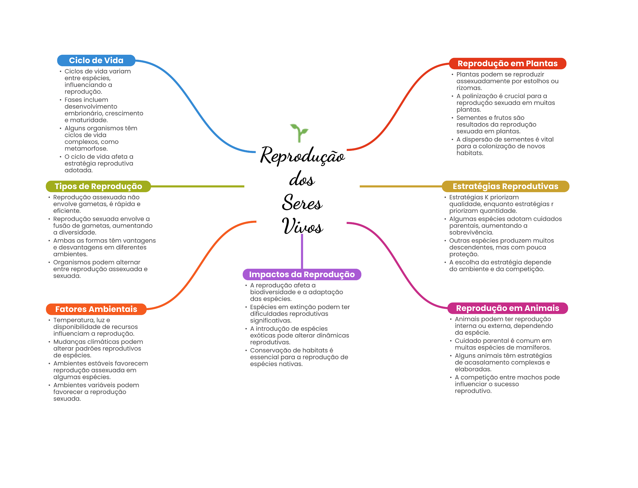 Ciclo de Vida Reprodução em Plantas Ciclos de vida variam entre espécies, Plantas podem se reproduzir influenciando a por estolhos ou rizomas. reprodução. incluem A crucial para a reprodução sexuada em multas crescimento maturidade. Sementes . frutos são Alguns organismos têm resultados da reprodução ciclos de vida em plantas. complexes, como A de sementes vital para a colonização de novos de vida afeta a estratégia reprodutiva adotada. Tipos de Reprodução Estratégias Reprodutivas Reprodução assexuada não K priorizam envolve gametas, é qualidade, enquanto r eficiente. priortzam Reprodução a Algumas espécies adotam fusão de gametas, a a diversidade. sobrevivência. Ambas formas têm Outras espécies produzem multos em diferentes descendentes, mas com pouca ambientes. proteção. podem alternor A escolha da estratégia depende entre reprodução do ambiente da competição. Impactos da Reprodução A reprodução afeta a biodiversidade a adaptação espécies. Fatores Ambientais em extinção podem ter Reprodução em Animais reprodutivas Temperatura, luz significativas. Animals podem ter reprodução disponibilidade de recursos A introdução de espécies ou externa, dependendo influenciam a reprodução. pode da espécie. Mudanças climáticas podem Cuidado parental comum em alterar reprodutivos Conservação de habitate espêcies de de essencial para a reprodução de animale têm Ambientes espécies de acasalamento . reprodução assexuada em algumas espécies. A competição entre machos pode Ambientes podem influenciar favorecer a reprodução reprodutivo. sexuada.