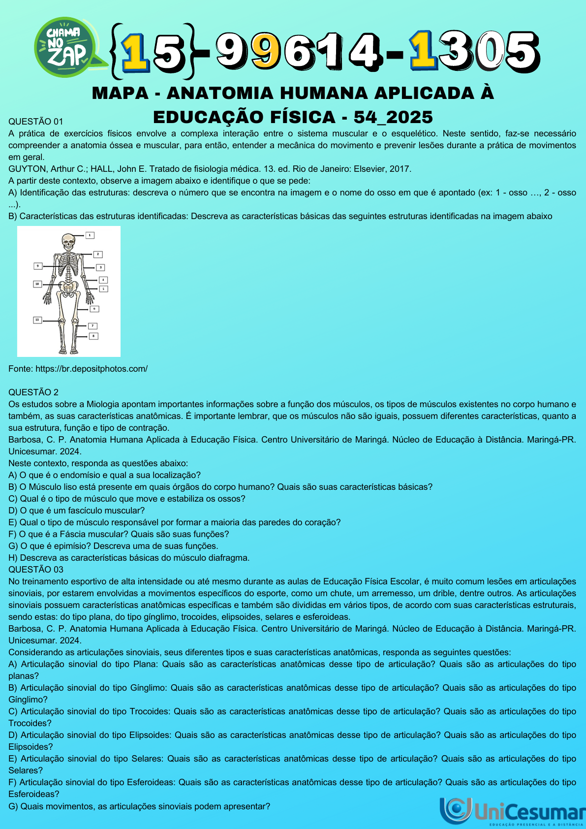 QUESTÃO 01 A prática de exercícios físicos envolve a complexa interação entre o sistema muscular e o esquelético. Neste sentido, faz-se necessário compreender a anatomia óssea e muscular, para então, entender a mecânica do movimento e prevenir lesões durante a prática de movimentos em geral. GUYTON, Arthur C.; HALL, John E. Tratado de fisiologia médica. 13. ed. Rio de Janeiro: Elsevier, 2017. A partir deste contexto, observe a imagem abaixo e identifique o que se pede: A) Identificação das estruturas: descreva o número que se encontra na imagem e o nome do osso em que é apontado (ex: 1 - osso …, 2 - osso ...). B) Características das estruturas identificadas: Descreva as características básicas das seguintes estruturas identificadas na imagem abaixo MAPA - ANATOMIA HUMANA APLICADA À EDUCAÇÃO FÍSICA - 54_2025 - - Fonte: https://br.depositphotos.com/ QUESTÃO 2 Os estudos sobre a Miologia apontam importantes informações sobre a função dos músculos, os tipos de músculos existentes no corpo humano e também, as suas características anatômicas. É importante lembrar, que os músculos não são iguais, possuem diferentes características, quanto a sua estrutura, função e tipo de contração. Barbosa, C. P. Anatomia Humana Aplicada à Educação Física. Centro Universitário de Maringá. Núcleo de Educação à Distância. Maringá-PR. Unicesumar. 2024. Neste contexto, responda as questões abaixo: A) O que é o endomísio e qual a sua localização? B) O Músculo liso está presente em quais órgãos do corpo humano? Quais são suas características básicas? C) Qual é o tipo de músculo que move e estabiliza os ossos? D) O que é um fascículo muscular? E) Qual o tipo de músculo responsável por formar a maioria das paredes do coração? F) O que é a Fáscia muscular? Quais são suas funções? G) O que é epimísio? Descreva uma de suas funções. H) Descreva as características básicas do músculo diafragma. QUESTÃO 03 No treinamento esportivo de alta intensidade ou até mesmo durante as aulas de Educação Física Escolar, é muito comum lesões em articulações sinoviais, por estarem envolvidas a movimentos específicos do esporte, como um chute, um arremesso, um drible, dentre outros. As articulações sinoviais possuem características anatômicas específicas e também são divididas em vários tipos, de acordo com suas características estruturais, sendo estas: do tipo plana, do tipo gínglimo, trocoides, elipsoides, selares e esferoideas. Barbosa, C. P. Anatomia Humana Aplicada à Educação Física. Centro Universitário de Maringá. Núcleo de Educação à Distância. Maringá-PR. Unicesumar. 2024. Considerando as articulações sinoviais, seus diferentes tipos e suas características anatômicas, responda as seguintes questões: A) Articulação sinovial do tipo Plana: Quais são as características anatômicas desse tipo de articulação? Quais são as articulações do tipo planas? B) Articulação sinovial do tipo Gínglimo: Quais são as características anatômicas desse tipo de articulação? Quais são as articulações do tipo Gínglimo? C) Articulação sinovial do tipo Trocoides: Quais são as características anatômicas desse tipo de articulação? Quais são as articulações do tipo Trocoides? D) Articulação sinovial do tipo Elipsoides: Quais são as características anatômicas desse tipo de articulação? Quais são as articulações do tipo Elipsoides? E) Articulação sinovial do tipo Selares: Quais são as características anatômicas desse tipo de articulação? Quais são as articulações do tipo Selares? F) Articulação sinovial do tipo Esferoideas: Quais são as características anatômicas desse tipo de articulação? Quais são as articulações do tipo Esferoideas? G) Quais movimentos, as articulações sinoviais podem apresentar? https://www.instagram.com/excellenceeducacional/p/DG1XaOaREOS/ https://www.instagram.com/excellenceeducacional/p/DG1XaOaREOS/