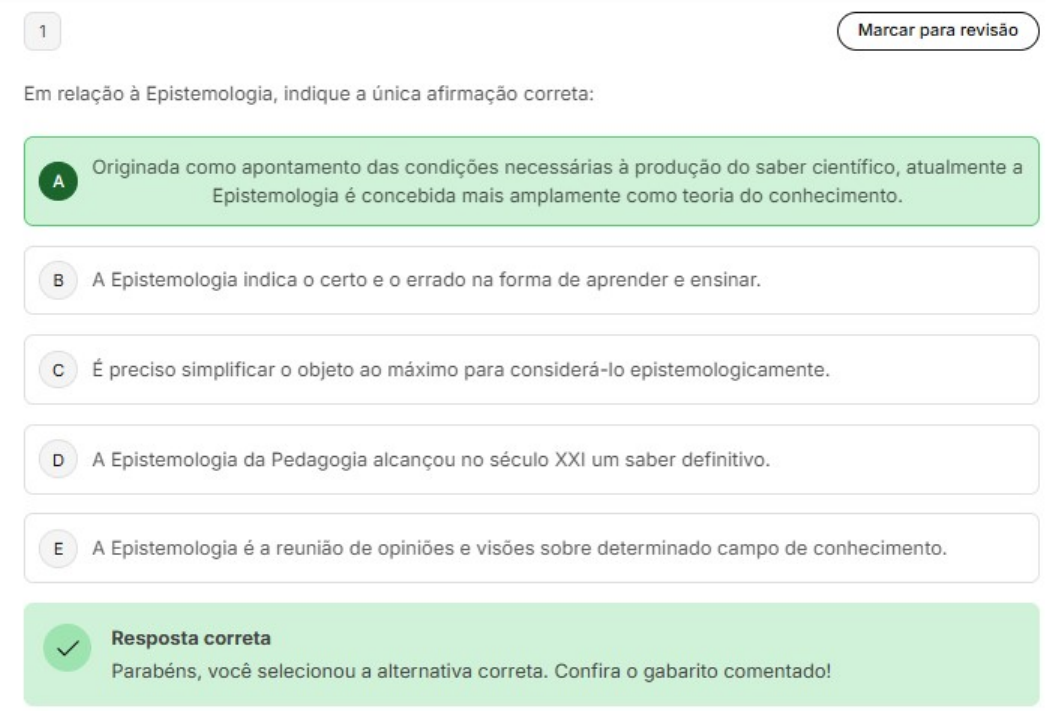 1 Marcar para revisão Em relação à Epistemologia, indique a única afirmação correta: Originada como apontamento das condições necessárias à produção do saber científico, atualmente a A Epistemologia é concebida mais amplamente como teoria do conhecimento. A Epistemologia indica o certo e errado na forma de aprender e ensinar. C É preciso simplificar objeto ao máximo para considerá-lo D A Epistemologia da Pedagogia alcançou no século XXI um saber definitivo. E A Epistemologia é a reunião de opiniões e visões sobre determinado campo de conhecimento. Resposta correta Parabéns, você selecionou a alternativa correta. Confira gabarito comentado!