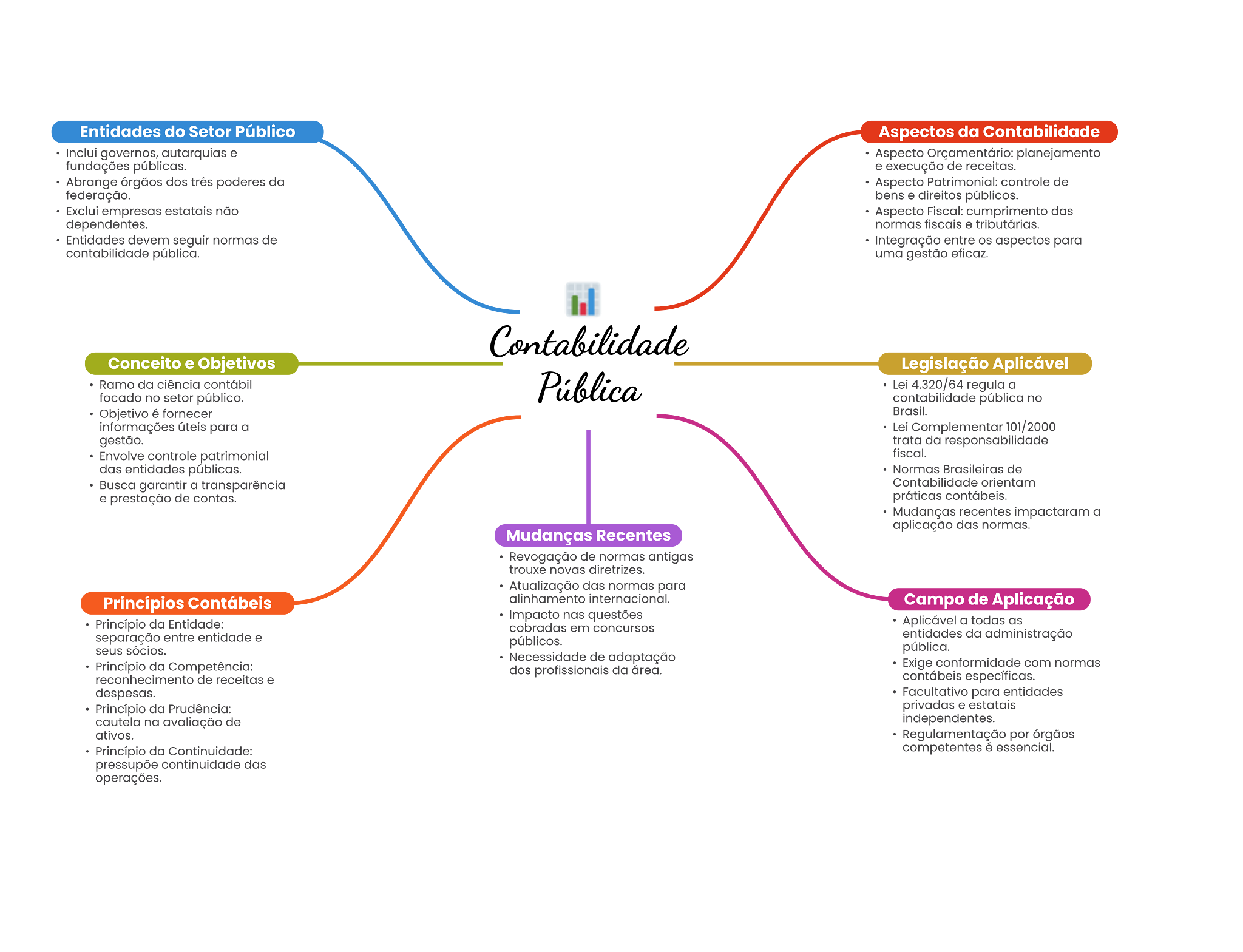 Entidades do Setor Público Aspectos da Contabilidade Inclui governos, autarquias Aspecto fundações públicas. de receitas. Abrange dos poderes da Aspecto Patrimoniat: controle de federação. públicos. empresas não Aspecto cumprimento das dependentes. . Entidades devem seguir normas de entre aspectos para uma gestão Conceito e Objetivos Legislação Aplicável Ramo da Lei 4.320/64 regula a focado no público. contabilidade pública no Objetivo é fornecer Informações para a Lei 101/2000 gestão. trata da responsabilidade Envolve controle patrimonial fiscal. das entidades públicas. Normas de Busca garantir a transparência Contabilidade orientam . prestação de contas. recentes impactaram a aplicação das normas. Mudanças Recentes Revogação de normas antigos trouxe novas diretrizes. Atualização dos normas para Princípios Contábeis internacional. Campo de Aplicação questões da Entidade: em concursos Aplicável a todas as separação entre entidade entidades da administração sócios. pública. Necessidade de adaptação da dos da Exige conformidade com normas reconhecimento de Facultativo para entidades da Prudência: privadas cautela na de ativos. Regulamentação por órgãos da competentes essencial. continuidade das operações.