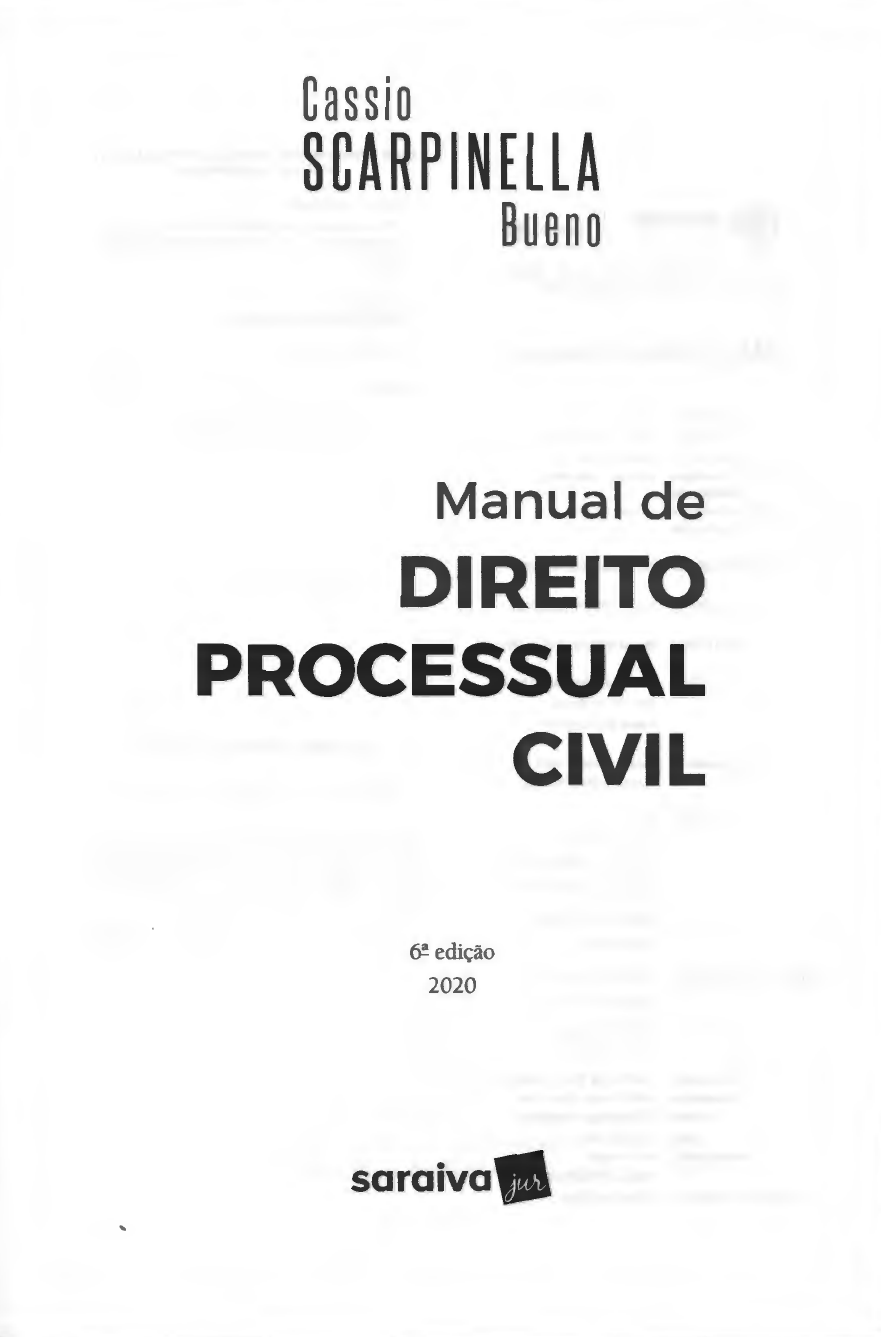 ~e Direito da Pontifícia ai obteve os títulos de Processual Civil, todos r de Direito Processual ·ado. Visiting Scholar da )1. 1 (IBDP) e membro do :iação Internacional de 1rojeto do novo Código de Trabalho de Juristas )resente Manual, todos 'D processual civil (em 3 rios ao Código de Proces tença; (3); e (4) Projetos lera! (PLS n. 166/2010) inação dos Comentários ais de 90 artigos cientí- nacional, como pales variados encontros de Cassio SCARPINELLA Bueno Manual d'e DIREITO PROCESSUAL ~ edição 2020 CIVIL saraiva. STJ00109496 • ~~ur~i~~ soroiva9 Av. Doutora Ruth Cardoso, 7.221, 1~ andar, Setor B Pinheiros - São Paulo - SP - CEP 05425-902 SA( 1 sac.sets@somoseducacao.com.br Direção executiva Flávia Alves Bravin Direção editorial Renata Pascual Müller Gerência editorial Roberto Navarro Gerência de produção Ana Paula Santos Matos e planejamento Gertncia de projetos e Fernando Penteado serviços editoriais Consultoria acadêmica Murilo Angeli Dias dos Santos Planejamento Clarissa Boraschi Maria (coord.) Novos projetos Melissa Rodriguez Amai da Silva Leite Edição Eveline Gonçalves Denardi (coord.) Daniel Pavani Naveira Estevao Bula Gonçalves Produção edltorlal Fernanda Matajs (coord.) Luciana Cordeiro Shirakawa Arte e digital Mõnica Landi (coord.) Amanda Mota Loyola Camilla Felix Cianelli Chaves Claudirene de Moura Santos Silva Deborah Mattos Guilherme H. M. Salvador Tiago Dela Rosa Projetos e serviços editoriais Juliana Bojczuk Fermino Kelli Priscila Pinto Mania Cordeiro Mõnica Gonçalves Dias Projeto gráfico Claudirene de Moura Santos Silva Diagramação SBNigri Artes e Textos Ltda. Revisão C&C Criações e Textos Ltda. Capa Tiago Dela Rosa Produção grãlica Marli Rampim Sergio Luiz Pereira Lopes Impressão e acabamento Gráfica Santa Marta DADOS INTERNACIONAIS DE CATALOGAÇÃO NA PUBLICAÇÃO (CIP) ANGÉLICA ILACQUA CRB-8/7057 Bueno, Cassio Scarpinella Manual de direito processual civil - volume único/ Cassio Scarpinella Bueno. - 6. ed. - São Paulo : Saraiva Educaçao, 2020. 952 p. Bibliografia ISBN 978-85-536-1477-6 (impresso) 1. Processo civil 1. Tltulo. 20-0158 jndice para catálogo sistemático: 1. Direito processual civil coo 340 347.9 Data de fechamento da edição: 11-12-2019 Dúvidas? Acesse www.editorasaraiva.com.br/direito Nenhuma parte desta publicação poderá ser reproduzida por qualquer meio ou forma sem a prévia autorização da Saraiva Educação. A violação dos direitos autorais é crime estabelecido na Lei n. 9.610/98 e punido pelo art. 184 do Código Penal. CL j 606190 1 CAE 1 716972 1 STJ00109496 leiro (Decreto-lei n. 4 .657, n de dezembro de 1973) o leral justiça trito Federal e Territórios strito Federal e Territórios ~ Abreviaturas e siglas ....... ............... .......... .............. ... .......... .............. .................. .. . Prólogo ................. .......... .. ..... ...... ........... ... .... .......... .. .. .. .. .... ... .. .... ... ... ........ ... ... ... . Nota à 6« edição ................ ...... ............................ ........ ...... .... .. ... ...... ... ... ... ... ........ . Nota à 5« edição ..................... ...... ..... ... ... ........ .... .. .... .. ...... ...... ... .. .. ........... ..... ... .. . . Nota à~ edição .. ....... ....... .... .... ...... ....... ... .... .. .. ... .... ..... ..................... .............. .... . Nota à J« edição .............................. .... ... ..... .............................. ................ ........... . 9 33 37 39 41 43 Nota prévia à 2« edição. .... ... .. ... ... .. ........................................................................ 46 Capítulo 1 Considerações Propedêuticas ............................................................................ ......... 49 1. O objeto do direito processual civil ou o que estuda o direito processual civil? . . 49 2. O modelo constitucional do direito processual civil . . . . . . . . . . . . . . . . . . . . . . . . . . . . . . . . . . . . . 51 2.1 Princípios constitucionais do direito processual civil.. ... .. ....... .... .. .. ... . . 53 2.1.1 Acesso à justiça............................................ ........... .. ............. .. 54 2.1.2 Devido processo legal (devido processo constitucional)........... 55 2.1.3 Contraditório (cooperação) ...... ... ...... ..... ... ....... ... .. ... ...... .. ... .... 56 2.1.4 Ampla defesa ....... .. .... ... ... ................... .. ... .... ............................ 57 2.1.5 Juiz natural. ......... .. ....... ..... ... ..... ......... ... ....... ........................... 58 2.1.6 Imparcialidade ..... ................ ...... ... ... ... ... ......... .................. ... .... 58 2.1.7 Duplo grau de jurisdição ..... ... ...... ... ........................................ 59 2.1.8 Colegialidade nos Tribunais ...... ... ...... ........ .... .. .. ........ .... .. ..... ... 60 2.1.9 Reserva do Plenário para declarar a inconstitucionalidade de lei ou ato normativo .. ........ ... .......... ... .. ... .. ..... .... .......... .. ............... 60 2.1.10 Isonomia .............................. .................................................. . 61 61 62 2.1.11 Publicidade ......... ..... ........... .. .... ............... ... ...................... ..... . 2.1.12 Motivação ..................................................................... .......... . 2.1.13 Vedação das provas ilícitas ou obtidas por meios ilícitos. ......... 63 2.1.14 Assistência jurídica integral e gratuita ...................................... 63 2.1.15 Duração razoável do processo (eficiência processual) ... ... ..... .... 64 2.1.16 Efetividade do processo (efetividade do direito pelo e no processo). 65 11 STJ00109496 2.1.17 Princípios-síntese ...... ....... ........................... ... .. ... ..... .... ... ........ 65 2.2 Organização judiciária ..................... ............ .. .. .. ....... .
