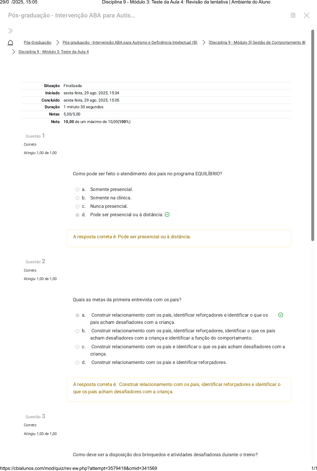 Pós-Graduação Pós-graduação - Intervenção ABA para Autismo e Deficiência Intelectual (B) [Disciplina 9 - Módulo 3] Gestão de Comportamento III Disciplina 9 - Módulo 3: Teste da Aula 4 Questão 1 Correto Atingiu 1,00 de 1,00 Questão 2 Correto Atingiu 1,00 de 1,00 Questão 3 Correto Atingiu 1,00 de 1,00 Como pode ser feito o atendimento dos pais no programa EQUILÍBRIO? a. Somente presencial. b. Somente na clínica. c. Nunca presencial. d. Pode ser presencial ou à distância. A resposta correta é: Pode ser presencial ou à distância. Quais as metas da primeira entrevista com os pais? a. Construir relacionamento com os pais, identificar reforçadores e identificar o que os pais acham desafiadores com a criança. b. Construir relacionamento com os pais, identificar reforçadores, identificar o que os pais acham desafiadores com a criança e identificar a função do comportamento. c. Construir relacionamento com os pais e identificar o que os pais acham desafiadores com a criança. d. Construir relacionamento com os pais e identificar reforçadores. A resposta correta é: Construir relacionamento com os pais, identificar reforçadores e identificar o que os pais acham desafiadores com a criança. Como deve ser a disposição dos brinquedos e atividades desafiadoras durante o treino? Situação Finalizada Iniciado sexta-feira, 29 ago. 2025, 15:04 Concluído sexta-feira, 29 ago. 2025, 15:05 Duração 1 minuto 30 segundos Notas 5,00/5,00 Nota 10,00 de um máximo de 10,00(100%) Pós-graduação - Intervenção ABA para Autis… 29/08/2025, 15:05 Disciplina 9 - Módulo 3: Teste da Aula 4: Revisão da tentativa | Ambiente do Aluno https://cbialunos.com/mod/quiz/review.php?attempt=3579418&cmid=341569 1/1 https://cbialunos.com/course/index.php?categoryid=7 https://cbialunos.com/course/view.php?id=488 https://cbialunos.com/course/section.php?id=15260 https://cbialunos.com/mod/quiz/view.php?id=341569 https://cbialunos.com/my/courses.php https://cbialunos.com/course/view.php?id=488 https://cbialunos.com/course/view.php?id=488&mb2sct=34