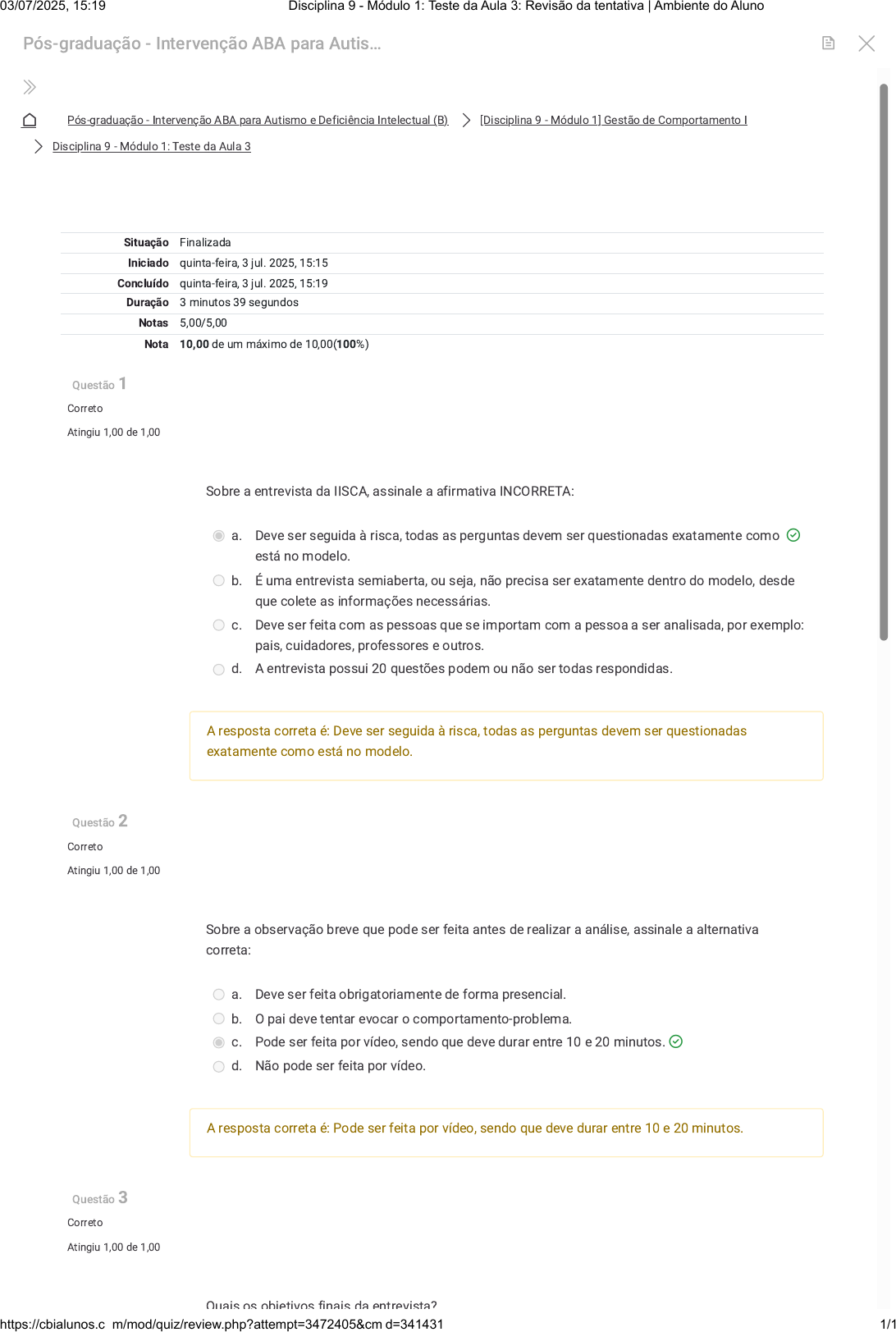 Pós-graduação - Intervenção ABA para Autismo e Deficiência Intelectual (B) [Disciplina 9 - Módulo 1] Gestão de Comportamento I Disciplina 9 - Módulo 1: Teste da Aula 3 Questão 1 Correto Atingiu 1,00 de 1,00 Questão 2 Correto Atingiu 1,00 de 1,00 Questão 3 Correto Atingiu 1,00 de 1,00 Sobre a entrevista da IISCA, assinale a afirmativa INCORRETA: a. Deve ser seguida à risca, todas as perguntas devem ser questionadas exatamente como está no modelo. b. É uma entrevista semiaberta, ou seja, não precisa ser exatamente dentro do modelo, desde que colete as informações necessárias. c. Deve ser feita com as pessoas que se importam com a pessoa a ser analisada, por exemplo: pais, cuidadores, professores e outros. d. A entrevista possui 20 questões podem ou não ser todas respondidas. A resposta correta é: Deve ser seguida à risca, todas as perguntas devem ser questionadas exatamente como está no modelo. Sobre a observação breve que pode ser feita antes de realizar a análise, assinale a alternativa correta: a. Deve ser feita obrigatoriamente de forma presencial. b. O pai deve tentar evocar o comportamento-problema. c. Pode ser feita por vídeo, sendo que deve durar entre 10 e 20 minutos. d. Não pode ser feita por vídeo. A resposta correta é: Pode ser feita por vídeo, sendo que deve durar entre 10 e 20 minutos. Quais os objetivos finais da entrevista? Situação Finalizada Iniciado quinta-feira, 3 jul. 2025, 15:15 Concluído quinta-feira, 3 jul. 2025, 15:19 Duração 3 minutos 39 segundos Notas 5,00/5,00 Nota 10,00 de um máximo de 10,00(100%) Pós-graduação - Intervenção ABA para Autis… 03/07/2025, 15:19 Disciplina 9 - Módulo 1: Teste da Aula 3: Revisão da tentativa | Ambiente do Aluno https://cbialunos.com/mod/quiz/review.php?attempt=3472405&cmid=341431 1/1 https://cbialunos.com/course/view.php?id=488 https://cbialunos.com/course/section.php?id=15258 https://cbialunos.com/mod/quiz/view.php?id=341431 https://cbialunos.com/my/courses.php https://cbialunos.com/course/view.php?id=488 https://cbialunos.com/course/view.php?id=488&mb2sct=32