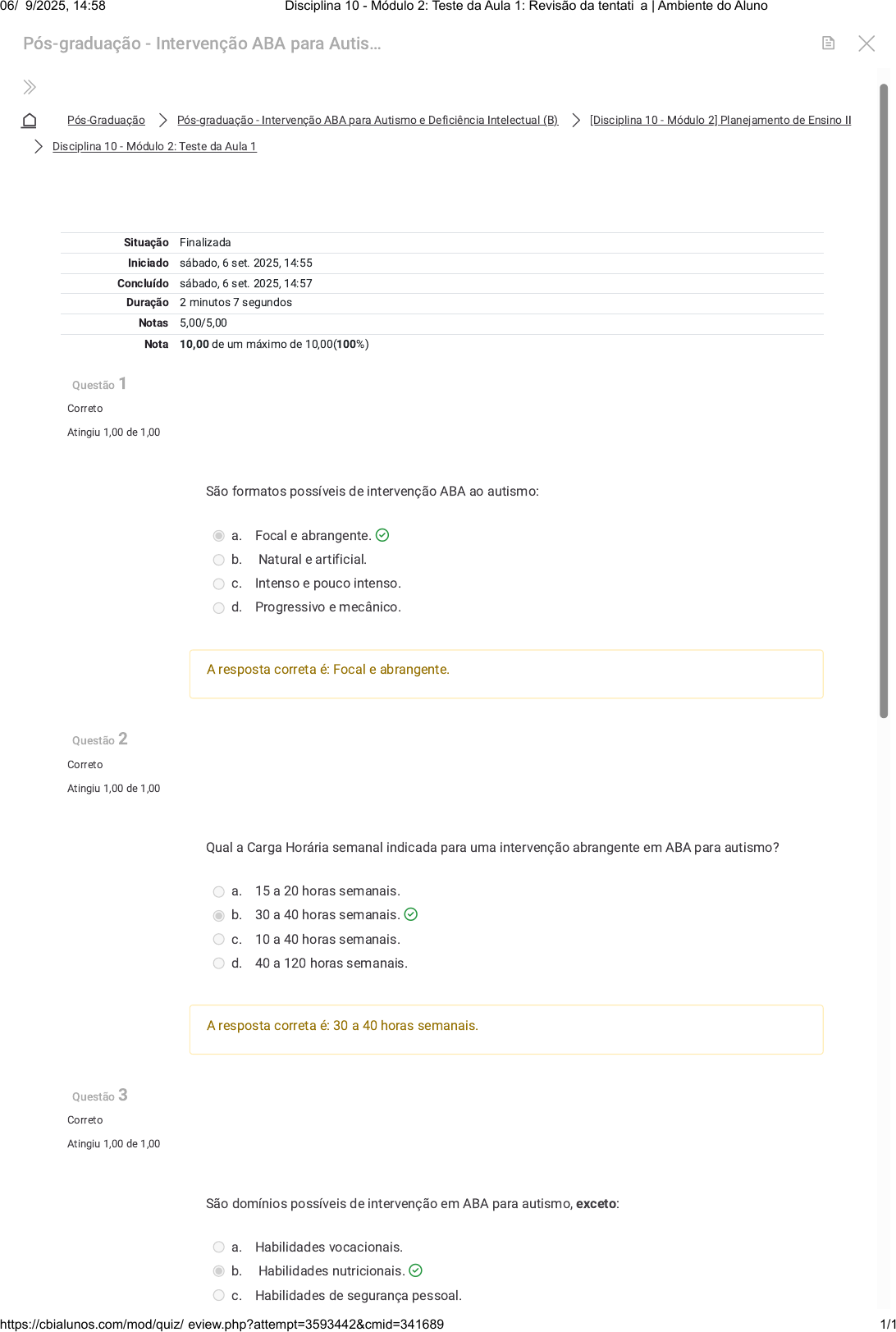 Pós-Graduação Pós-graduação - Intervenção ABA para Autismo e Deficiência Intelectual (B) [Disciplina 10 - Módulo 2] Planejamento de Ensino II Disciplina 10 - Módulo 2: Teste da Aula 1 Questão 1 Correto Atingiu 1,00 de 1,00 Questão 2 Correto Atingiu 1,00 de 1,00 Questão 3 Correto Atingiu 1,00 de 1,00 São formatos possíveis de intervenção ABA ao autismo: a. Focal e abrangente. b. Natural e artificial. c. Intenso e pouco intenso. d. Progressivo e mecânico. A resposta correta é: Focal e abrangente. Qual a Carga Horária semanal indicada para uma intervenção abrangente em ABA para autismo? a. 15 a 20 horas semanais. b. 30 a 40 horas semanais. c. 10 a 40 horas semanais. d. 40 a 120 horas semanais. A resposta correta é: 30 a 40 horas semanais. São domínios possíveis de intervenção em ABA para autismo, exceto: a. Habilidades vocacionais. b. Habilidades nutricionais. c. Habilidades de segurança pessoal. Situação Finalizada Iniciado sábado, 6 set. 2025, 14:55 Concluído sábado, 6 set. 2025, 14:57 Duração 2 minutos 7 segundos Notas 5,00/5,00 Nota 10,00 de um máximo de 10,00(100%) Pós-graduação - Intervenção ABA para Autis… 06/09/2025, 14:58 Disciplina 10 - Módulo 2: Teste da Aula 1: Revisão da tentativa | Ambiente do Aluno https://cbialunos.com/mod/quiz/review.php?attempt=3593442&cmid=341689 1/1 https://cbialunos.com/course/index.php?categoryid=7 https://cbialunos.com/course/view.php?id=488 https://cbialunos.com/course/section.php?id=15263 https://cbialunos.com/mod/quiz/view.php?id=341689 https://cbialunos.com/my/courses.php https://cbialunos.com/course/view.php?id=488 https://cbialunos.com/course/view.php?id=488&mb2sct=37