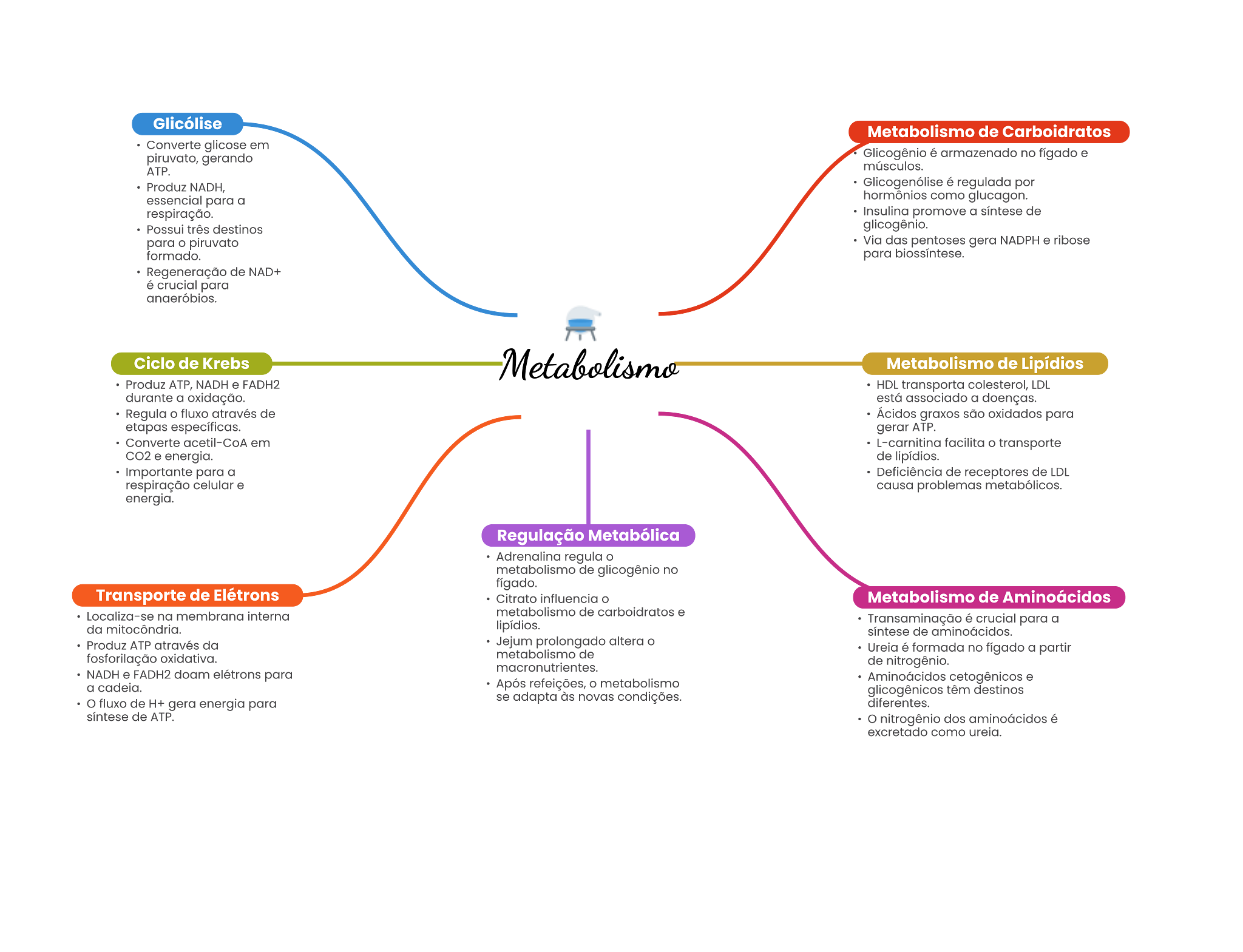 Glicólise Metabolismo de Carboidratos Converte glicose em piruvato, gerando é no figado ATP. músculos. NADH, é regulada por essencial para a como glucagon. respiração. promove a de Possul destinos glicogênio. para piruvato Via das pentoses gera NADPH ribose formado. para Regeneração de NAD+ crucial para Ciclo de Krebs Metabolismo de Lipídios Produz ATP, NADH e FADH2 HDL transporta colesterol, LDL durante a está associado a Regula fluxo de Ácidos para etapas gerar ATP. Converte em facilita transporte CO2 energia. de lipídios. para a Deficiência de receptores de LDL respiração causa problemas metabólicos. energia. Regulação Metabólica - Adrenalina regula de glicogênio no Transporte de Elétrons Citrato influencia Metabolismo de Aminoácidos Localiza-se na membrana interna de da mitocôndria. lipídios. Transaminação crucial para a sintese de Produz ATP através da Jejurn prolongado o de Ureia é formada no a partir macronutrientes. de nitrogênio. NADH . FADH2 doam elétrons para refeições, a fluxo de H+ gera energia para condições. glicogênicos têm destinos diferentes. de ATP. nitrogênio dos excretado como ureia.
