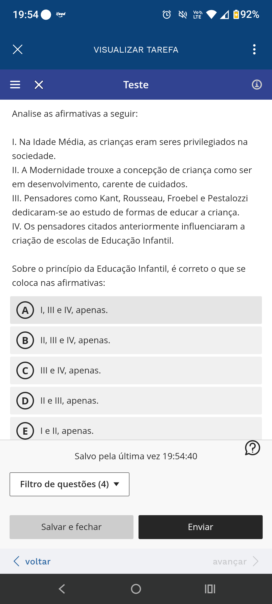 19:54 ifood Von LTE 92% X VISUALIZAR TAREFA III X Teste i Analise as afirmativas a seguir: I. Na Idade Média, as crianças eram seres privilegiados na sociedade. II. A Modernidade trouxe a concepção de criança como ser em desenvolvimento, carente de cuidados. III. Pensadores como Kant, Rousseau, Froebel e Pestalozzi dedicaram-se ao estudo de formas de educar a criança. IV. Os pensadores citados anteriormente influenciaram a criação de escolas de Educação Infantil. Sobre princípio da Educação Infantil, é correto 0 que se coloca nas afirmativas: A I, III e IV, apenas. II, e IV, apenas. c III e IV, apenas. D e III, apenas. E e II, apenas. ? Salvo pela última vez 19:54:40 Filtro de questões (4) Salvar e fechar Enviar voltar avançar
